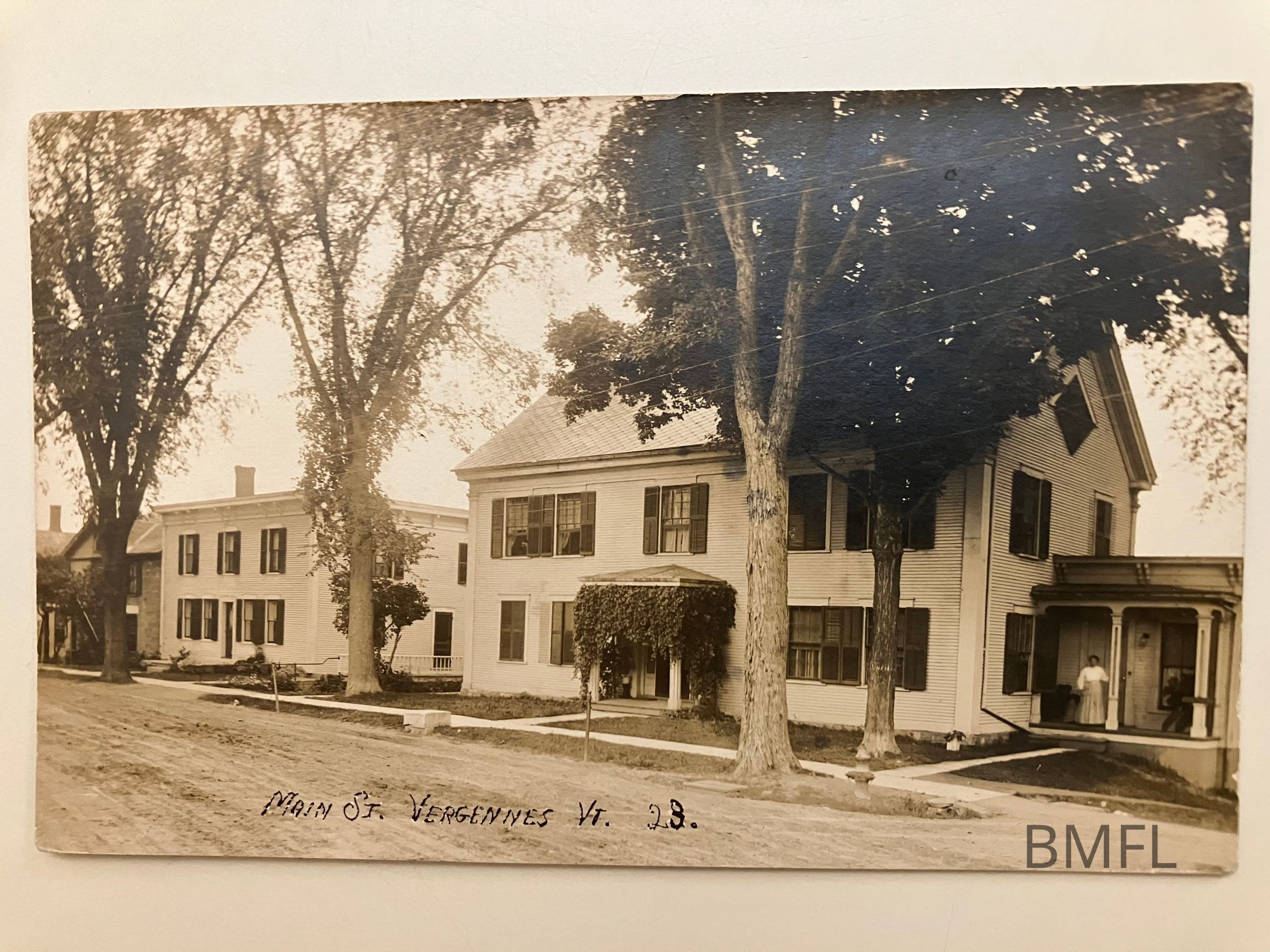 A view of several homes on Main Street in Vergennes. A woman stands on the side porch of the home with the ivy covered front entrance.