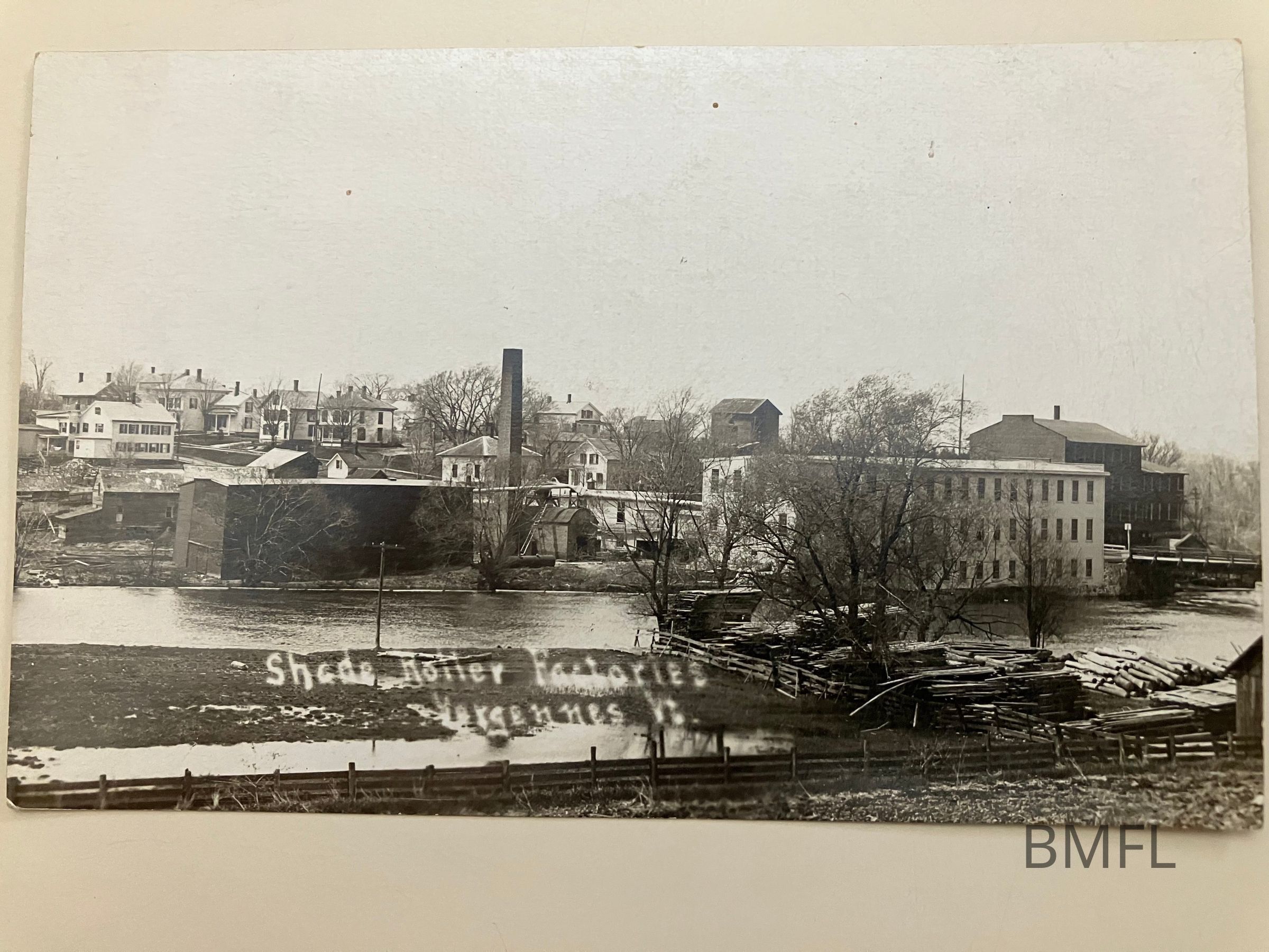 Image shows the Shade Roller factories located at the falls on Otter Creek at Vergennes, Vt.