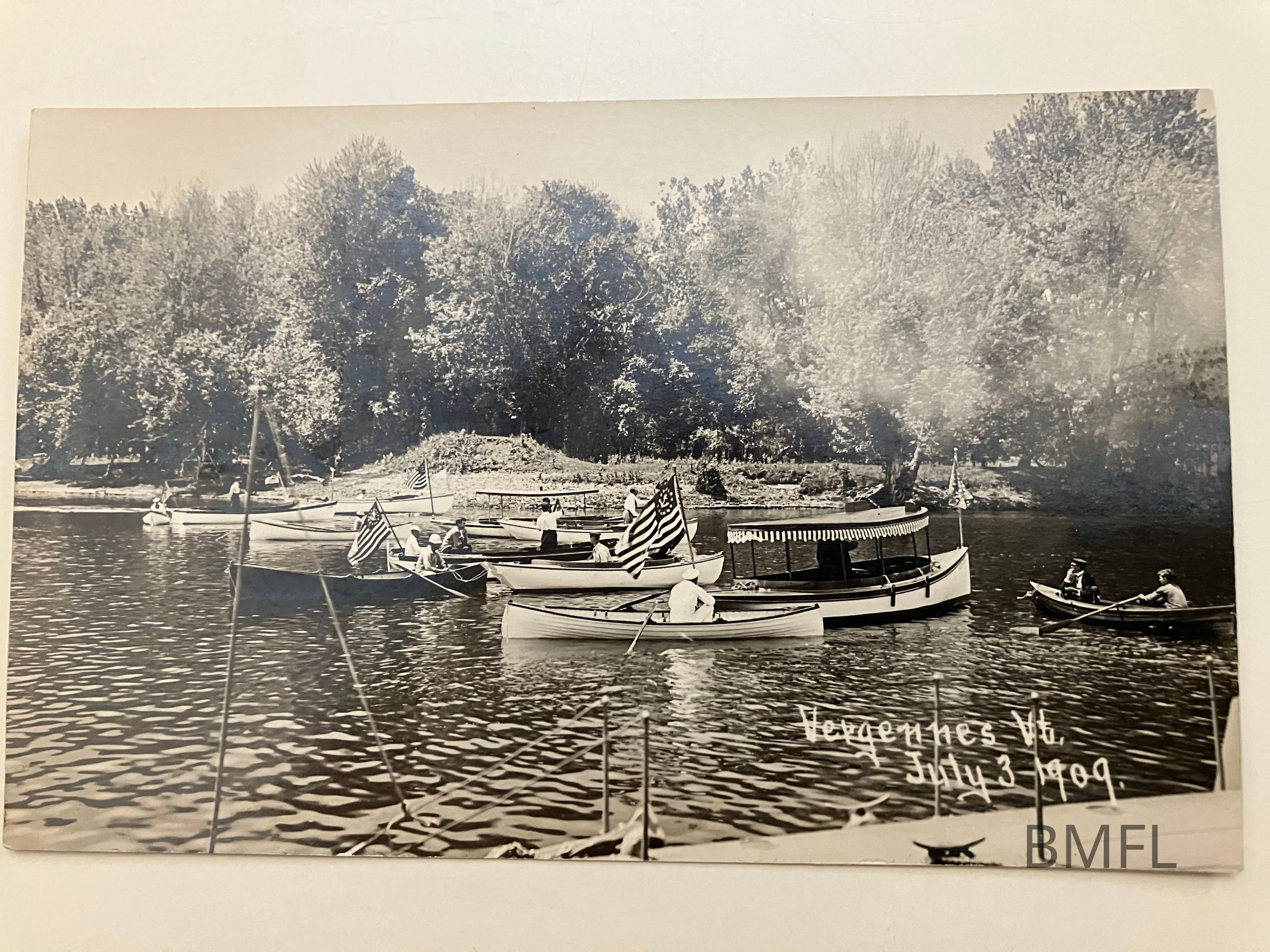 A flotilla of small boats, three flying American flags, on Otter Creek near Vergennes, Vermont.