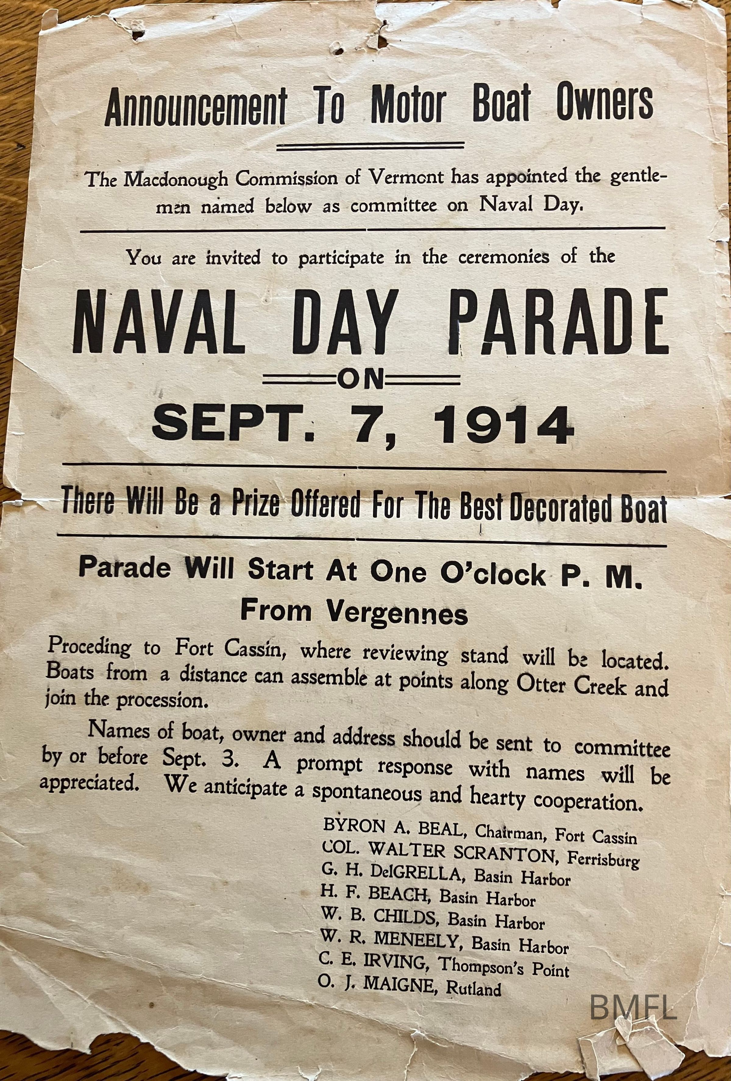 A handbill announcing a Naval Day Parade on Sept. 7, 1914, that would include a prize for the best decorated boat. The judging would take place at Fort Cassin.Photograph Details
