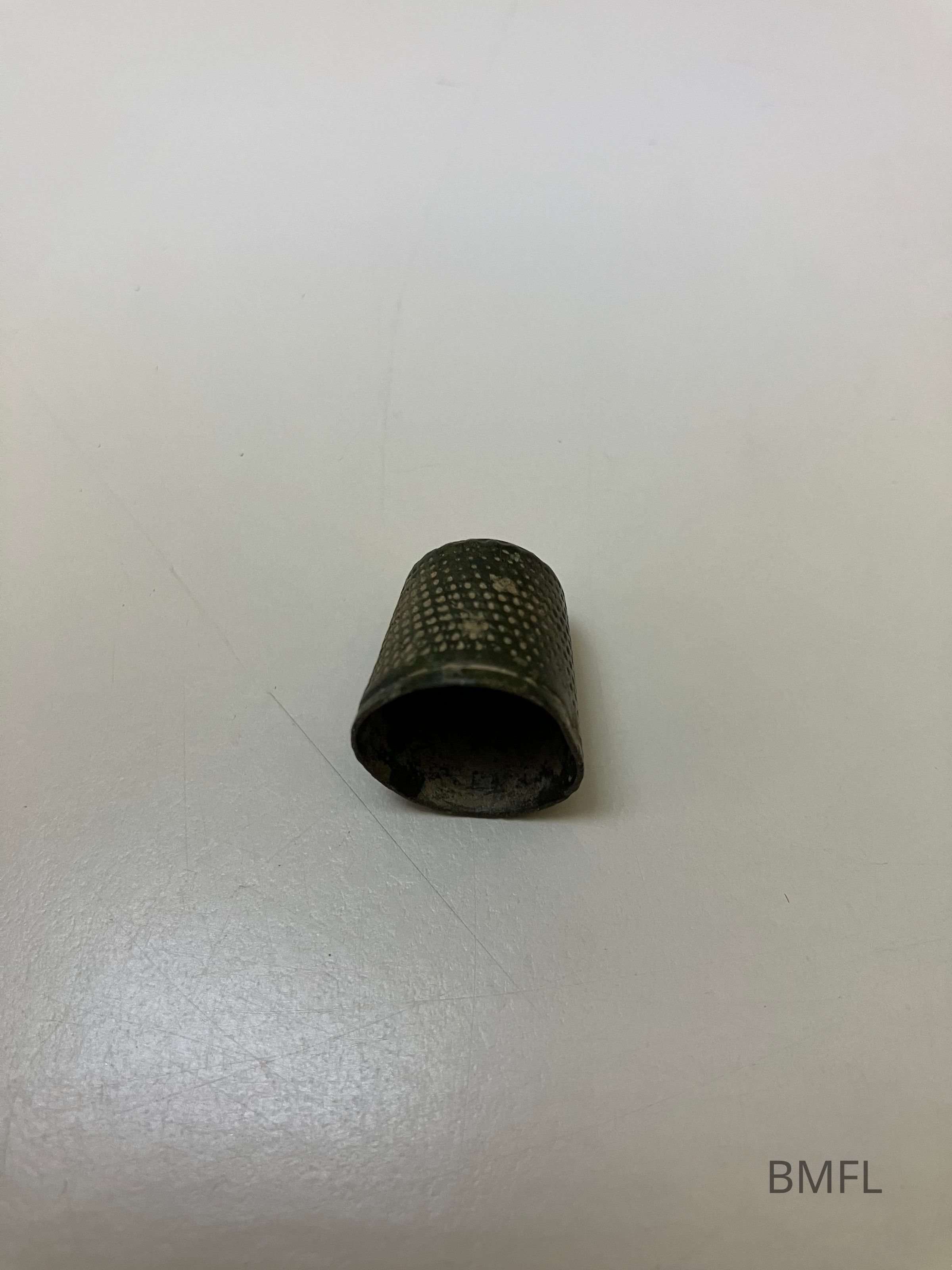 Metal thimble used to protect a finger from pokes from a needle when sewing.Context