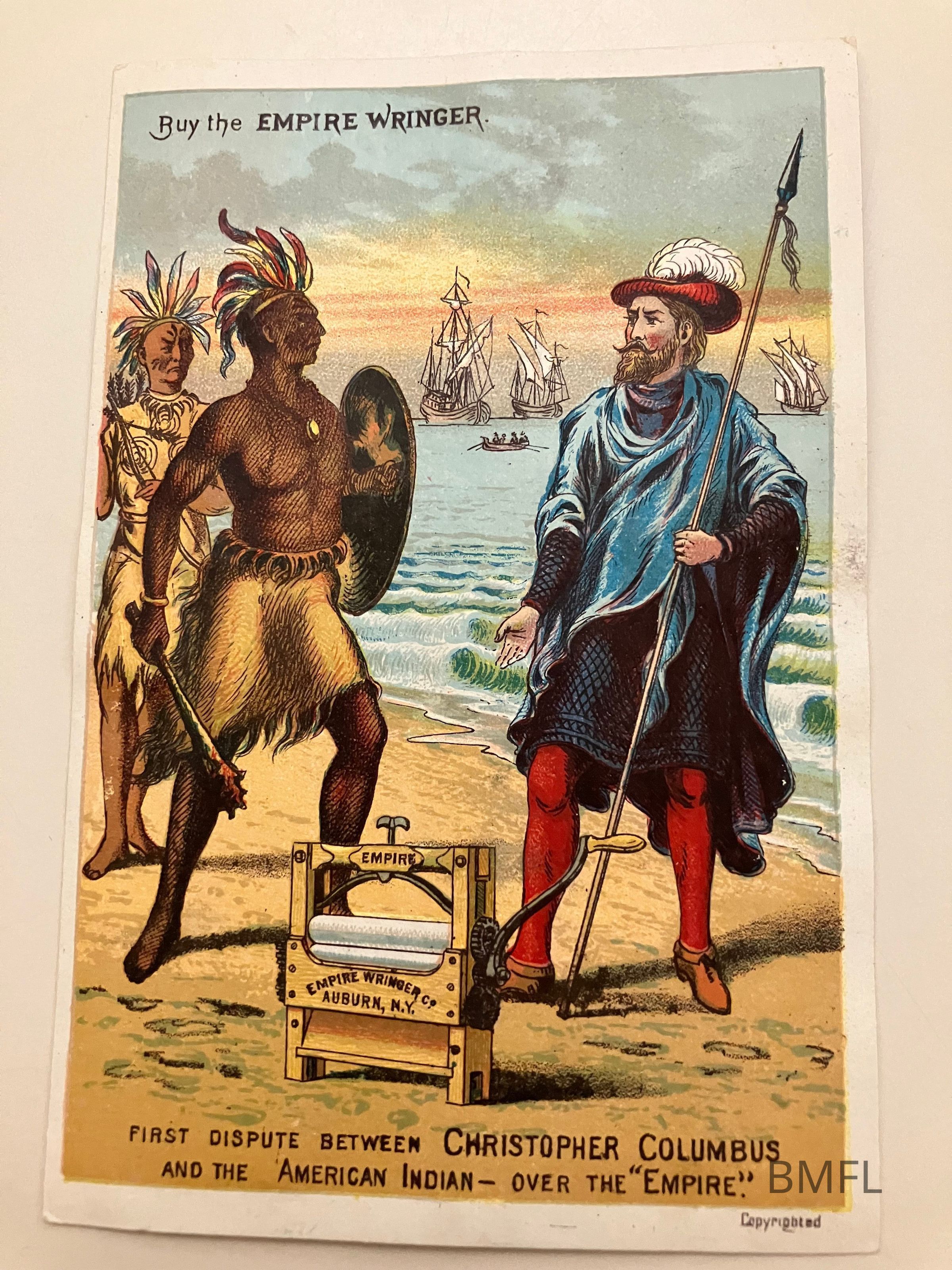 Image is of Christopher Columbus and two Native Americans on the shore with three ships in the background. In front of one Native American and Columbus is the Empire Wringer and the note, "First dispute between Christopher Columbus and the American Indian -- over the Empire."