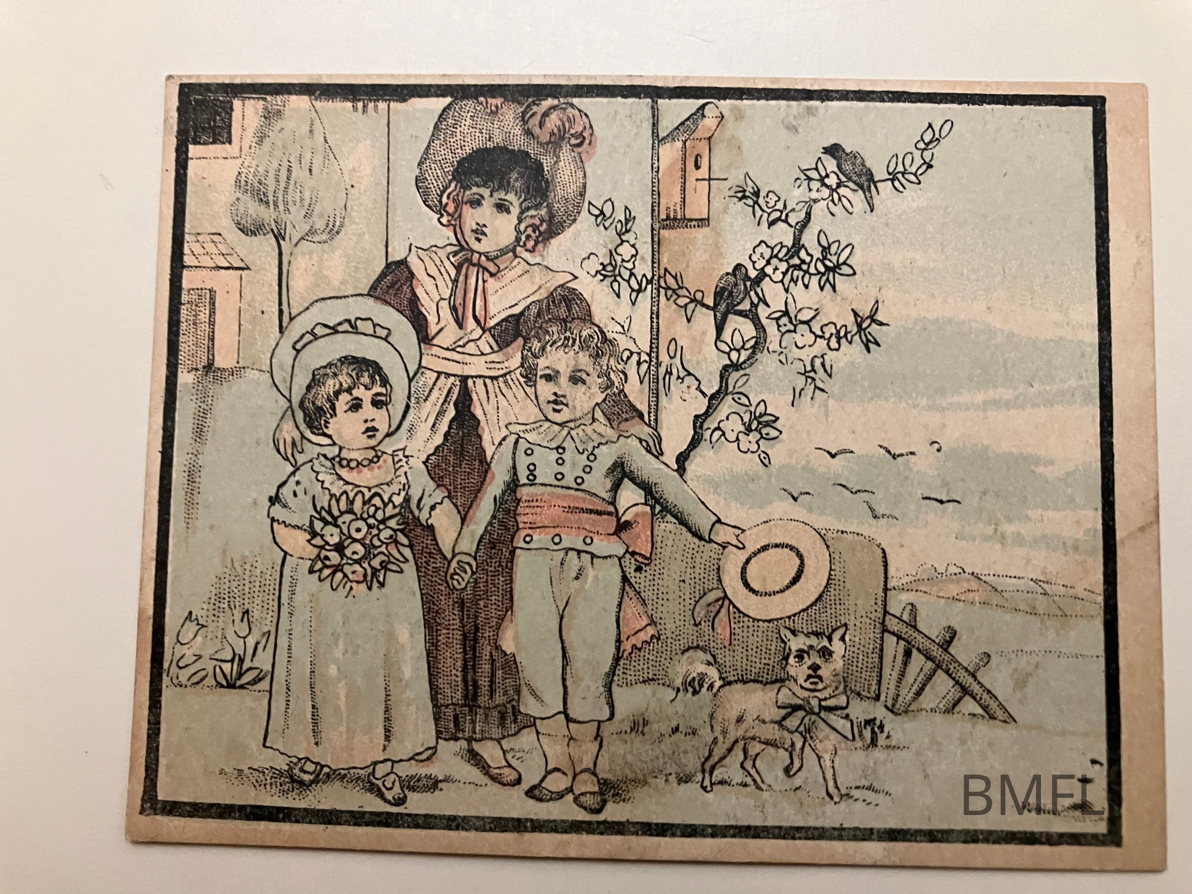 Image of a girl and a boy holding hands with a woman, perhaps their mother, behind them and a small dog with a bow around its neck next to the boy. There are two birds in a tree and a bird house.