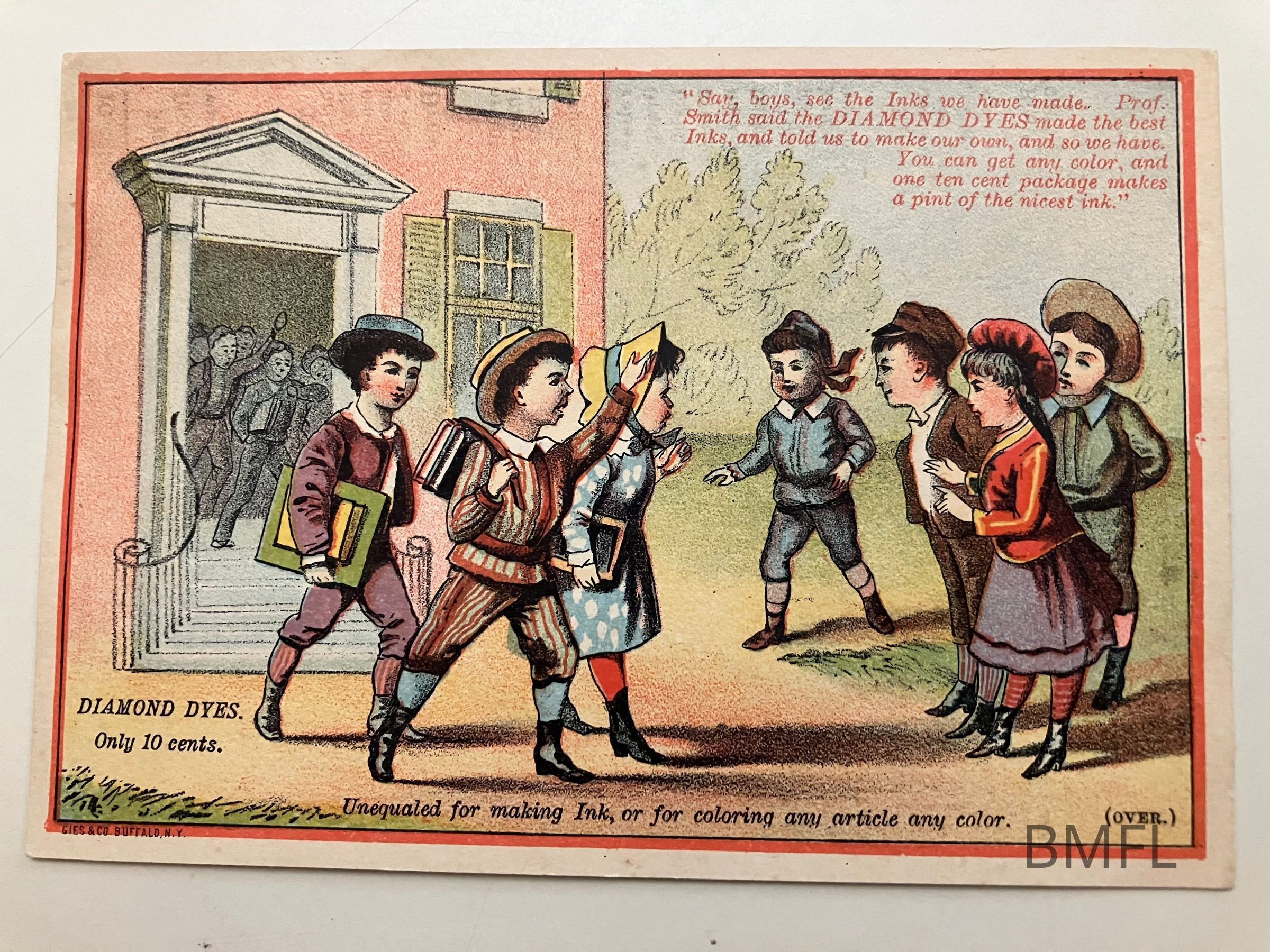 Image boys and girls exiting a school house. In the top right corner is a sales pitch which reads, "Say boys, see the Inks wee have made. Prof. Smith said the DIAMOND DYES made the best Inks and told us to make our own, so we have. You can get any color and one ten cent package makes a pint of the nicest ink."