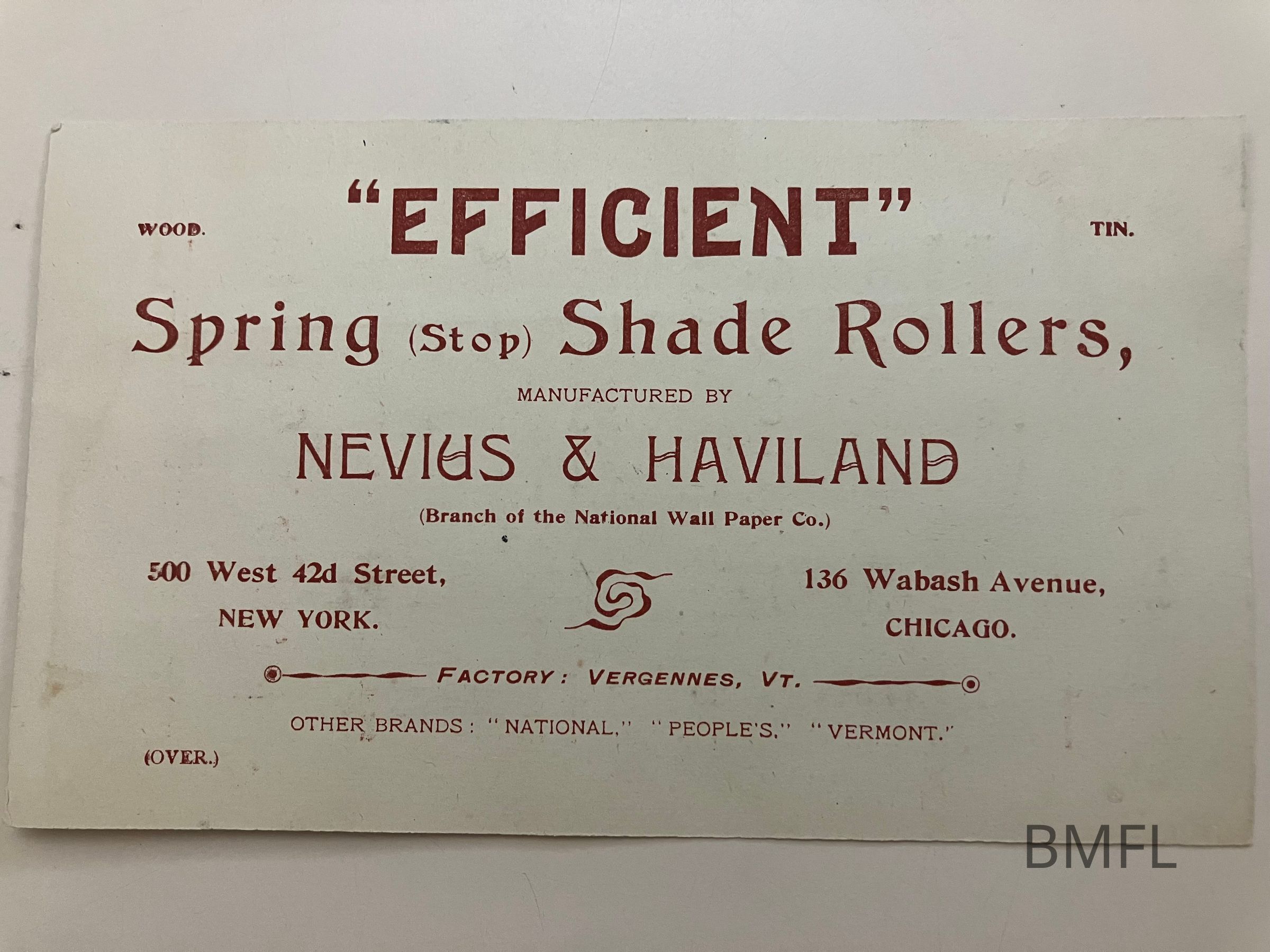 An off-white card with brown printing on both sides The card is promoting a model of shade roller produced at a factory in Vergennes for the Nevius & Haviland Co. of New York and Chicago. The card suggests that other companies are using inferior products compared to the shade rollers produced in Vergennes.Collection