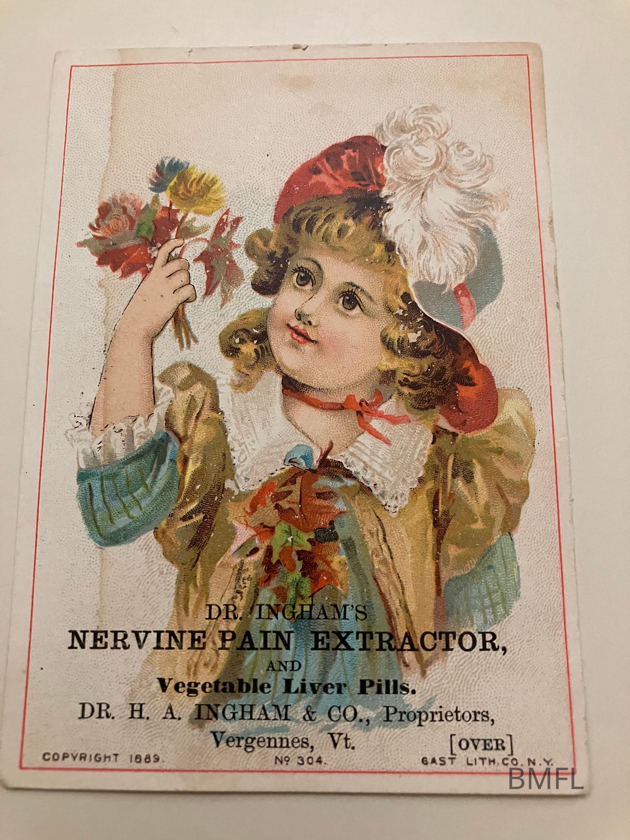 Below her image, the card reads, "Dr. Ingham's Nervine Pain Extractor, and Vegetable Liver Pills, Dr. H.A. Ingham & Co. Proprietors, Vergennes, Vt., Copyright 1889, Gast Lith. Co., N.Y.