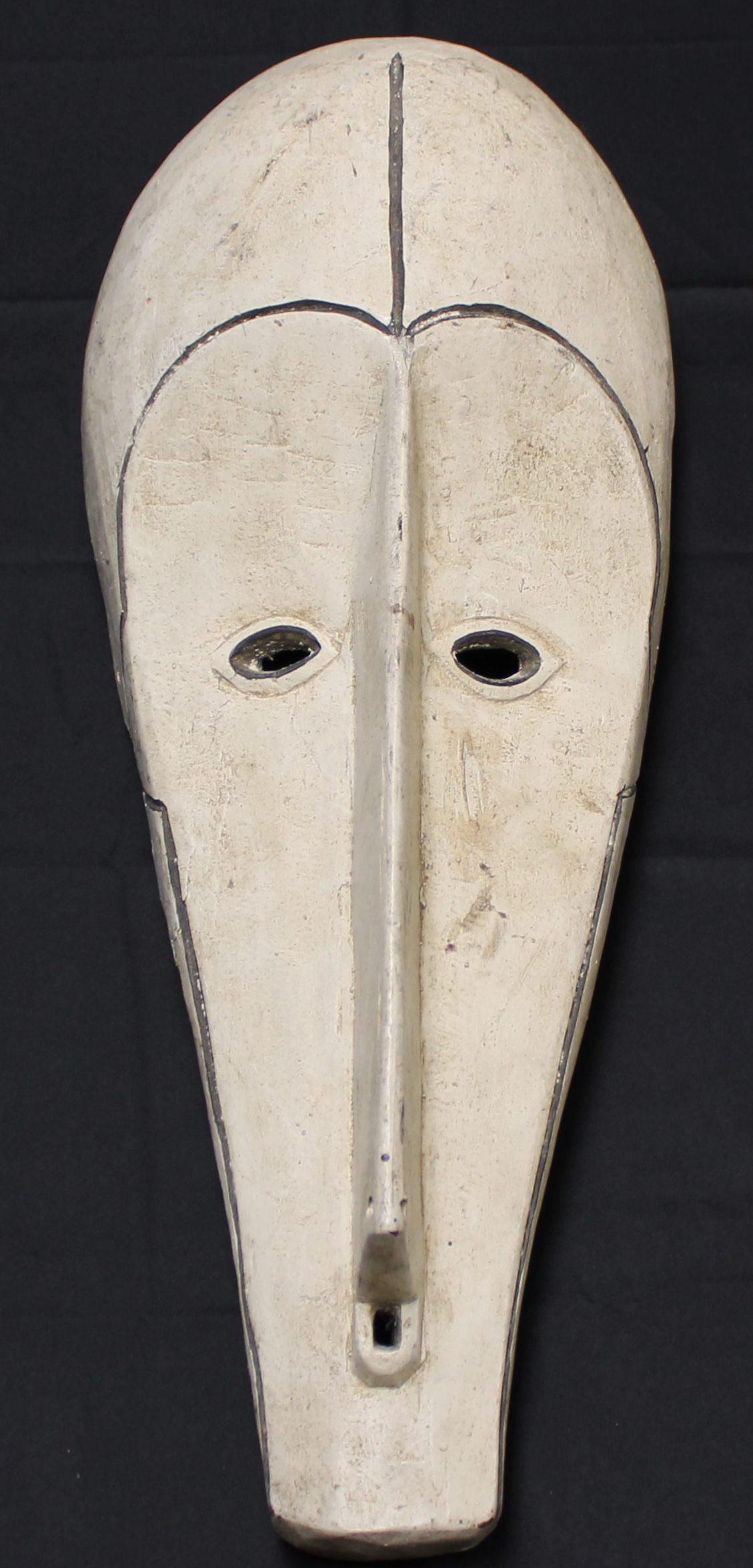 This long white mask features thin black lines accentuating the forehead, eyebrows, and sides of the face. The lines jut out to suggest ears and then narrow toward the mouth. The eye holes are painted with black and the nose extends from the forehead all the way down to the mouth.Context