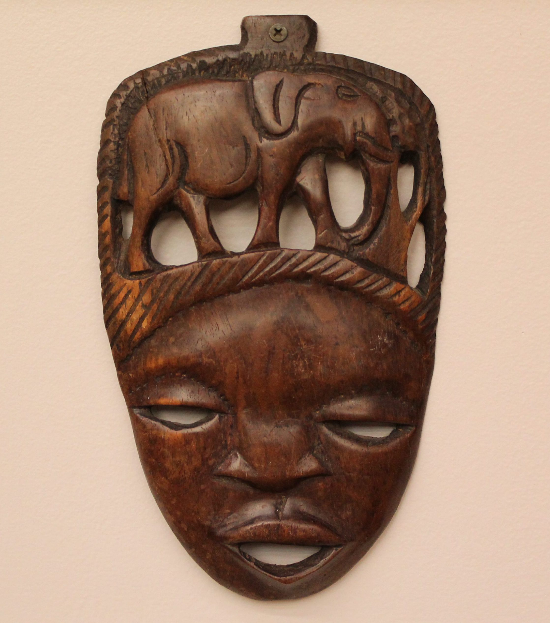 This wooden mask has openings for the eyes and mouth. Above the forehead in the hair of the mask there is an elephant.Context