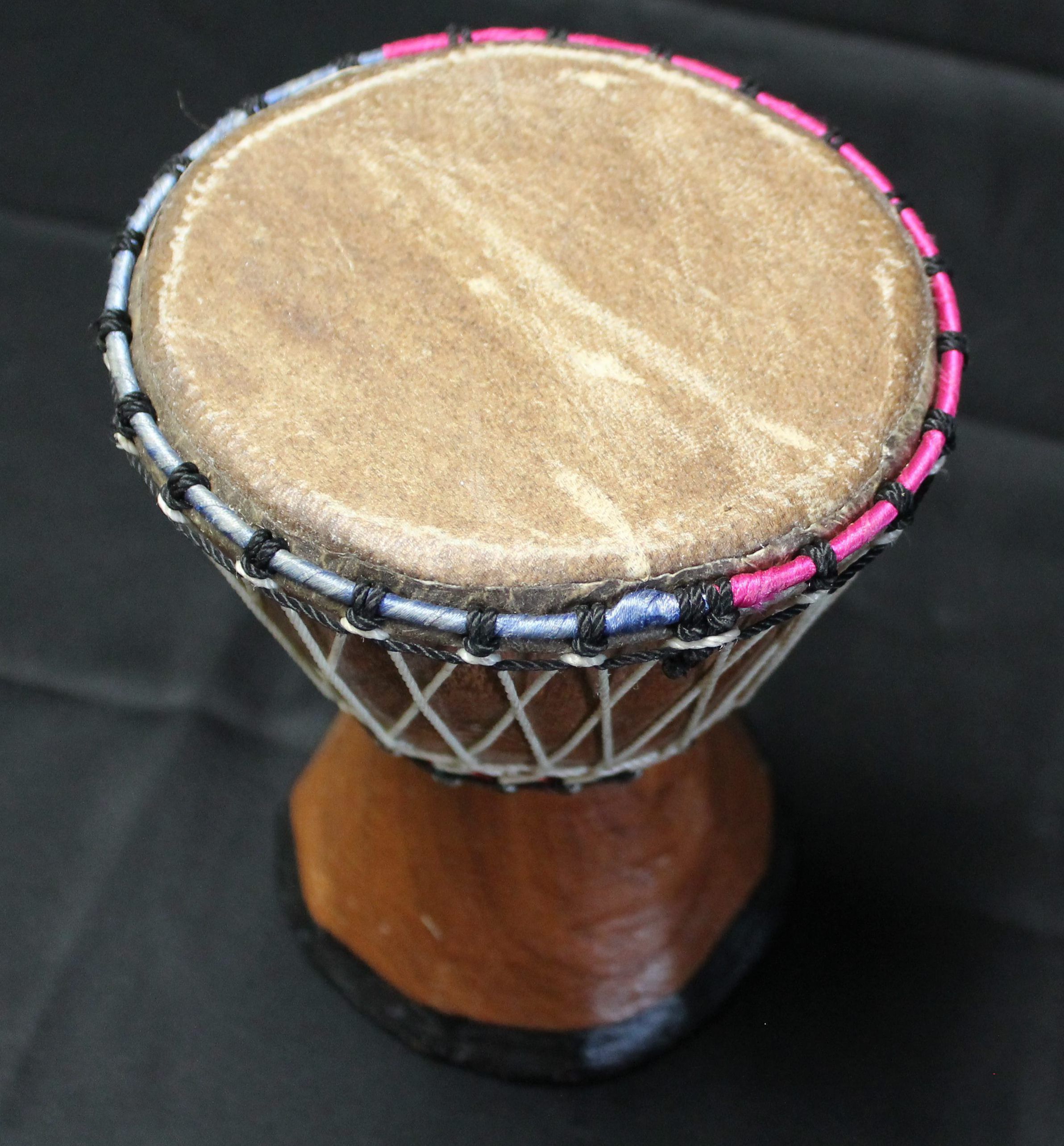 A small hourglass shaped drum with a skin drumming surface sewn on with pink and white thread around the top. There is a lattice of twine holding the skin taught. The middle of the drum has a red twine holding everything together. The body of the drum is a red colored wood with a black stripe painted around the base.Collection