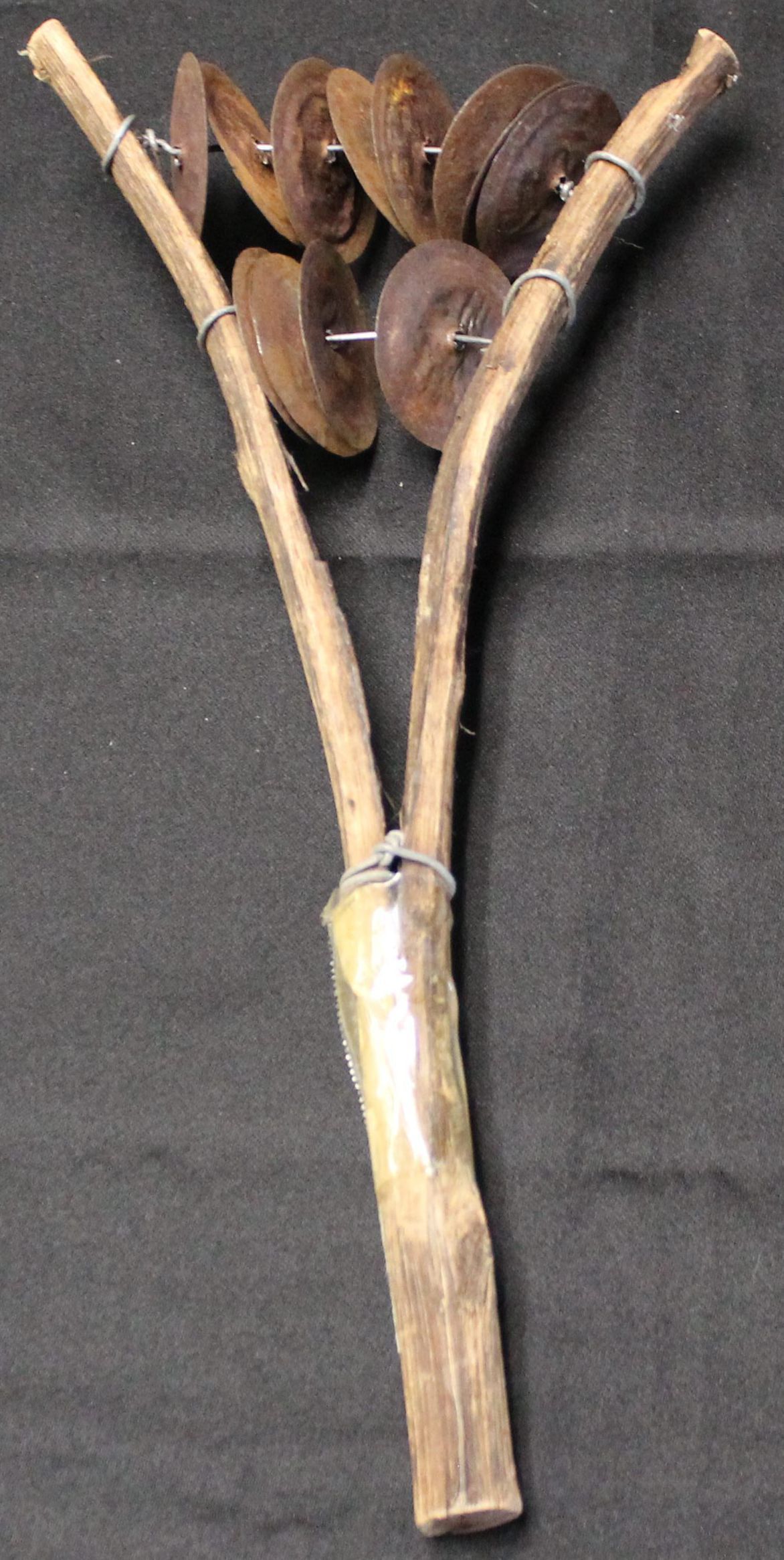 A rattle made from a forked branch with the one end as the handle and the forked end suspending two strands of metallic disks between them. The disks are attached to both sides of the forked end with wire.Collection