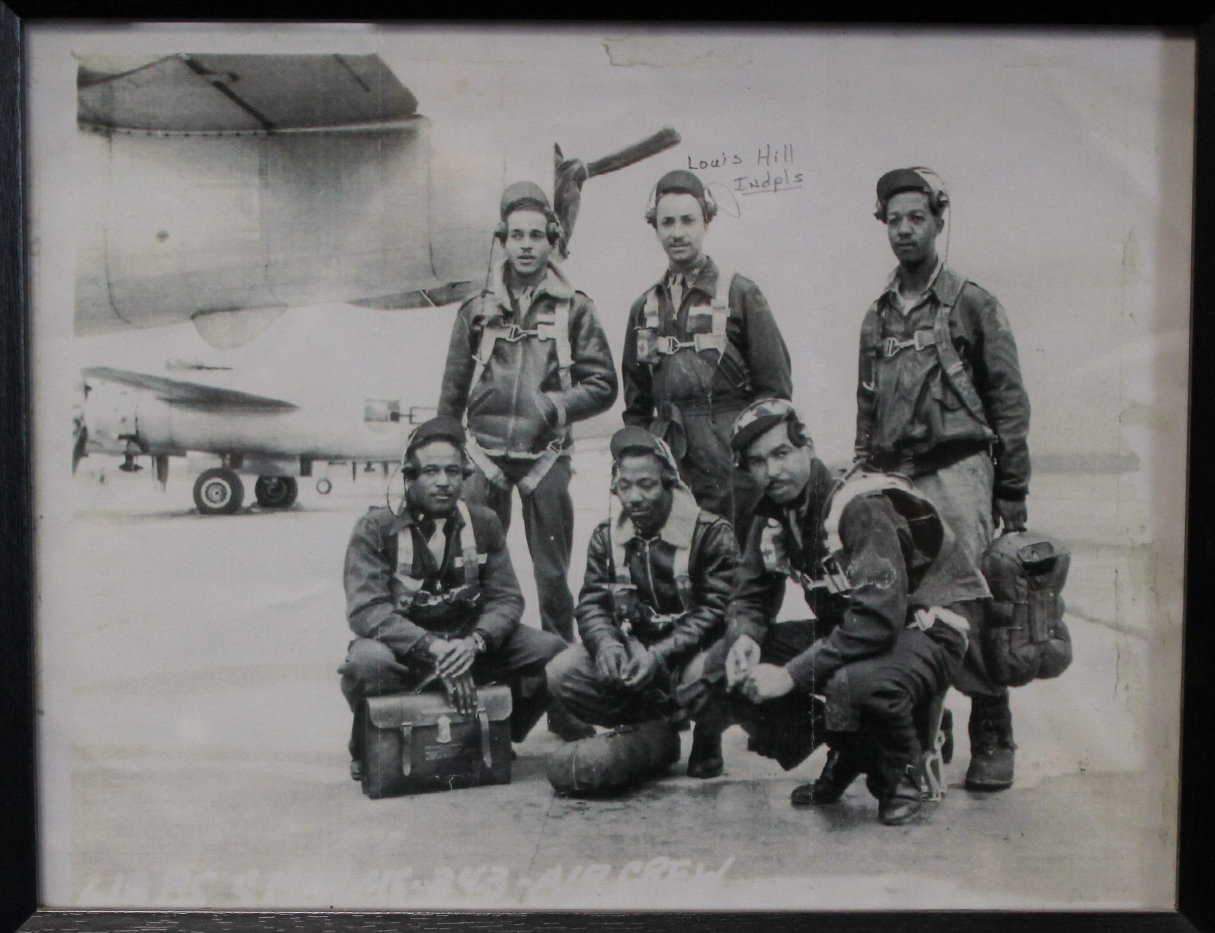 Black and white photograph of six airmen with their gear and a plane in the background. Three of the airmen are standing in the back while the other three kneel in front of them. The middle airmen in the back is labeled as "Louis Hill Indpls"Photograph Details