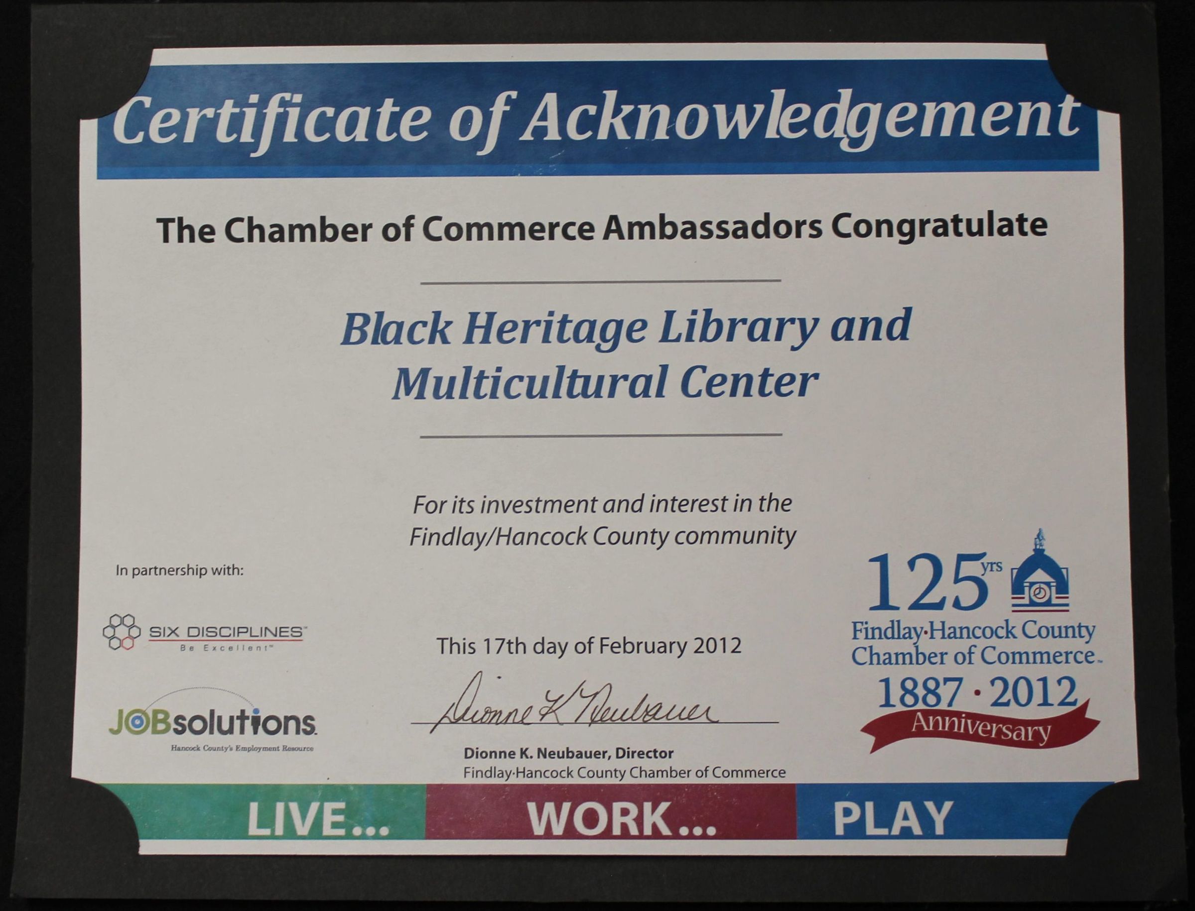 This is a certificate from the Chamber of Commerce congratulating the Museum "for its investment and interest in the Findlay/Hancock Count community." The certificate is signed on February 17th, 2012 by Dionne K. Neubauer, the director, and reads "Live.. Work... Play" across the bottom.Context