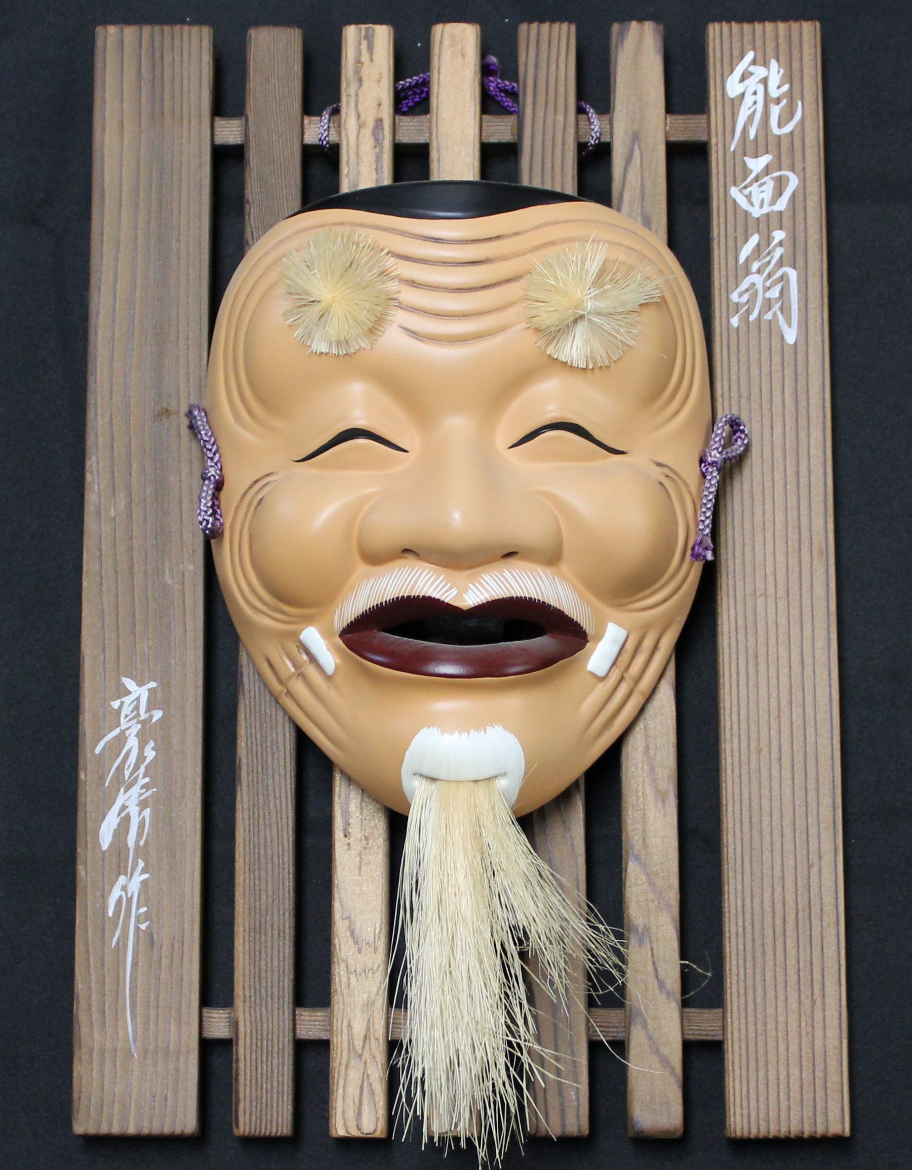This Asian mask is mounted on a wooden lattice with characters down the left and right sides. The mask itself appears to be happy with full cheeks and a wrinkled forehead, cheeks and side of jaw. The mask has two pompoms on either temple, and a beard coming from his chin. The mask has a white moustache painted above the upper lip.Use