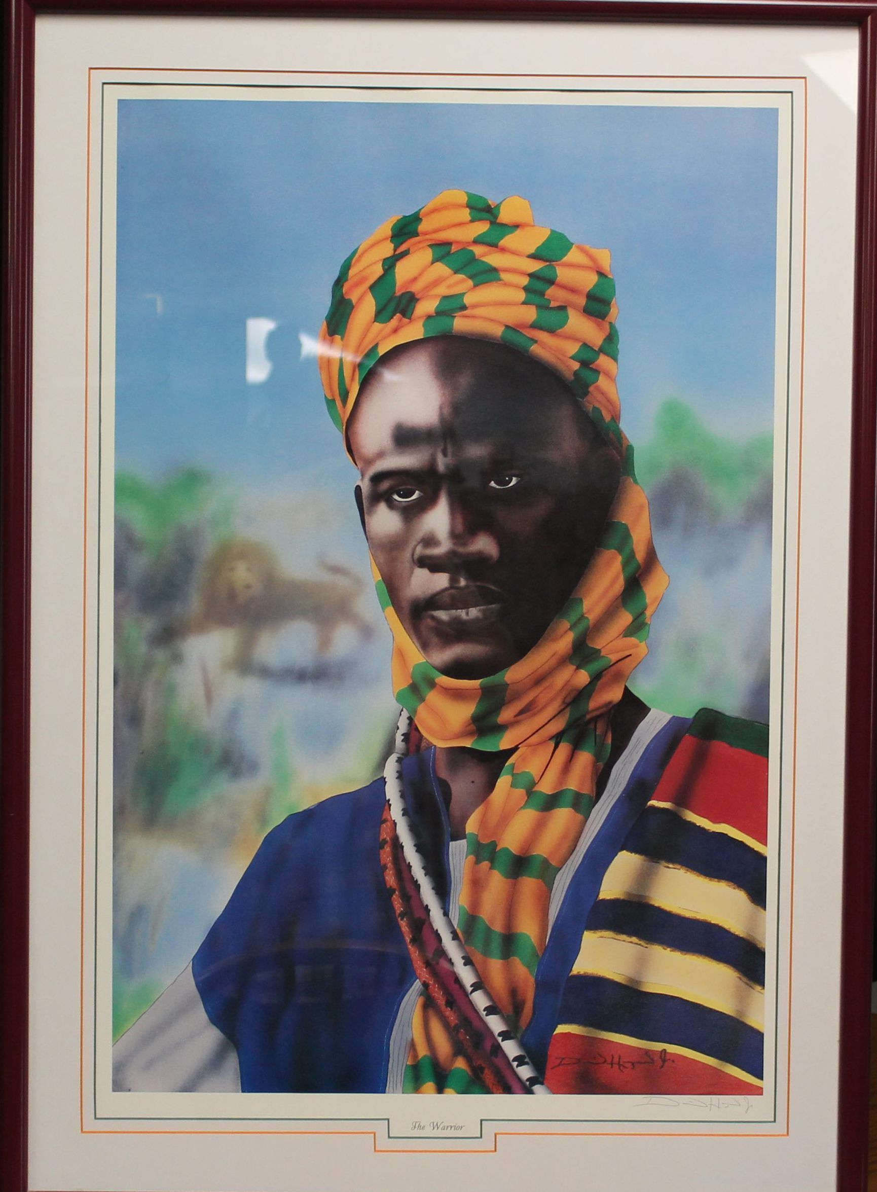 This image depicts a warrior with a striking yellow and green scarf and a lion in the background.Type of Print