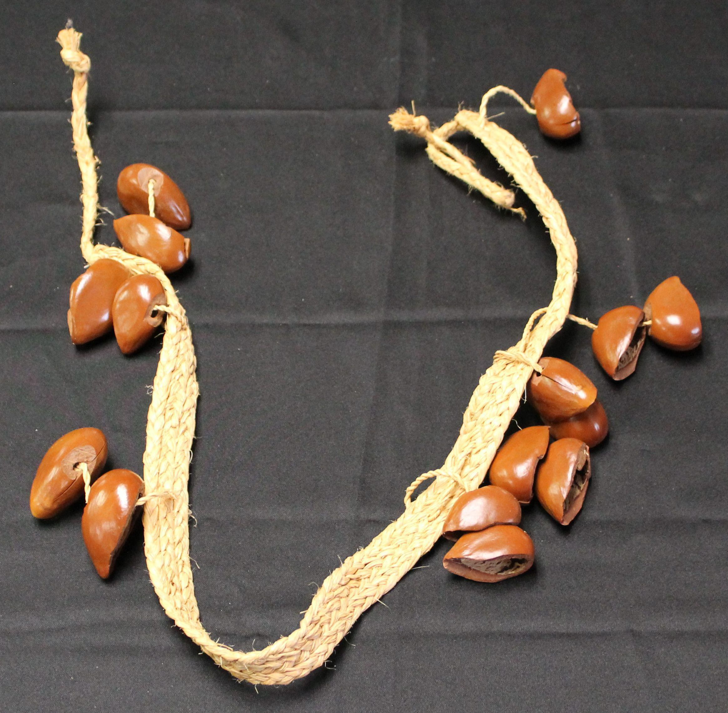 This musical instrument is a woven band of rope with dried seed pods threaded onto it.Collection