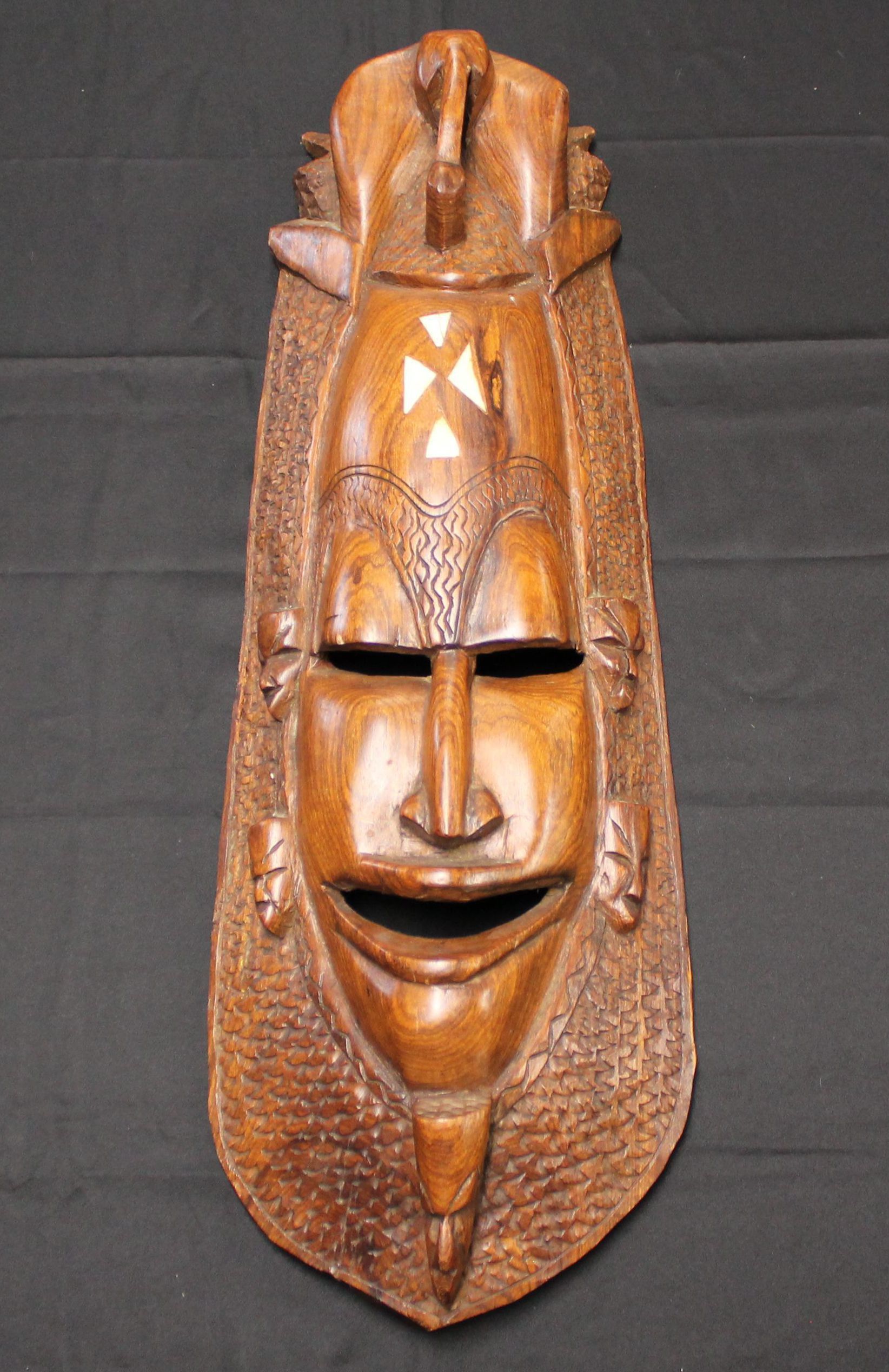 This long wooden mask has open eye holes and is carved with a mostly smooth face with details around the outer edges. There are five smaller faces: one on either side of the face by the eyes, one on either side of the face by the mouth, and one just under the chin.Use