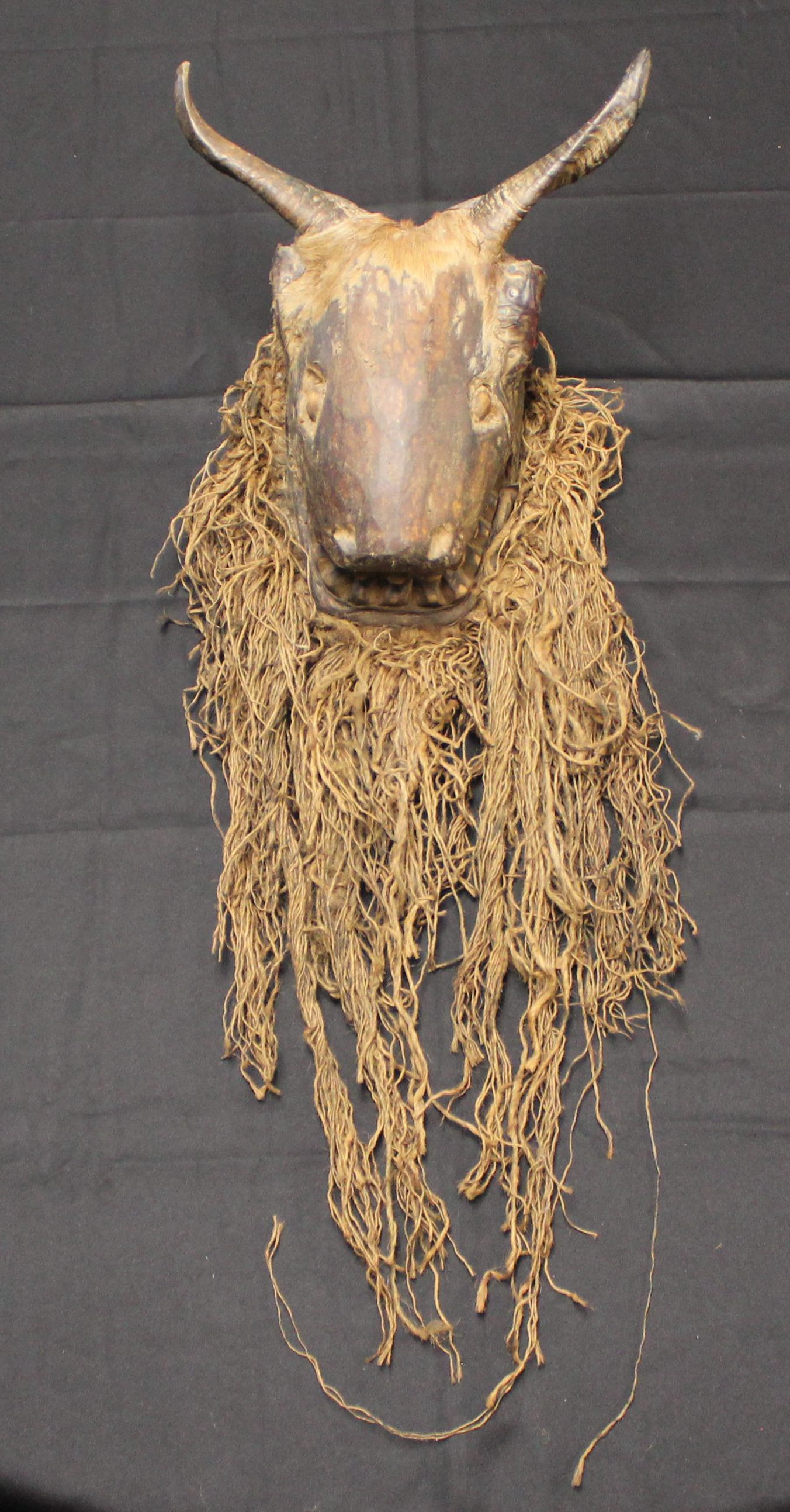 This brown, animal head mask has two horns coming from the top of its head, teeth in its mouth, and a long mane coming from the side of its face and chin. Remnants of fur remain on the top of its head.Use