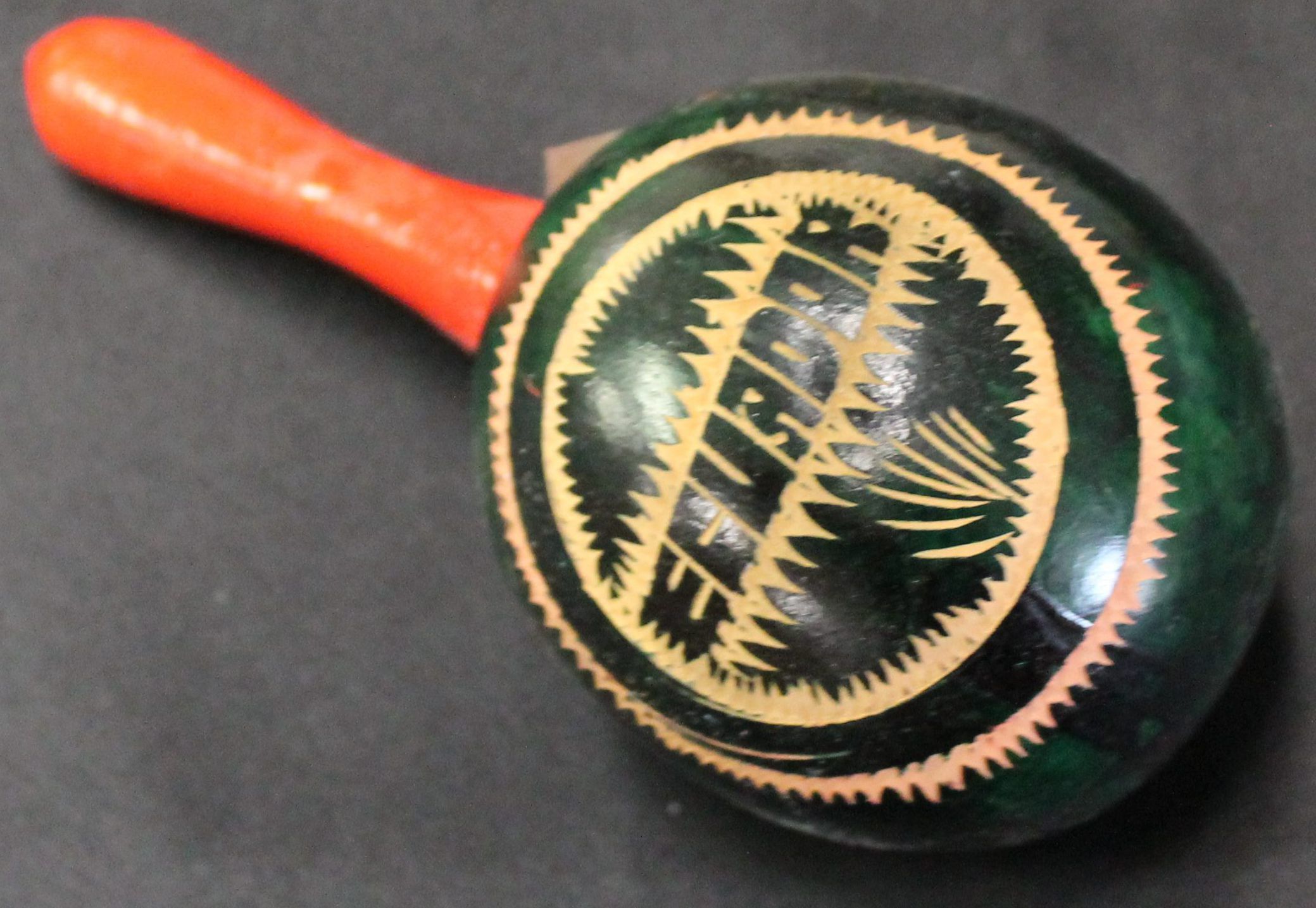 A green maraca with the word "Ecuador" carved into the body. The handle of the maraca is orange.Collection