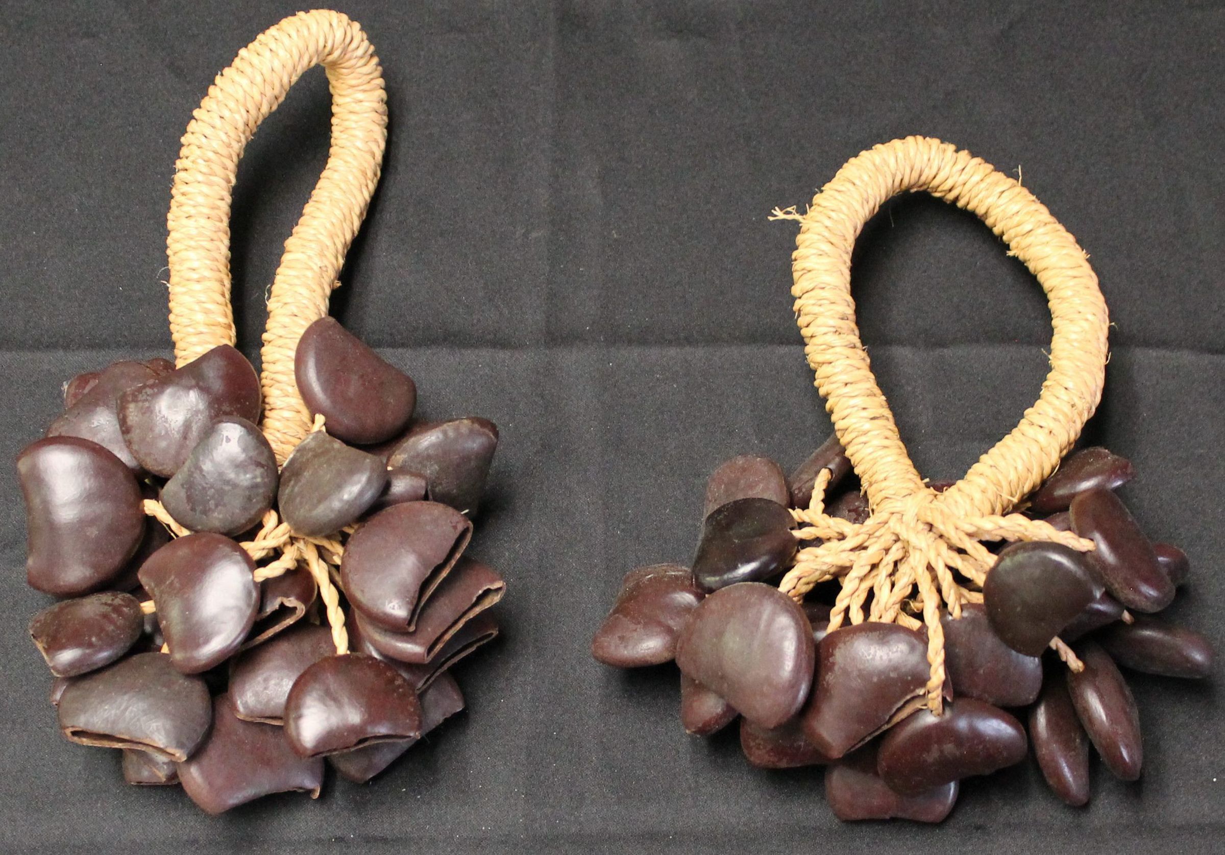 A a paid of rattles made out of a rope handle wrapped into a circle with dark seed pods threaded onto the end to rattle against each other.Collection