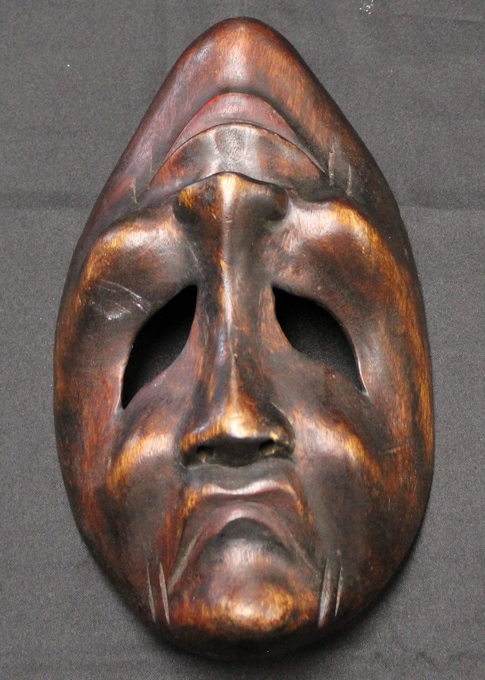 This mask has the ability to be worn right side up, or upside down. On one side, the eyes droop outwards and the mouth is frowning. On the other side the eyes slant inwards and the face is smiling.Context