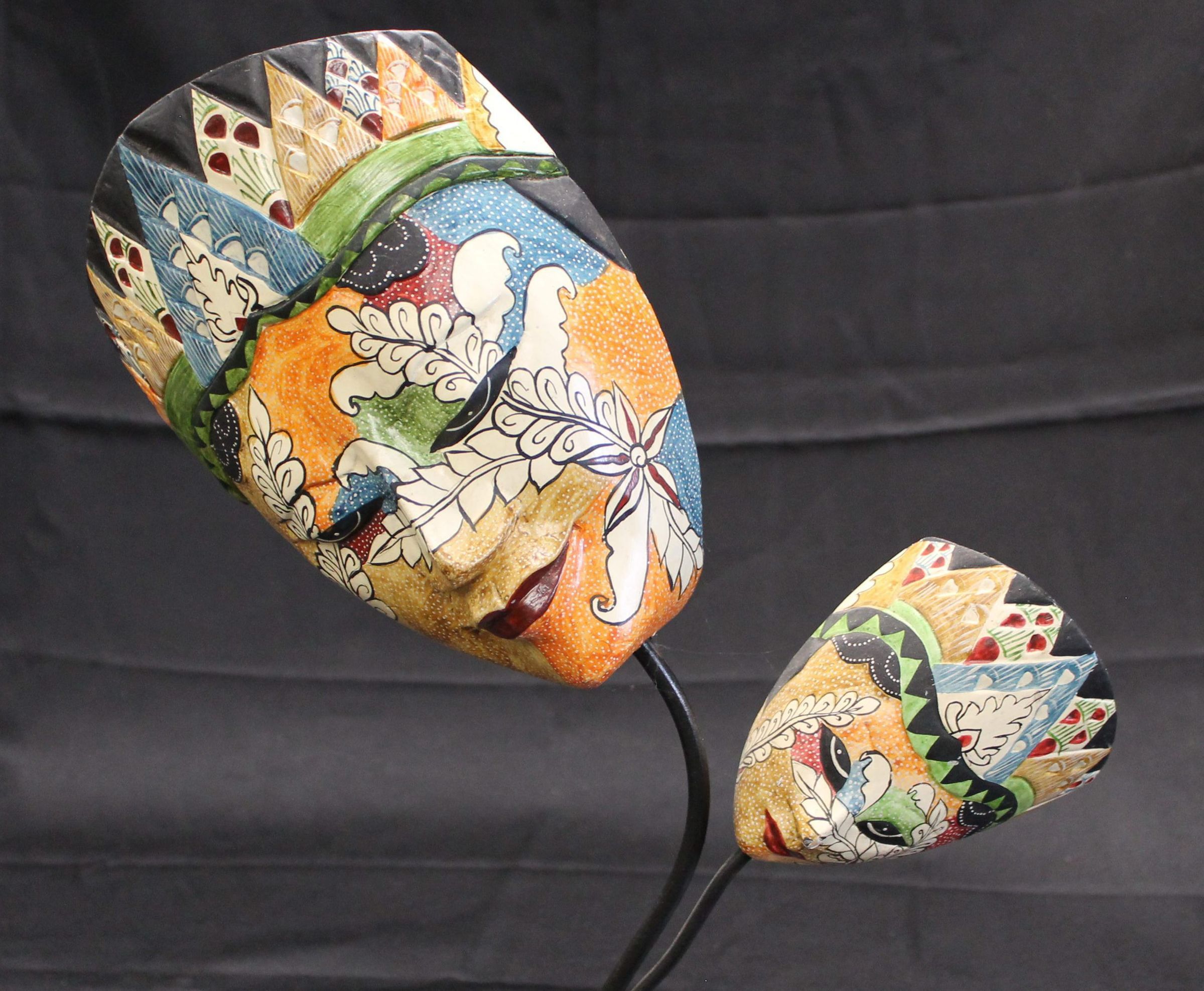 A large and a small floral mask mounted on a twisted base. The masks faces are painted with orange, red, blue and green and then dotted over in white. Overtop of that is a floral design.Context