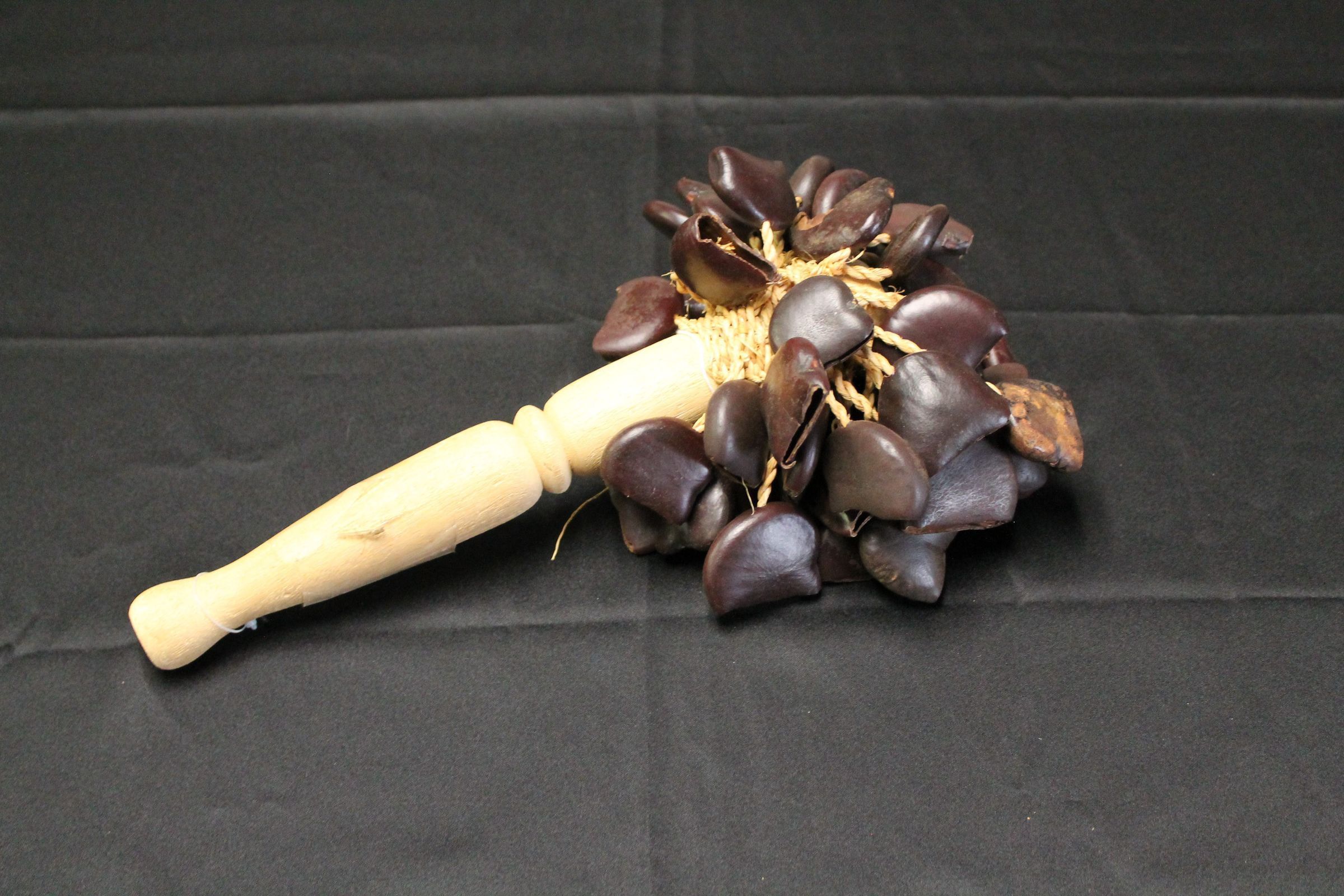 A rattle made out of a wooden handle with dark seed pods threaded onto the end to rattle against each other.Collection