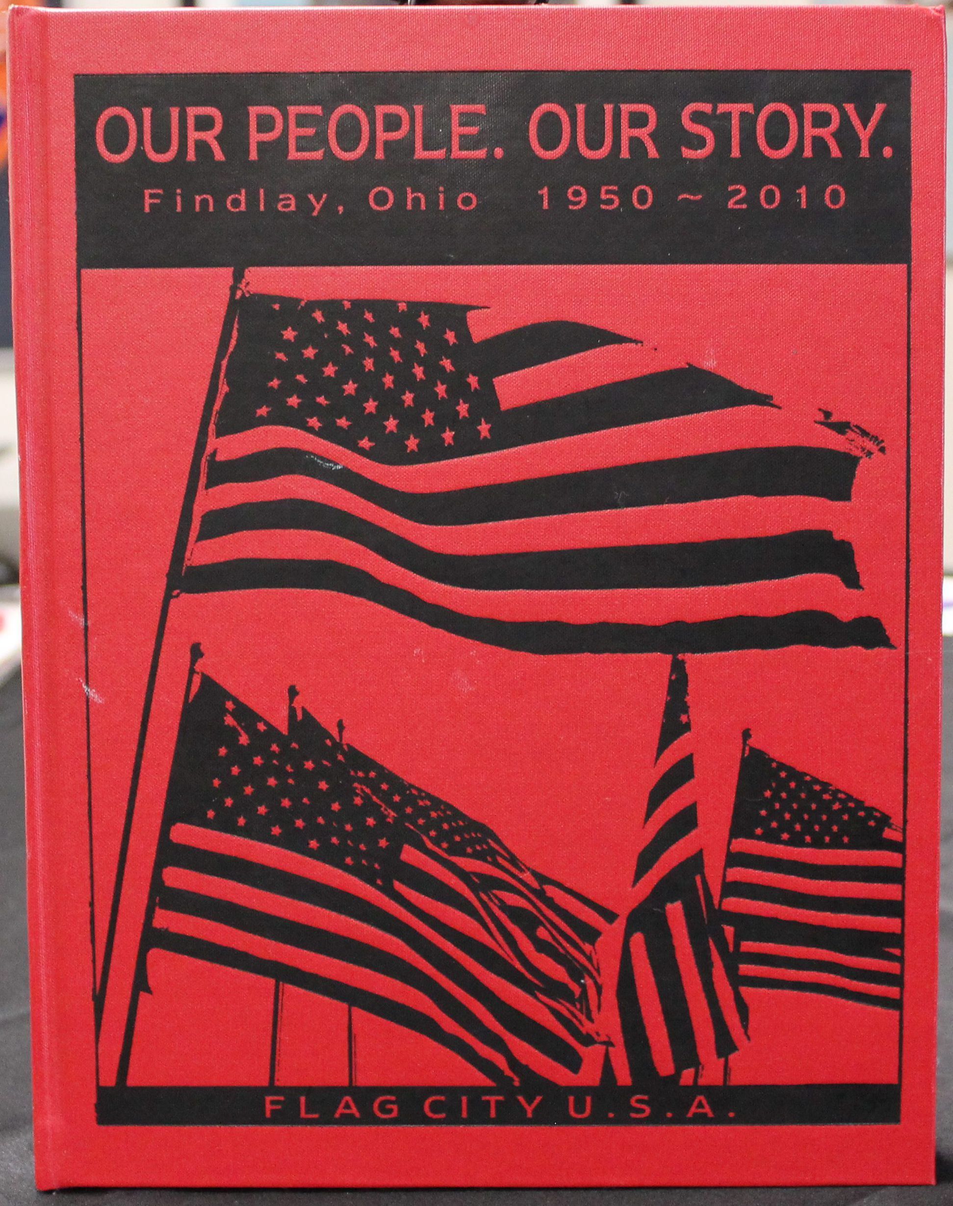The front cover of this hardcover book is red canvas stamped with the black outlines of a number of American flags. The title, "Our People. Our Story. Findlay, Ohio 1950-2010" runs across the top. The bottom edge of the cover reads "Flag City USA"Collection