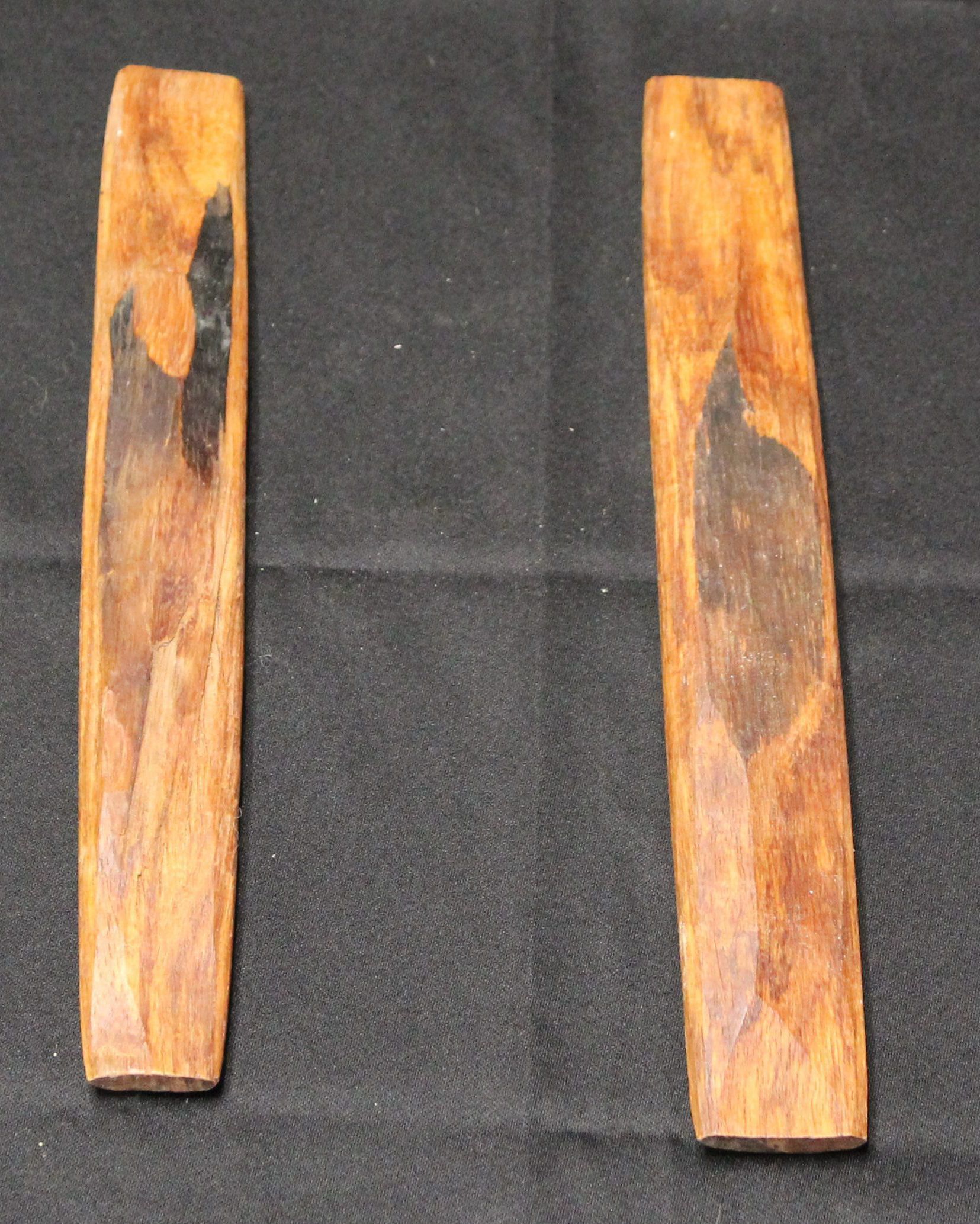 Two identical flat wood sticks, meant to be knocked together as a rhythm percussion instrument.Use