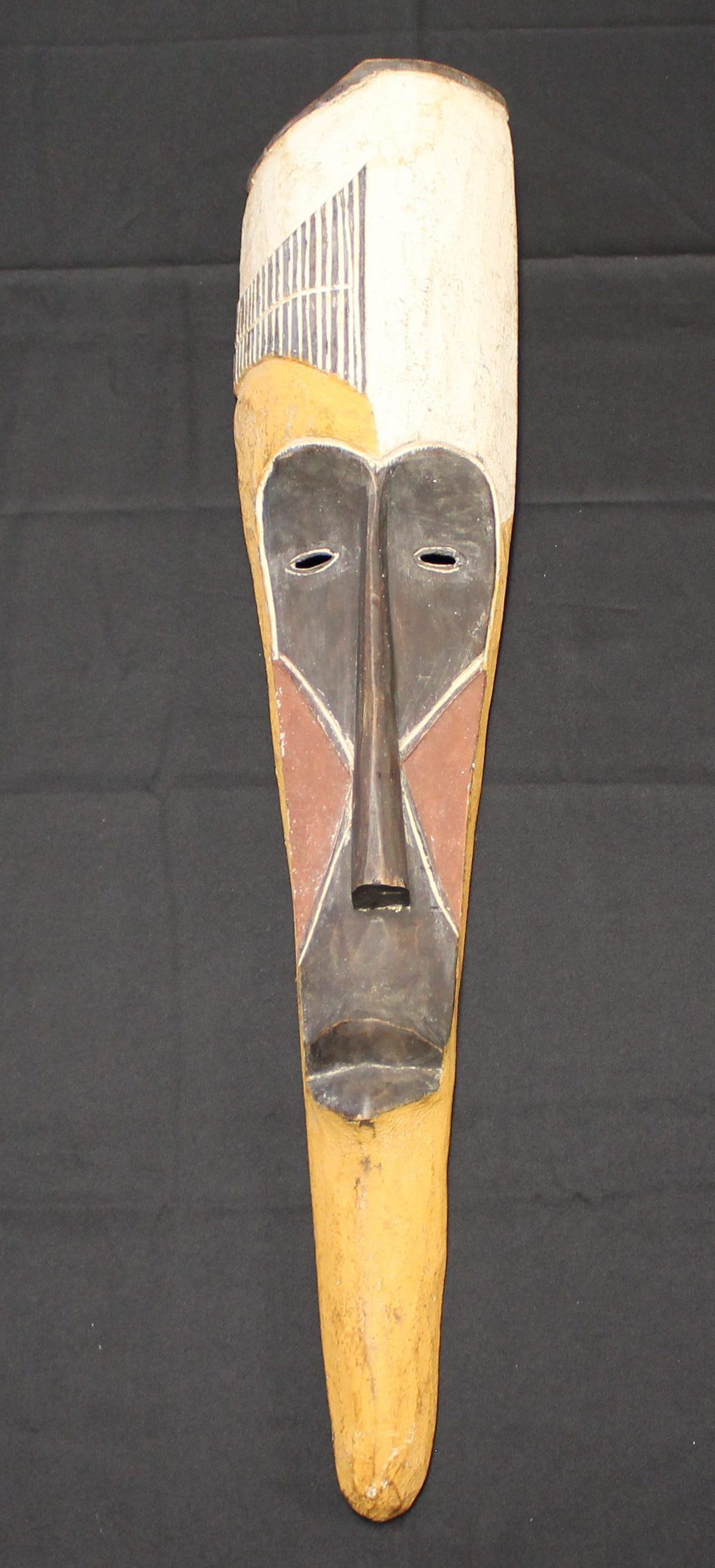 This long mask has a white forehead, brown face with cut out eyes and red cheeks. The mask is outlined in yellow down to the long chin.Use
