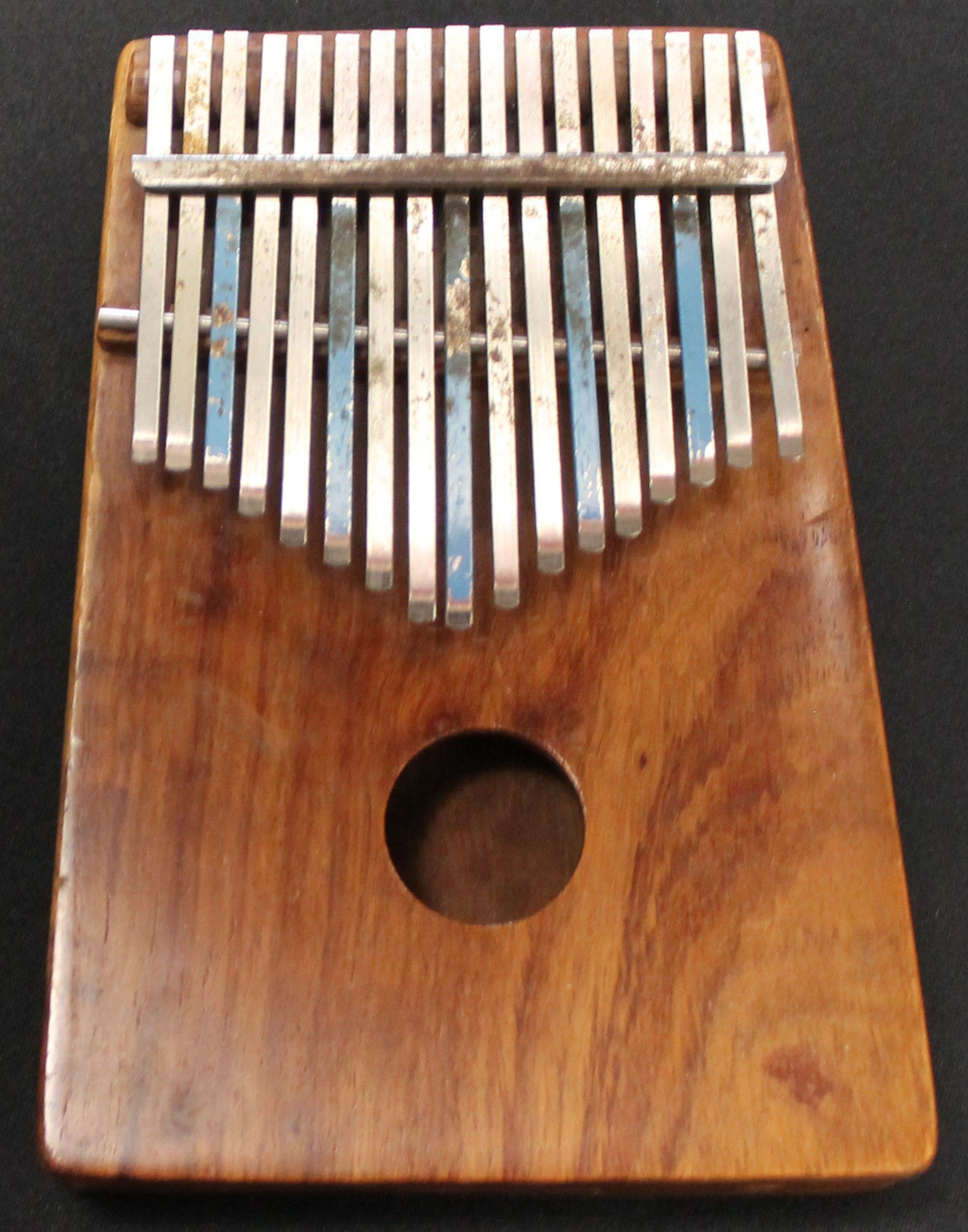 A mbira, sometimes known as a thumb piano, is an instrument made of a wooden body with a hole for resonance and thin strips of metal or keys that can be played by the user's thumbs. The metal strips vary in length to create different notes, and every third key is a slightly different colorContext