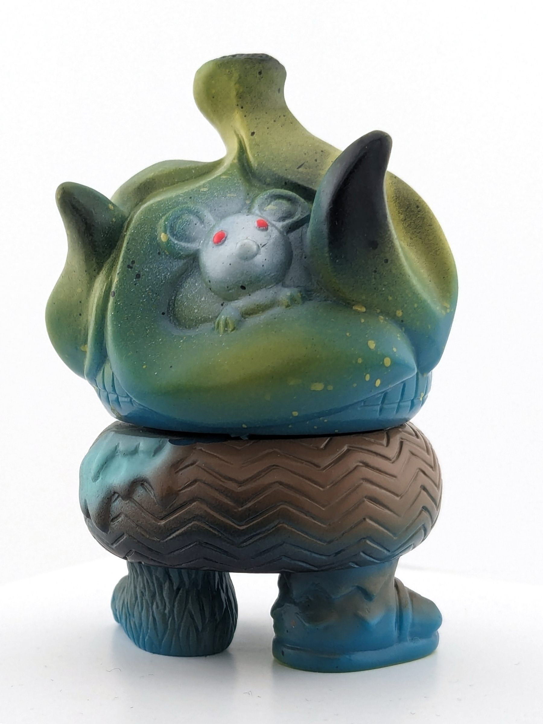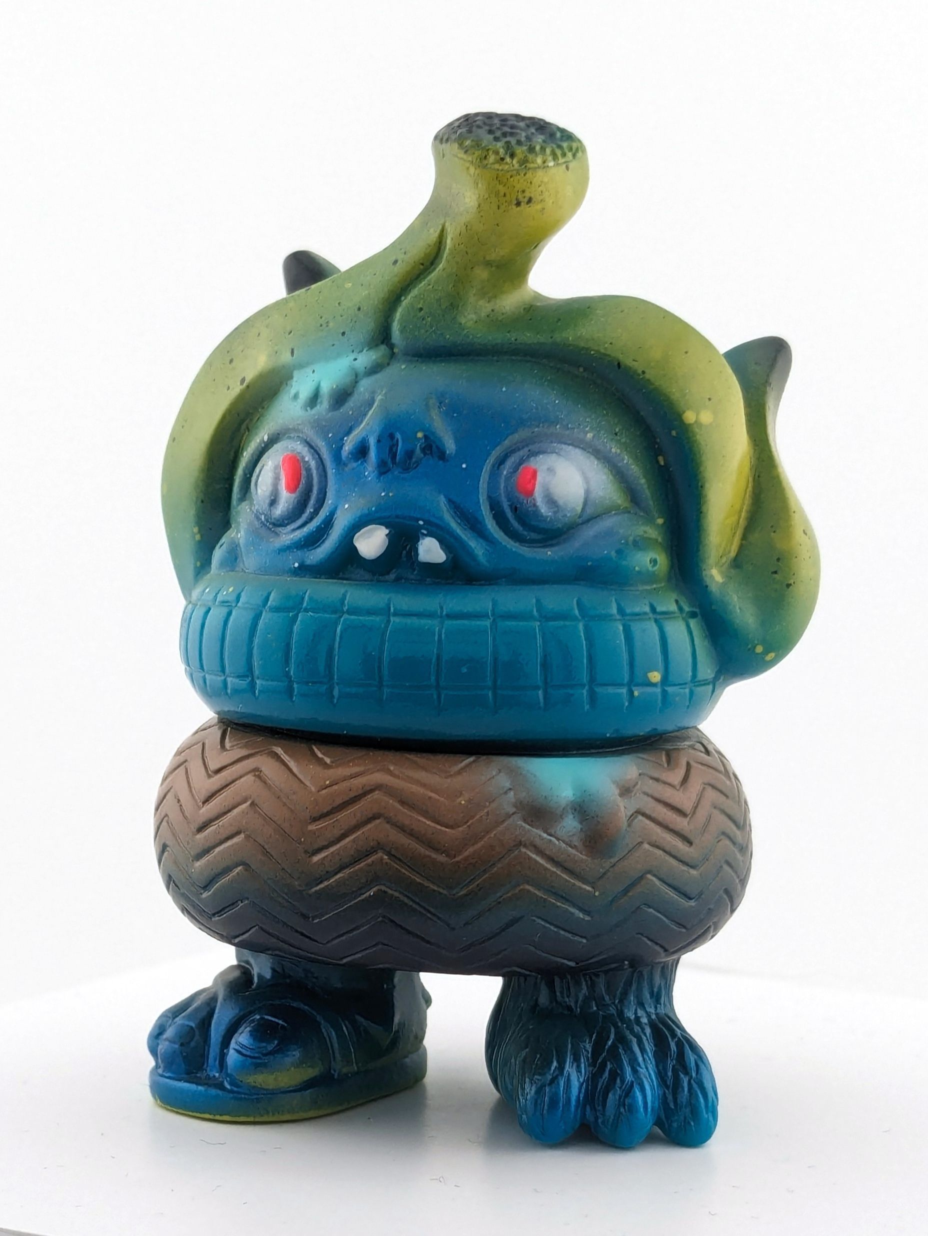 Blue vinyl with brown, yellow, white, and fluro orange paint