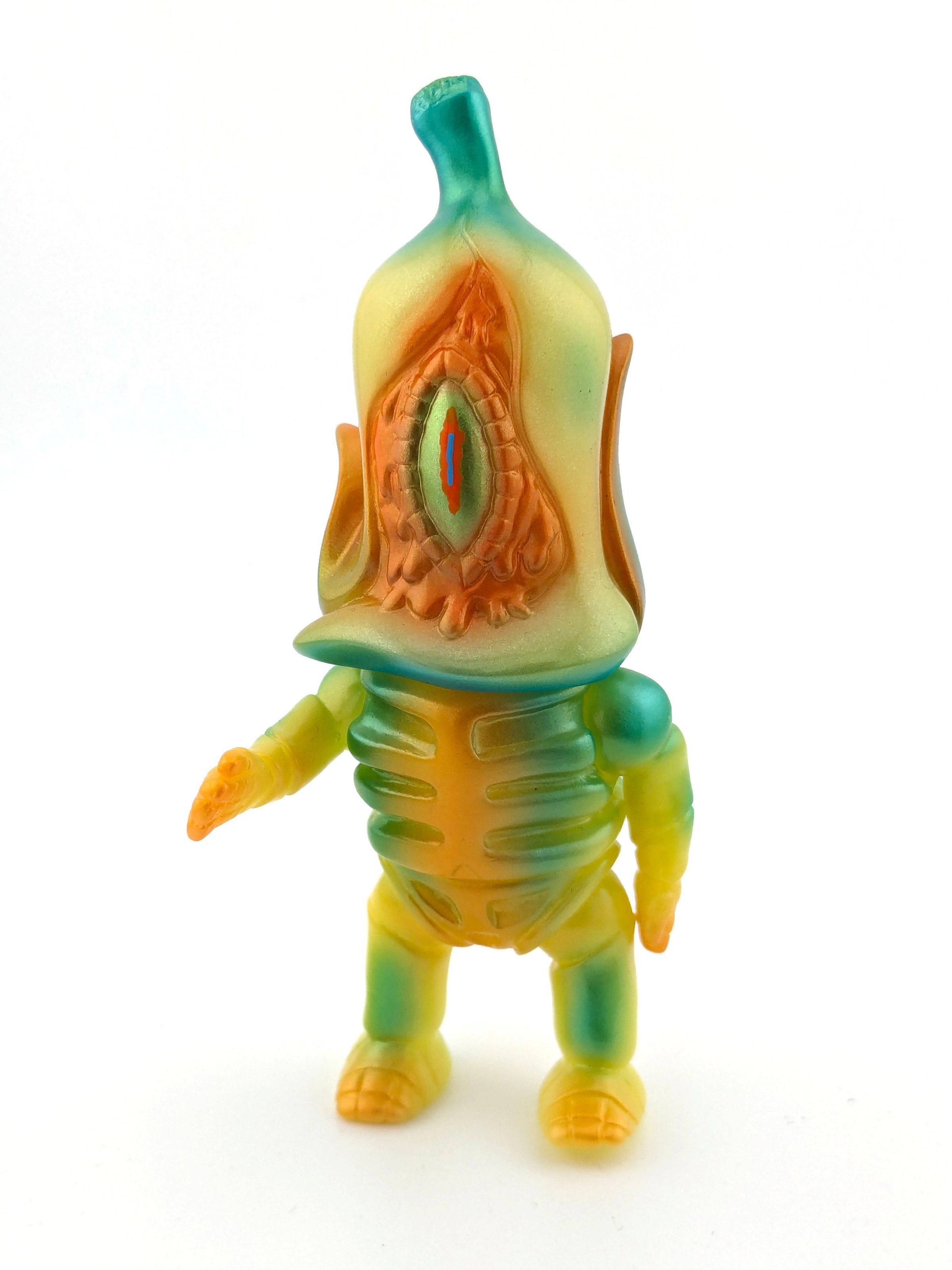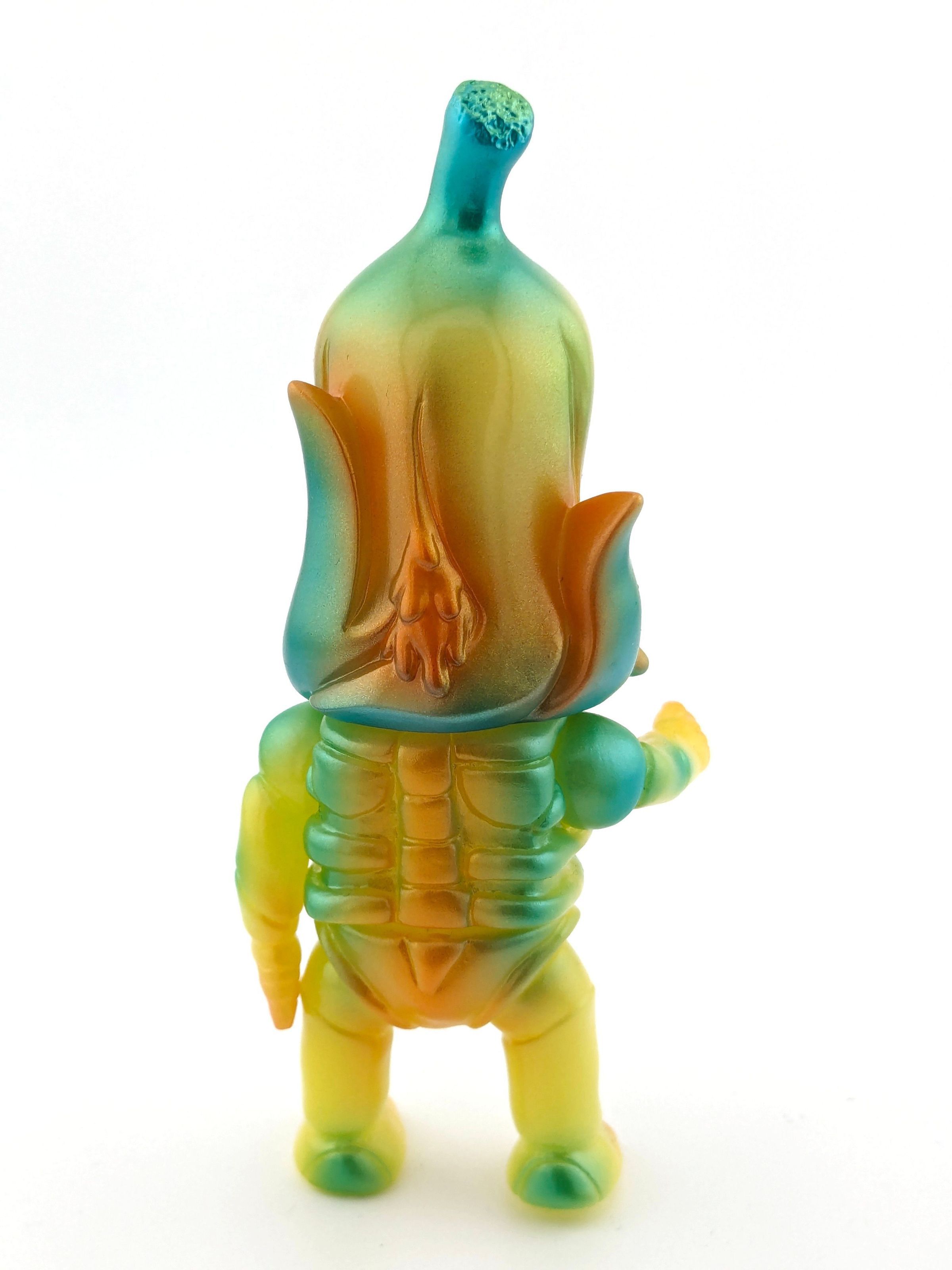 Yellow vinyl with metallic green, orange, gold, red, and blue paint. Mashup of Gravy Toys Banorah and Science Patrol Wild Hunt figures.Made/Created