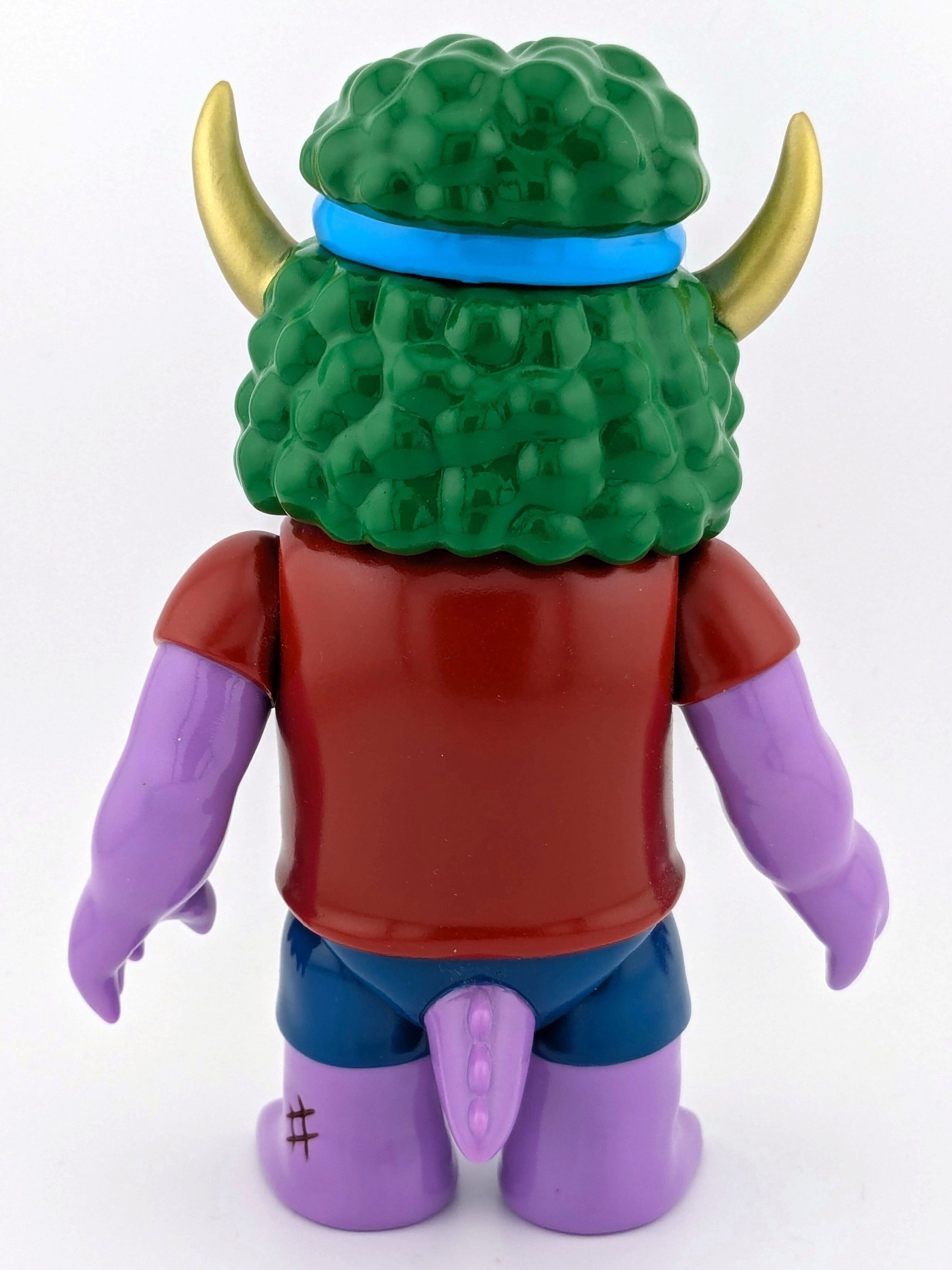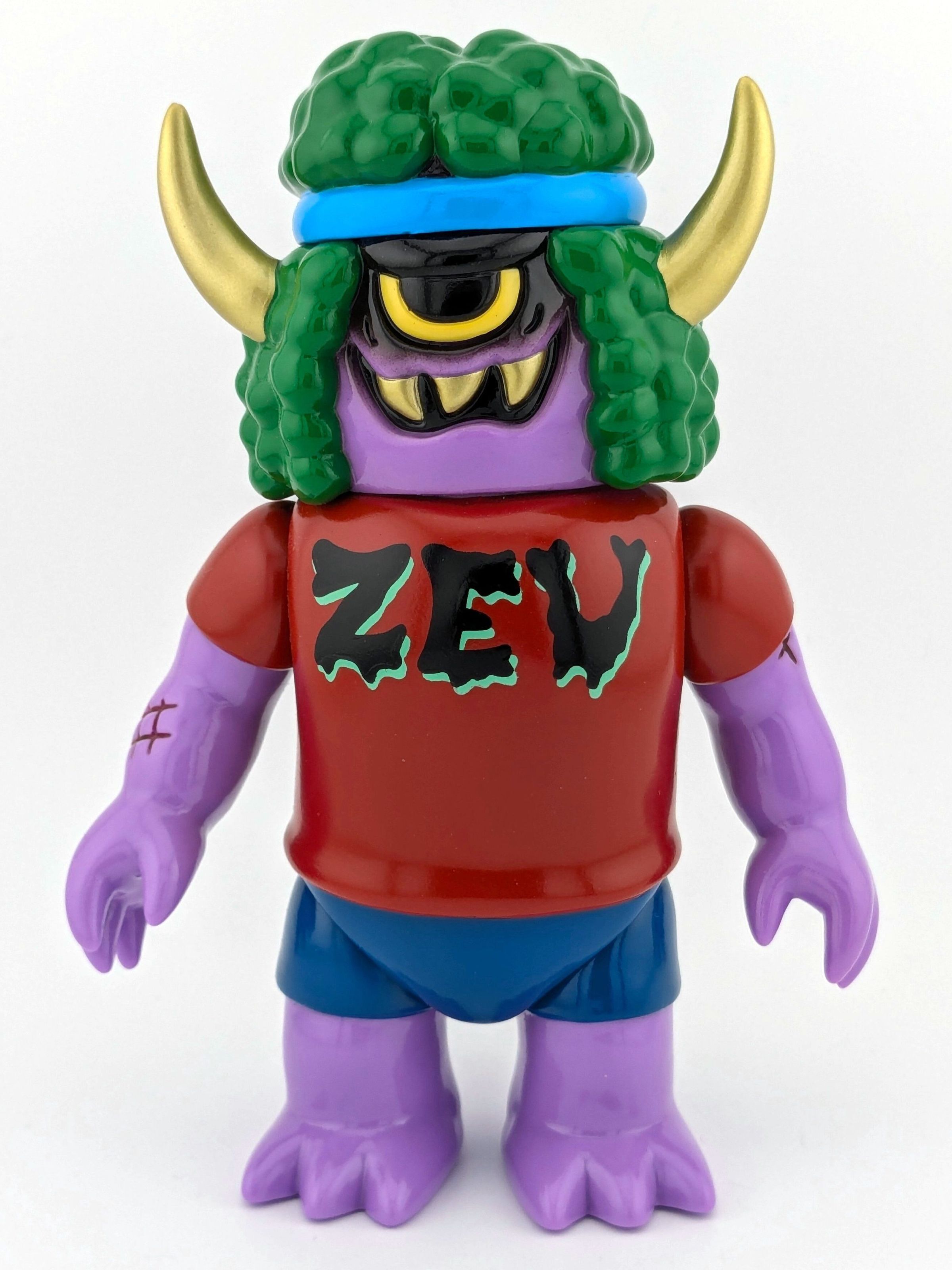 Magenta vinyl with green, turquoise, gold, black, yellow, red, and blue paint. ZEU logo on shirt.