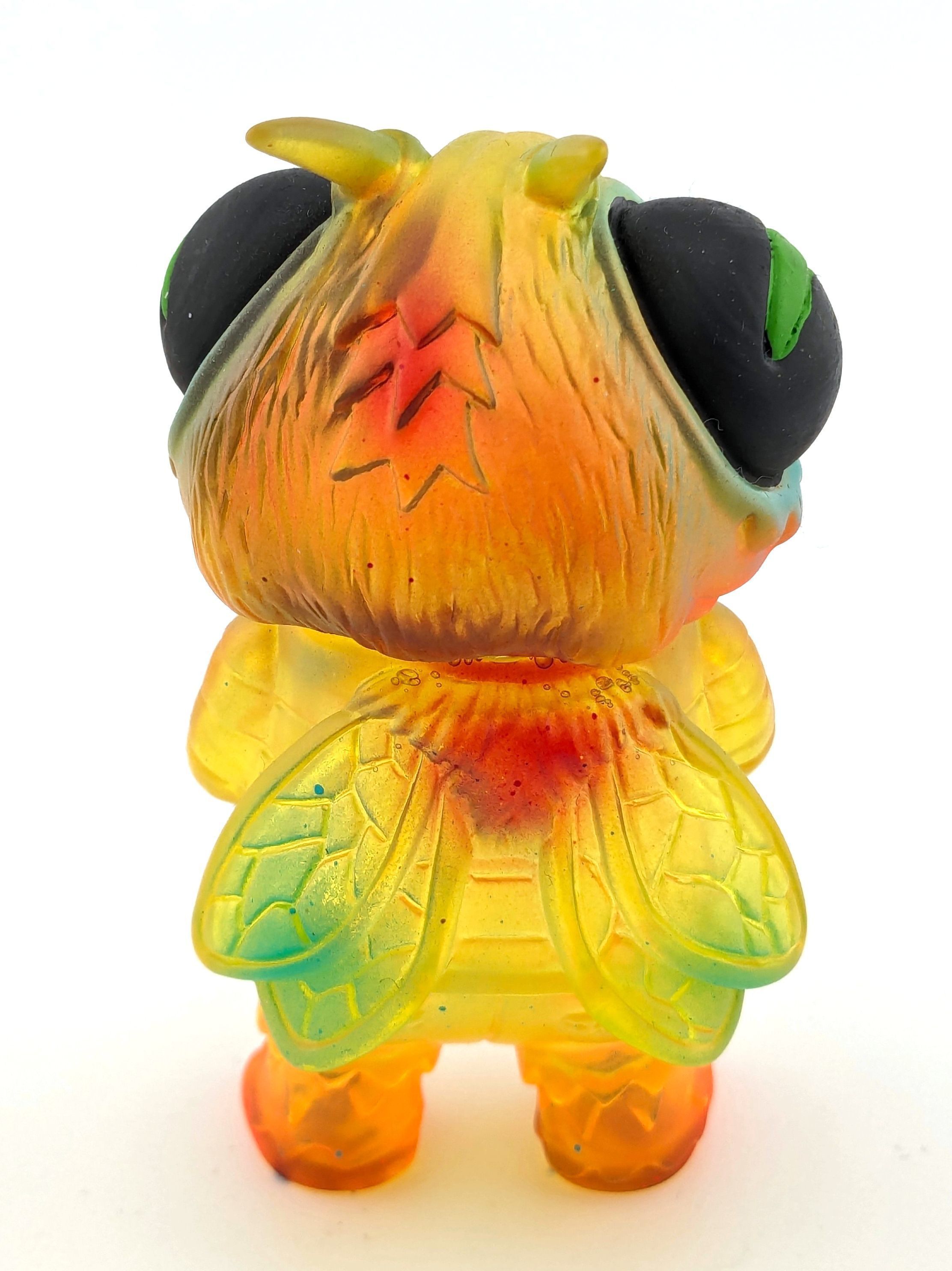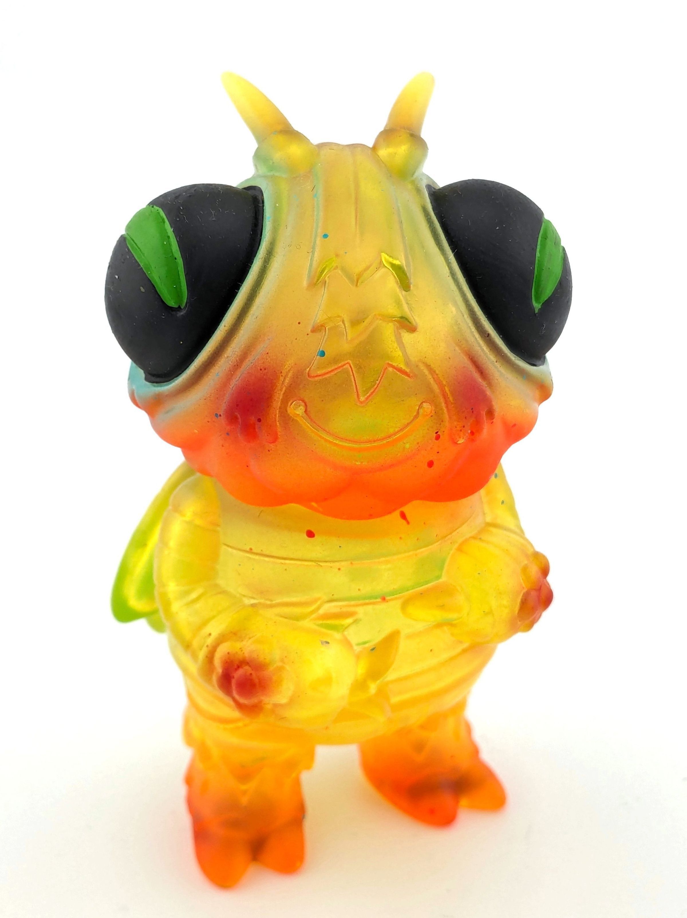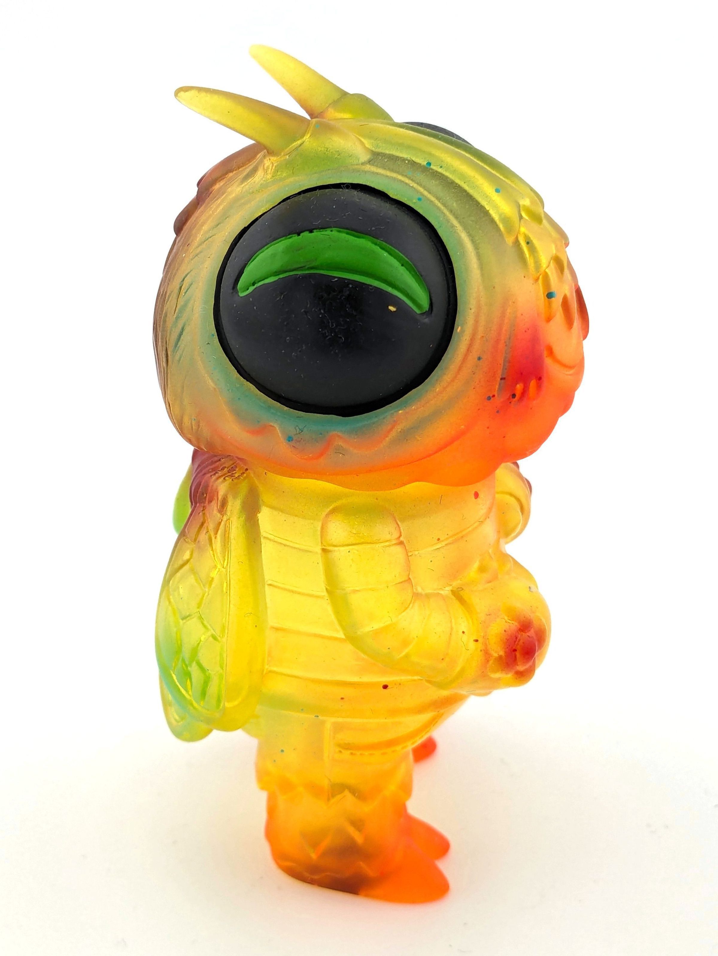 Trans yellow vinyl with orange and turquoise paint, black eyes