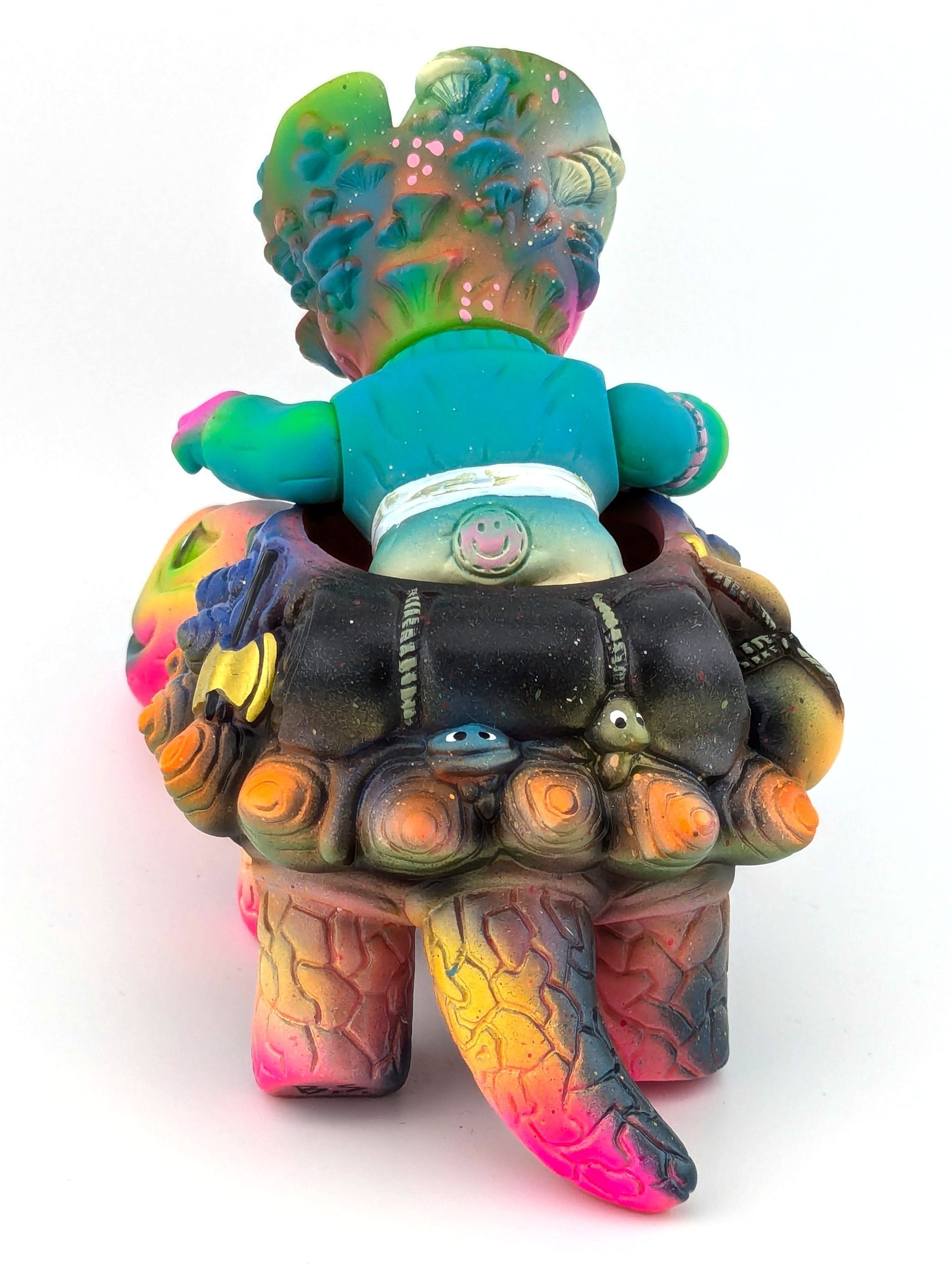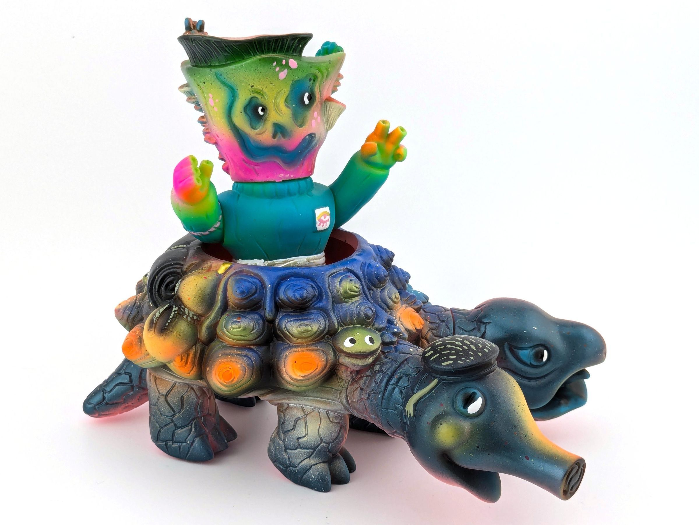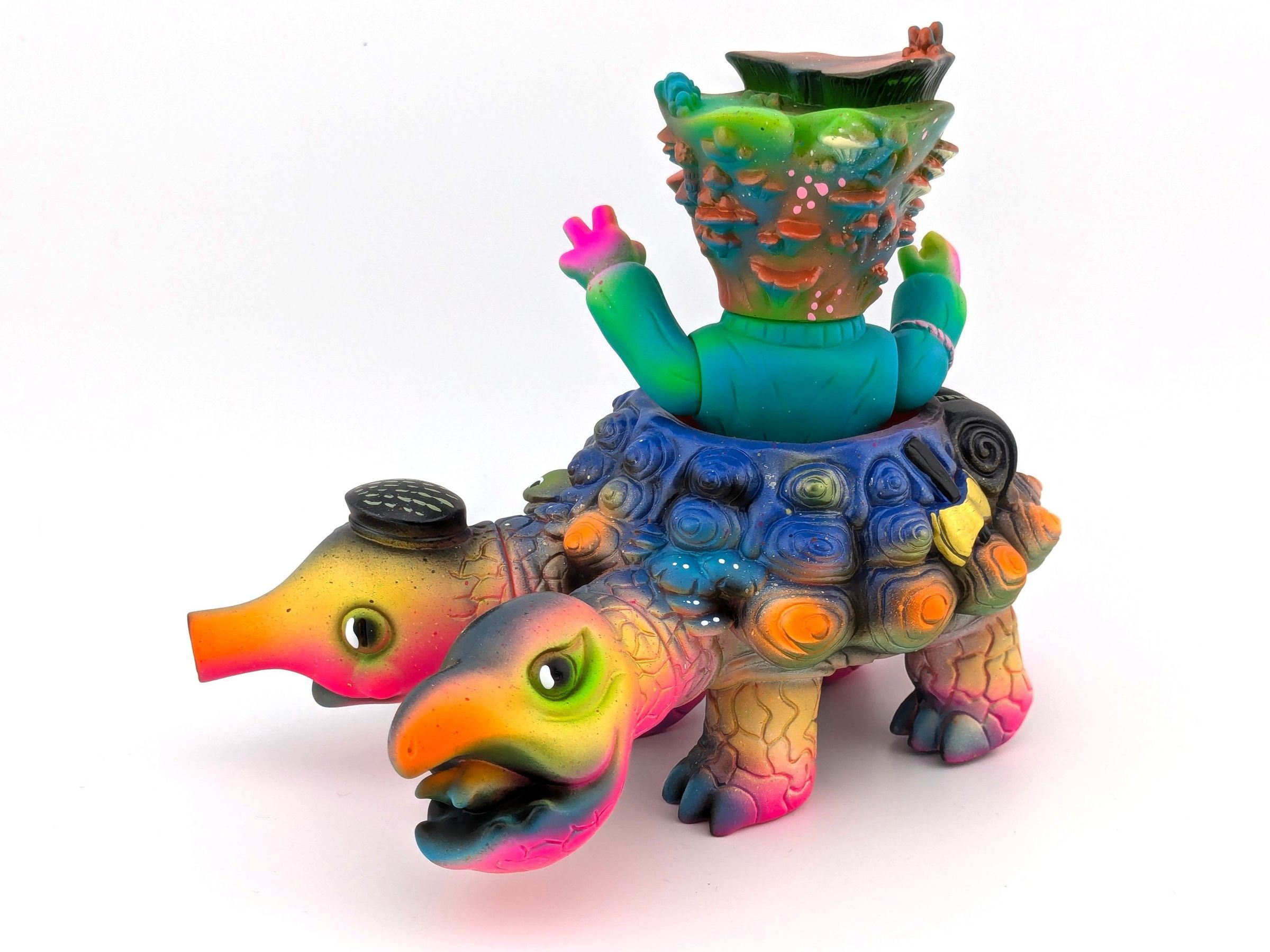 Panda: lime green vinyl with brown, teal, fluro orange, yellow, fluro pink, white, and pink paint; Chibi K&K: peach vinyl with dark blue, gold, fluro orange, black, fluro pink, yellow, and fluro green paintMade/Created