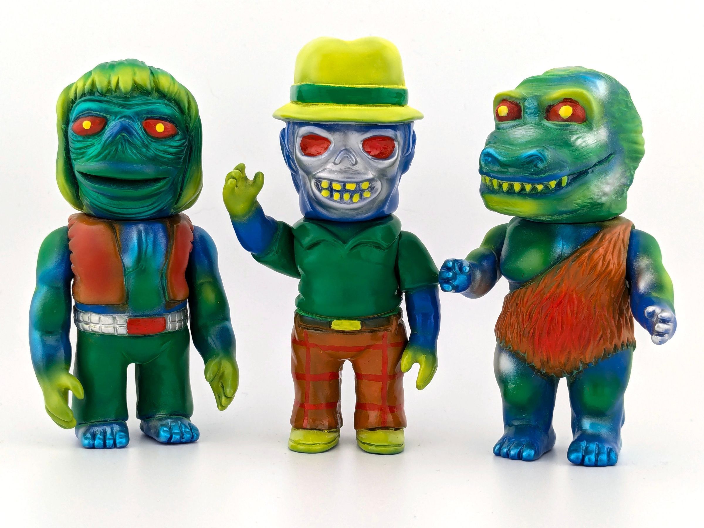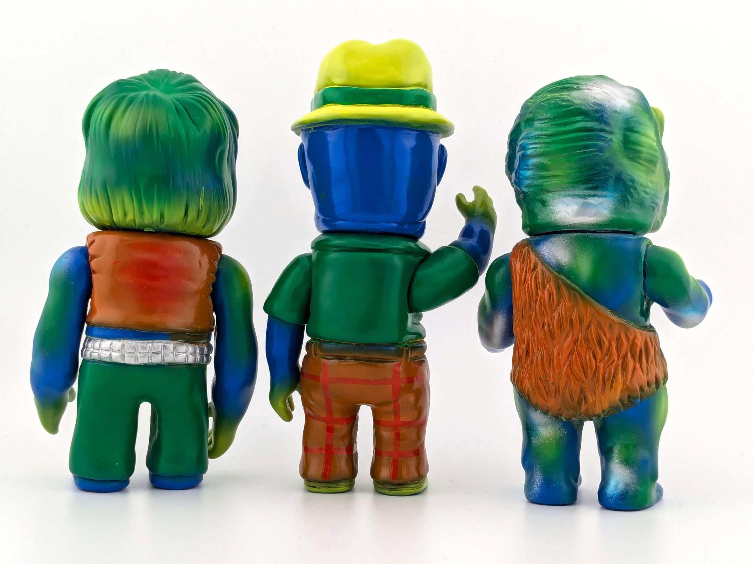 Blue vinyl with green, light green, metallic blue, metallic green, silver, tea, and red paint