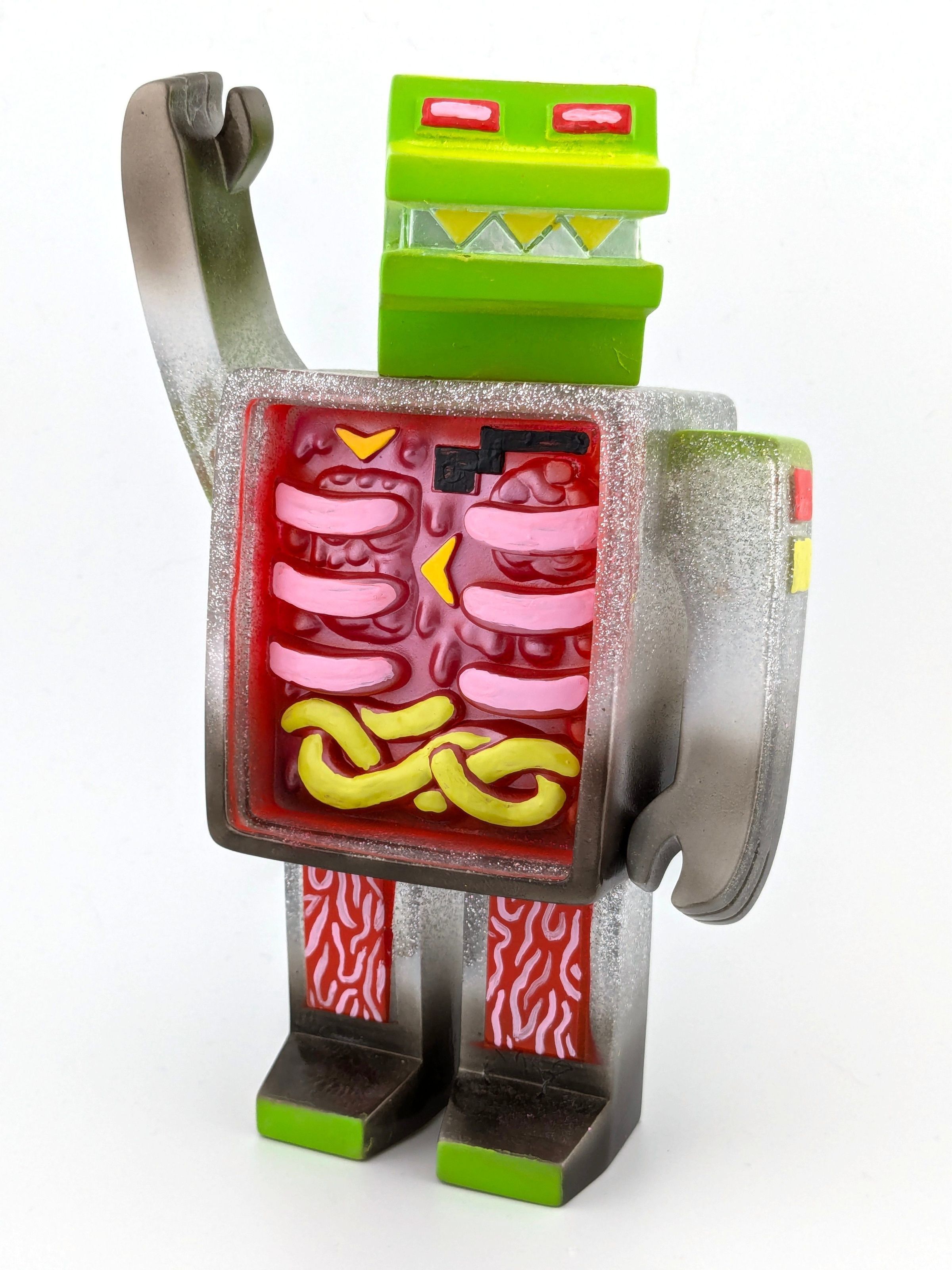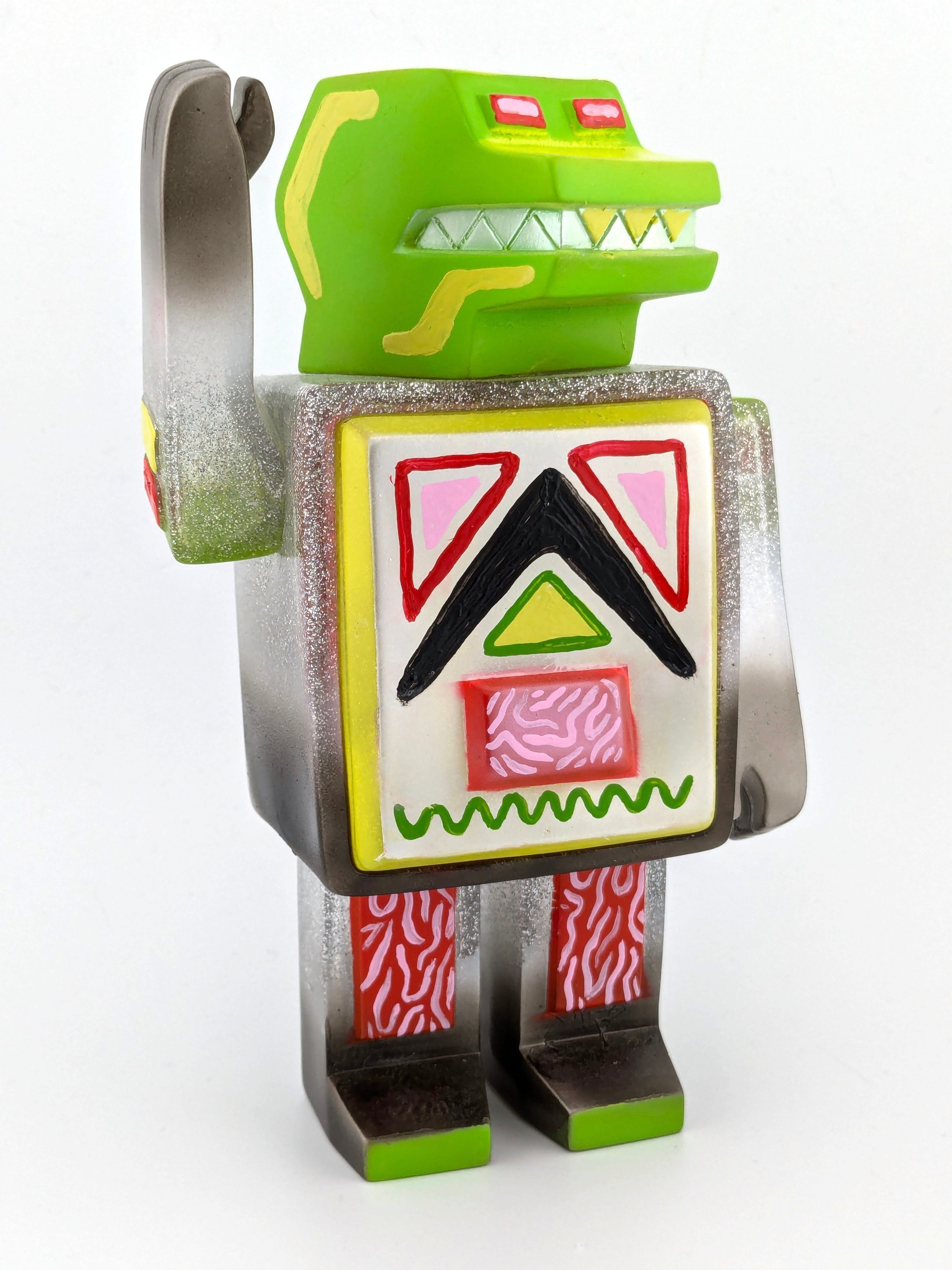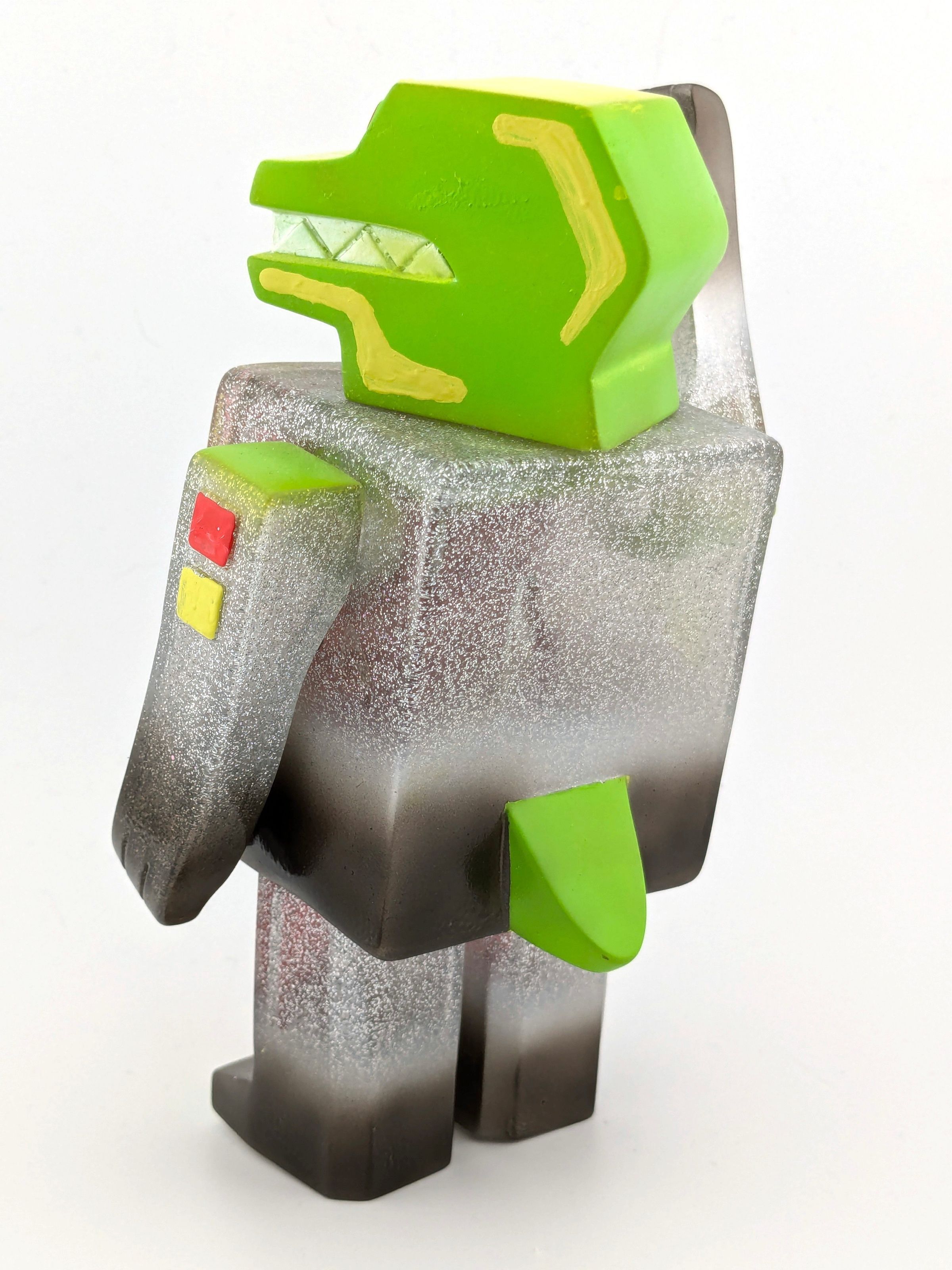 Silver lame vinyl with green, light green, red, pink, silver, gunmetal, and black paint