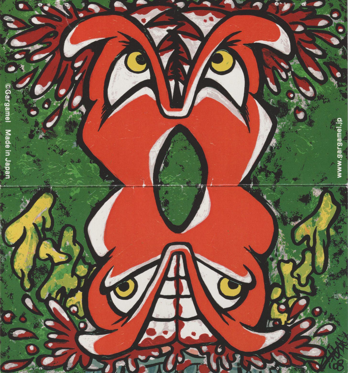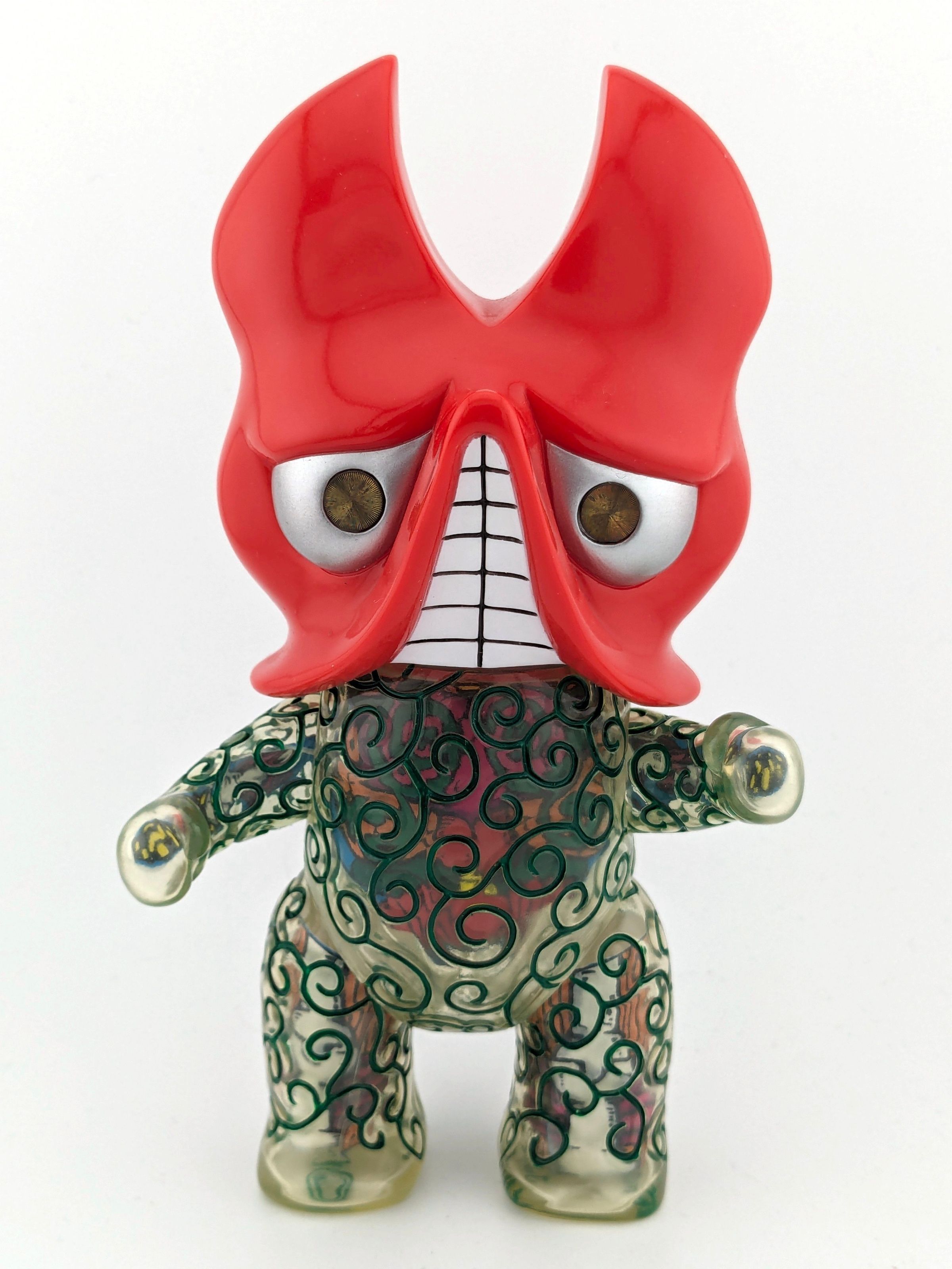 Red and clear vinyl with silver, white, black, and green paint. Includes metal disc eyes and paper guts.
