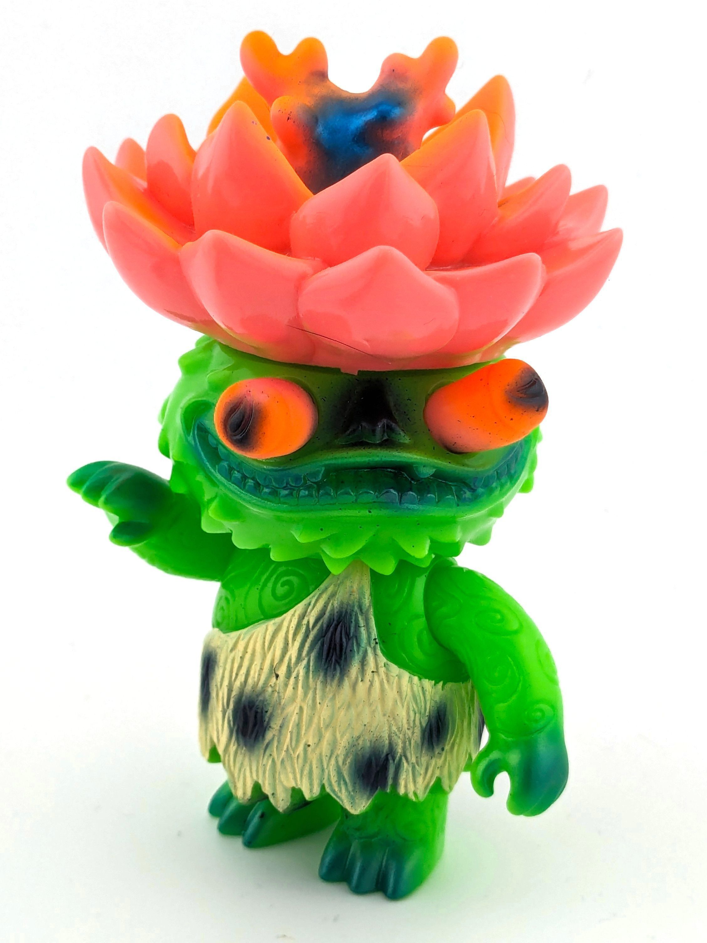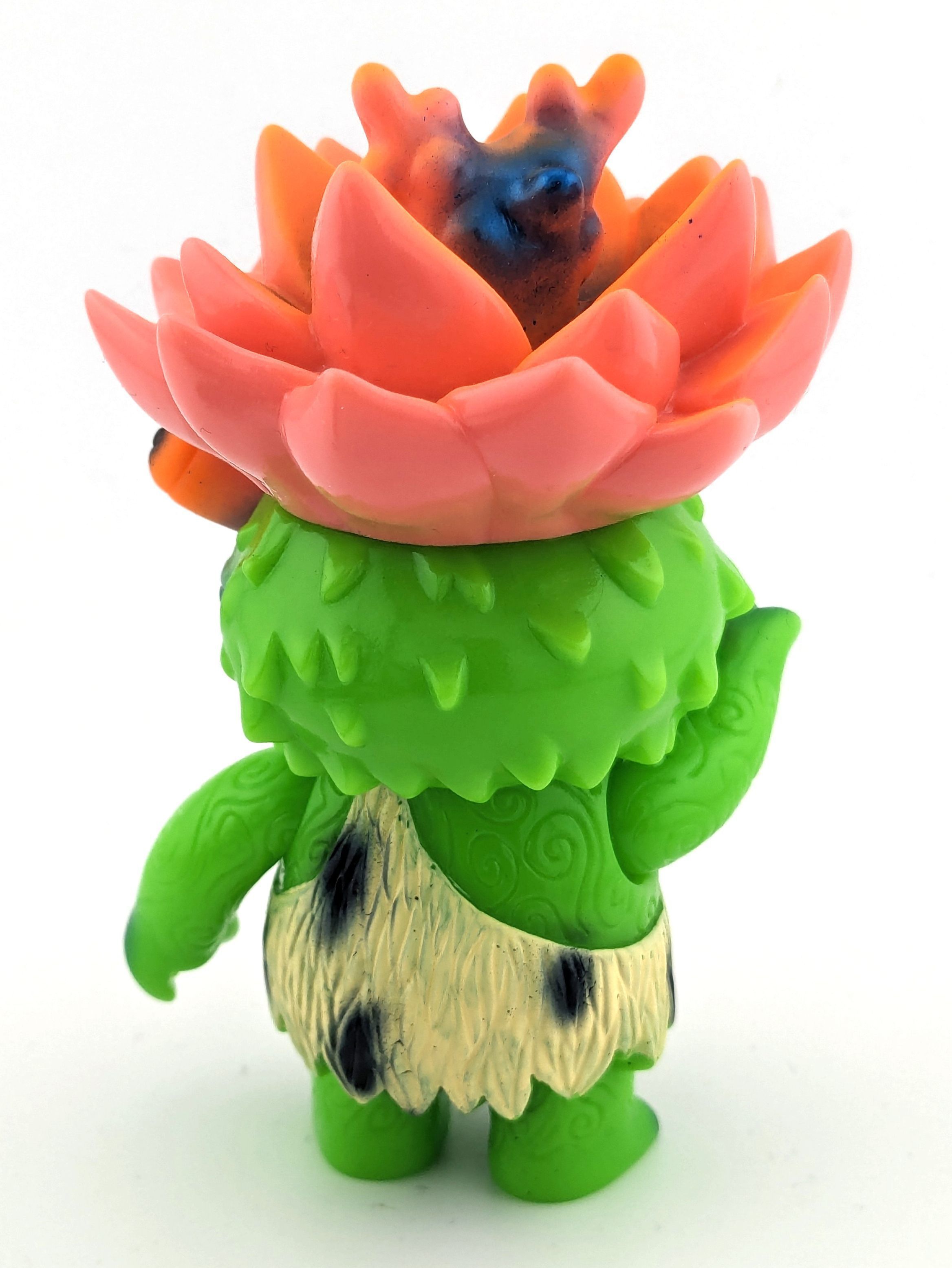 Green and peach vinyl with metallic blue, black, green, and cream paint.