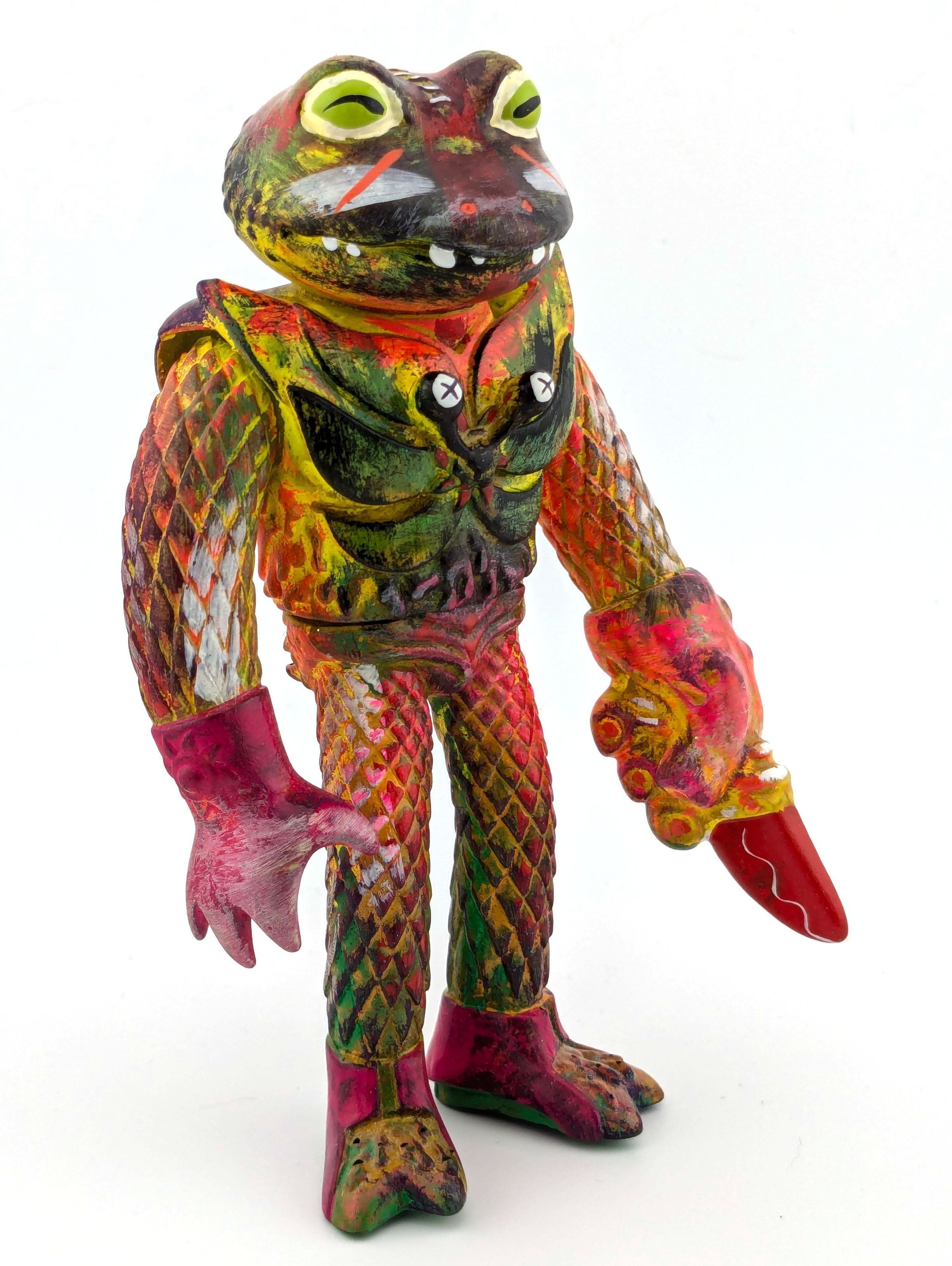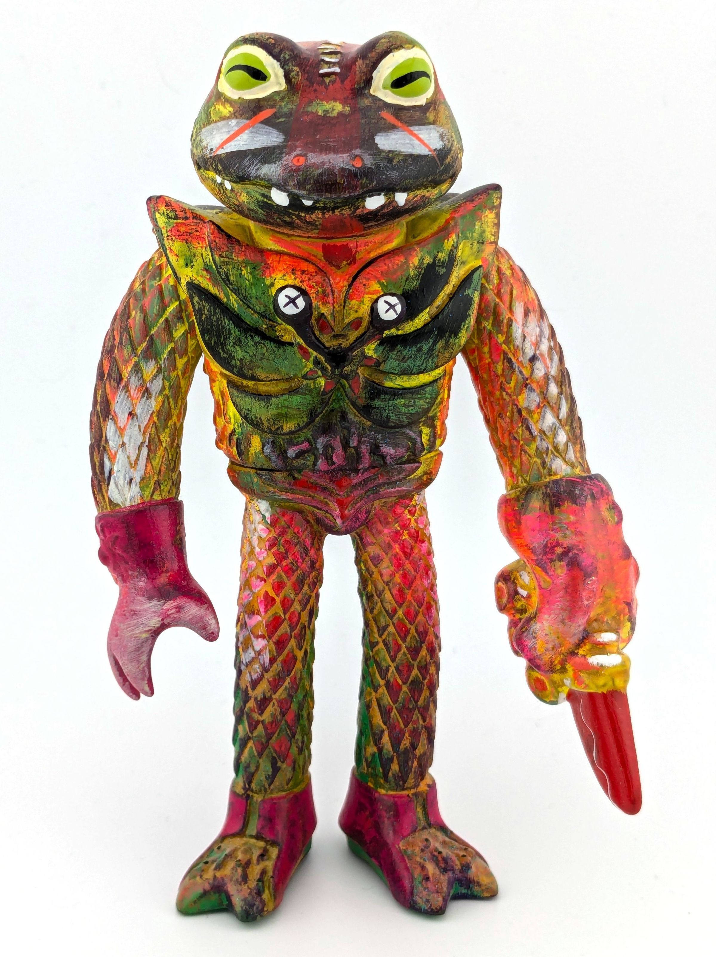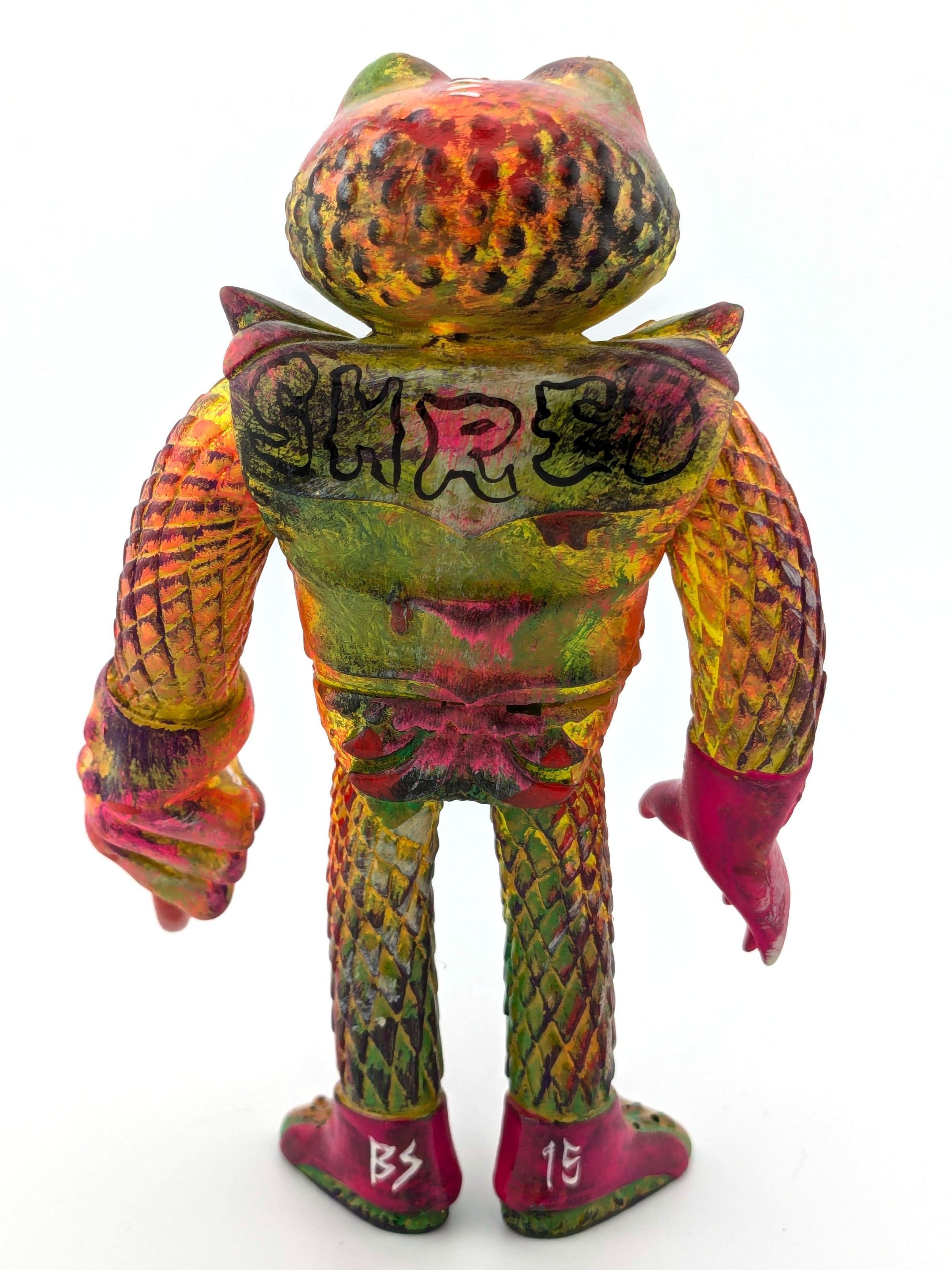 Vinyl with red, green, white, and black paint; has the word "SHRED" on the back