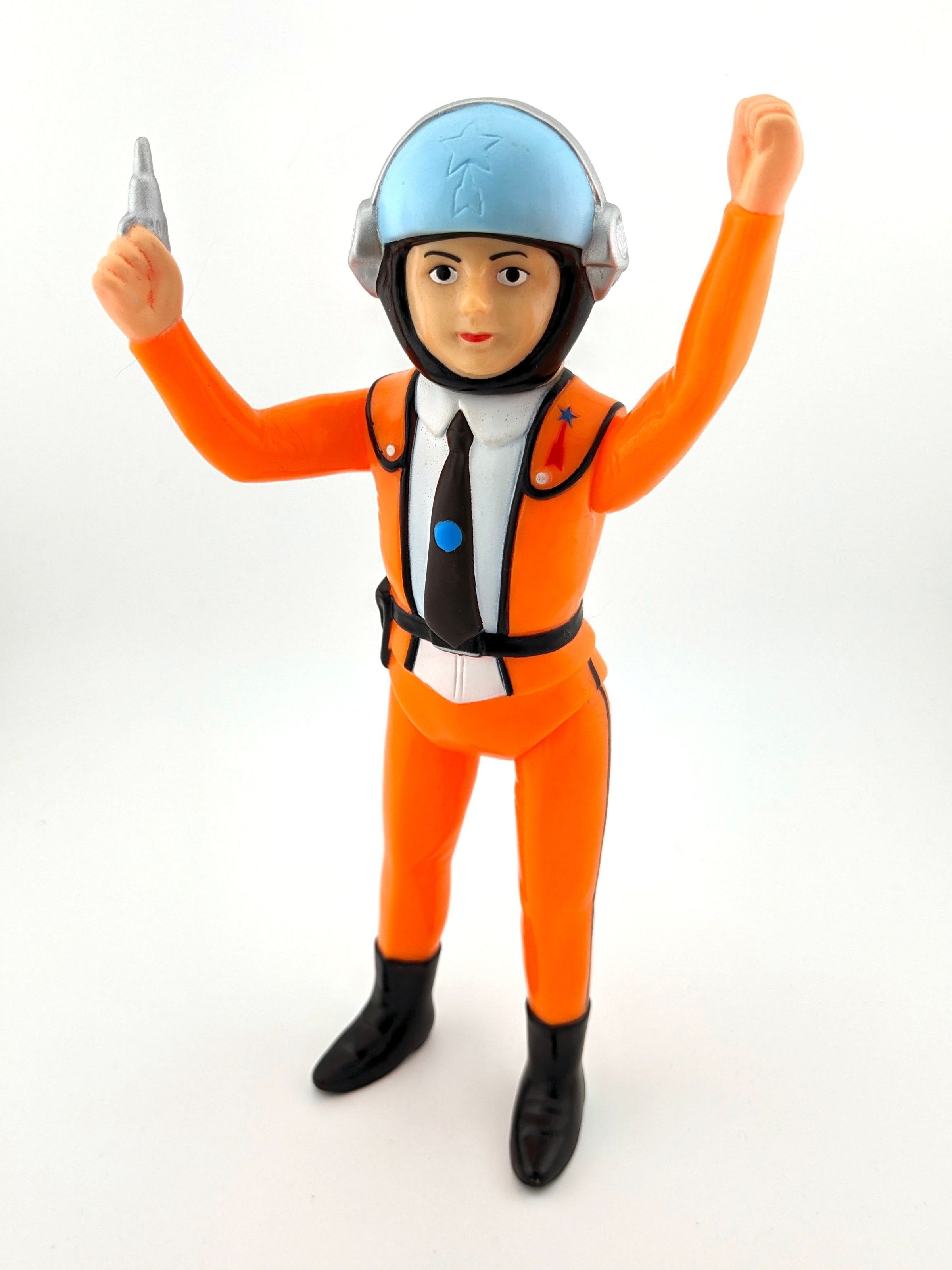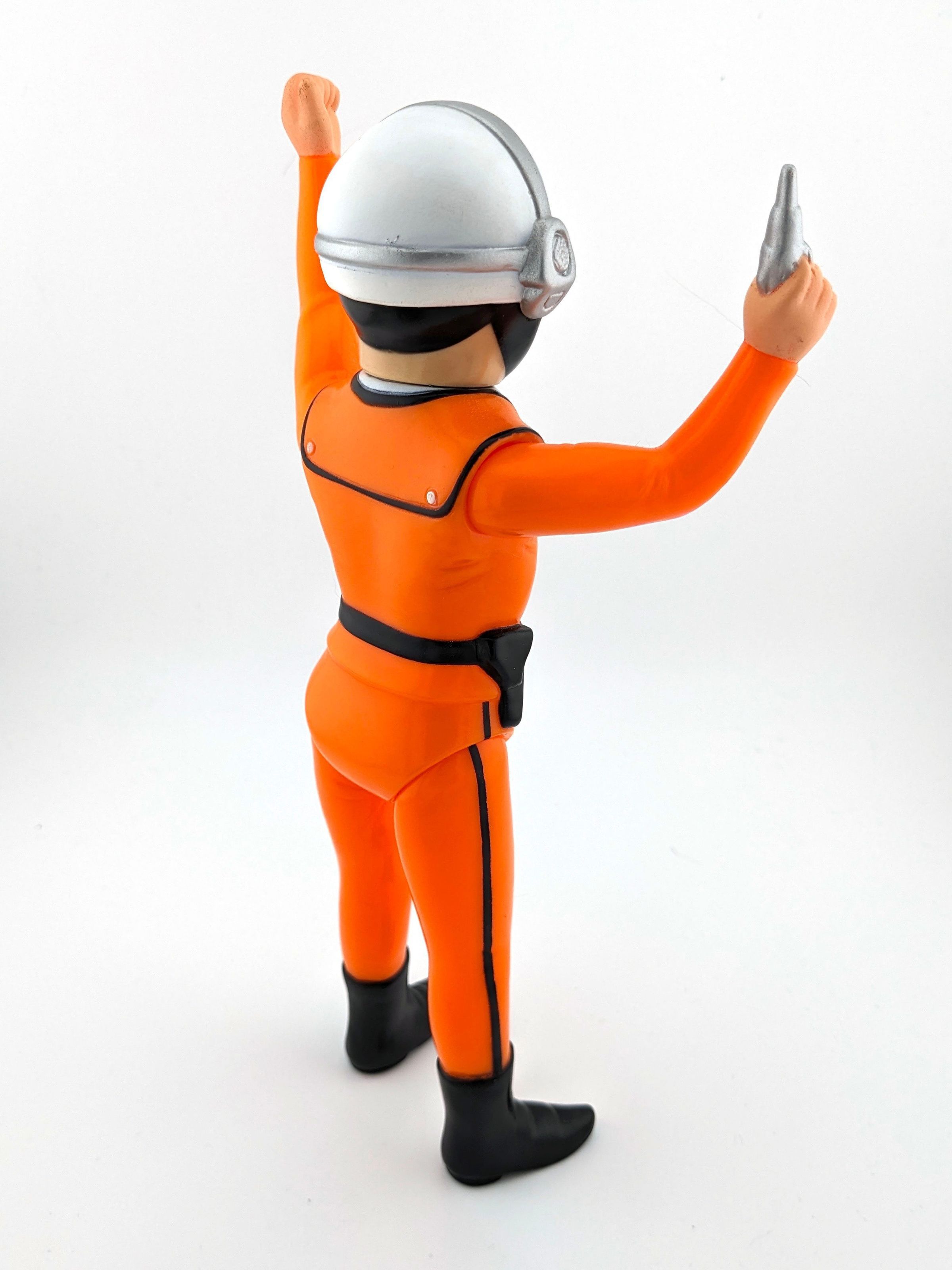 Orange vinyl with flesh, light blue, silver, black, and white paint