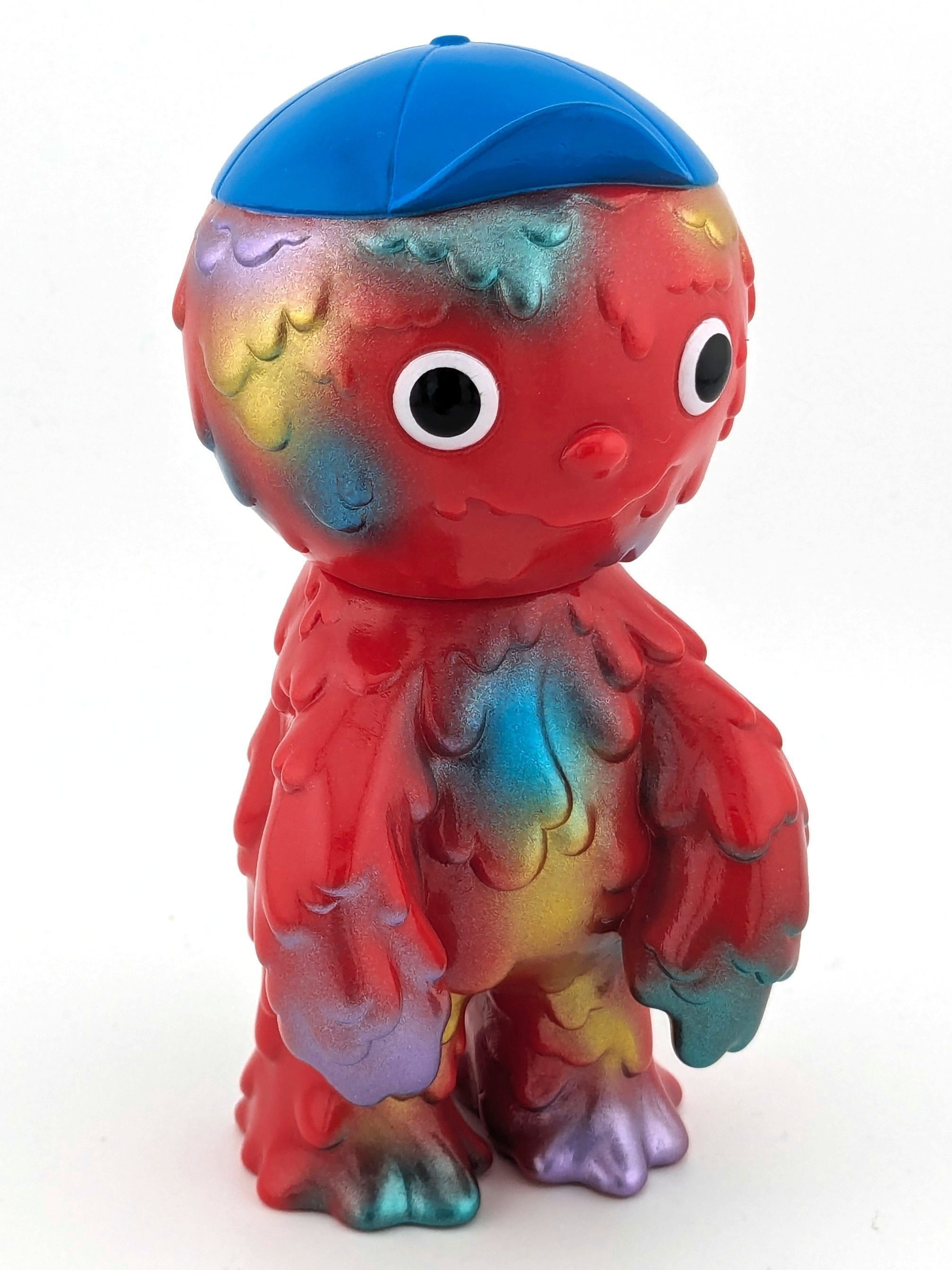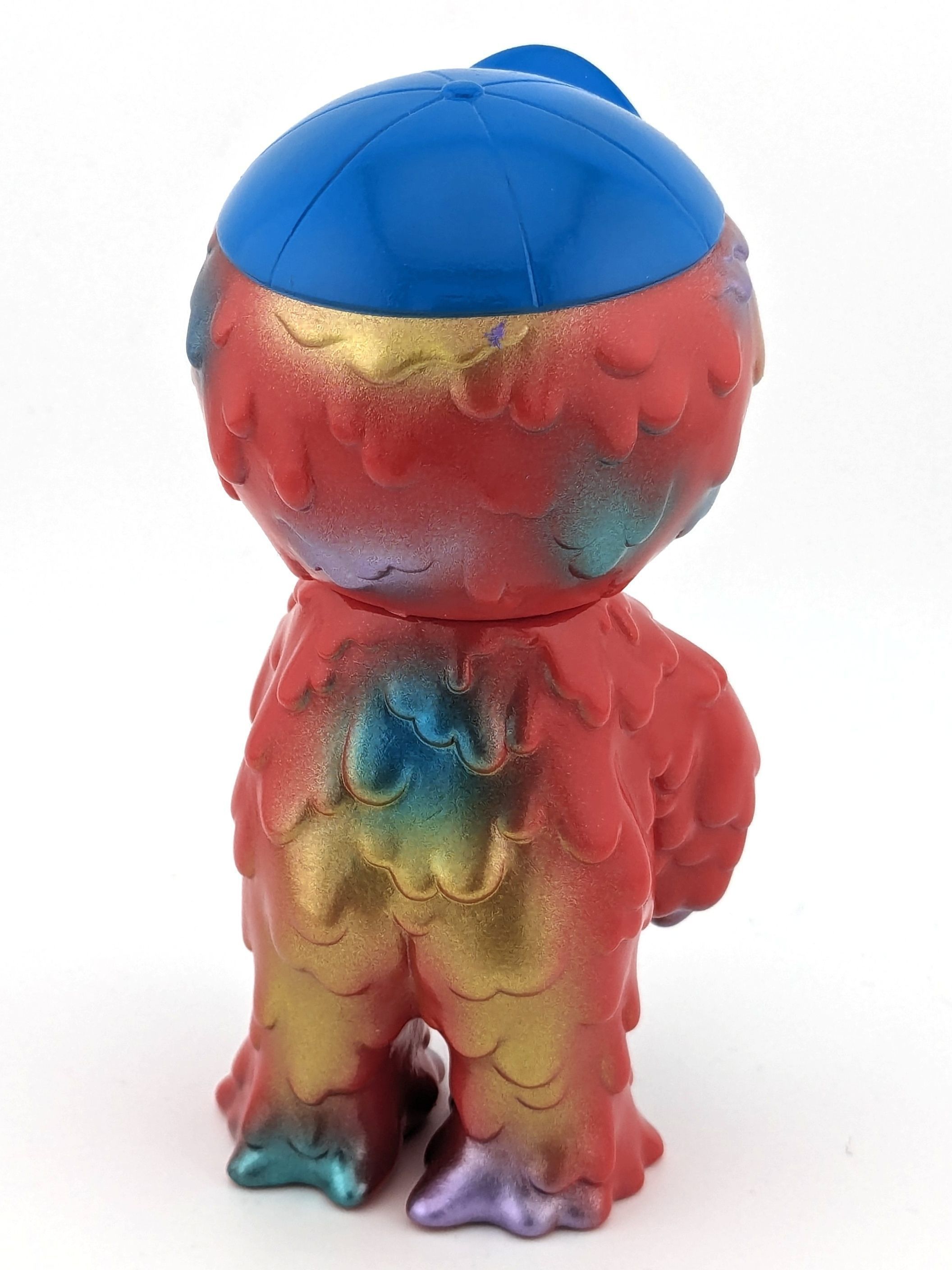 Red vinyl with blue, black, white, metallic blue, metallic green, metallic purple, and gold paint