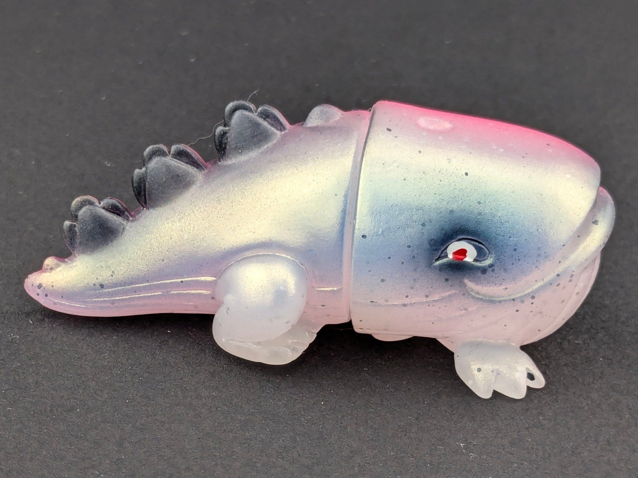 Milky lame vinyl with black, pink, silver, white, and red paint