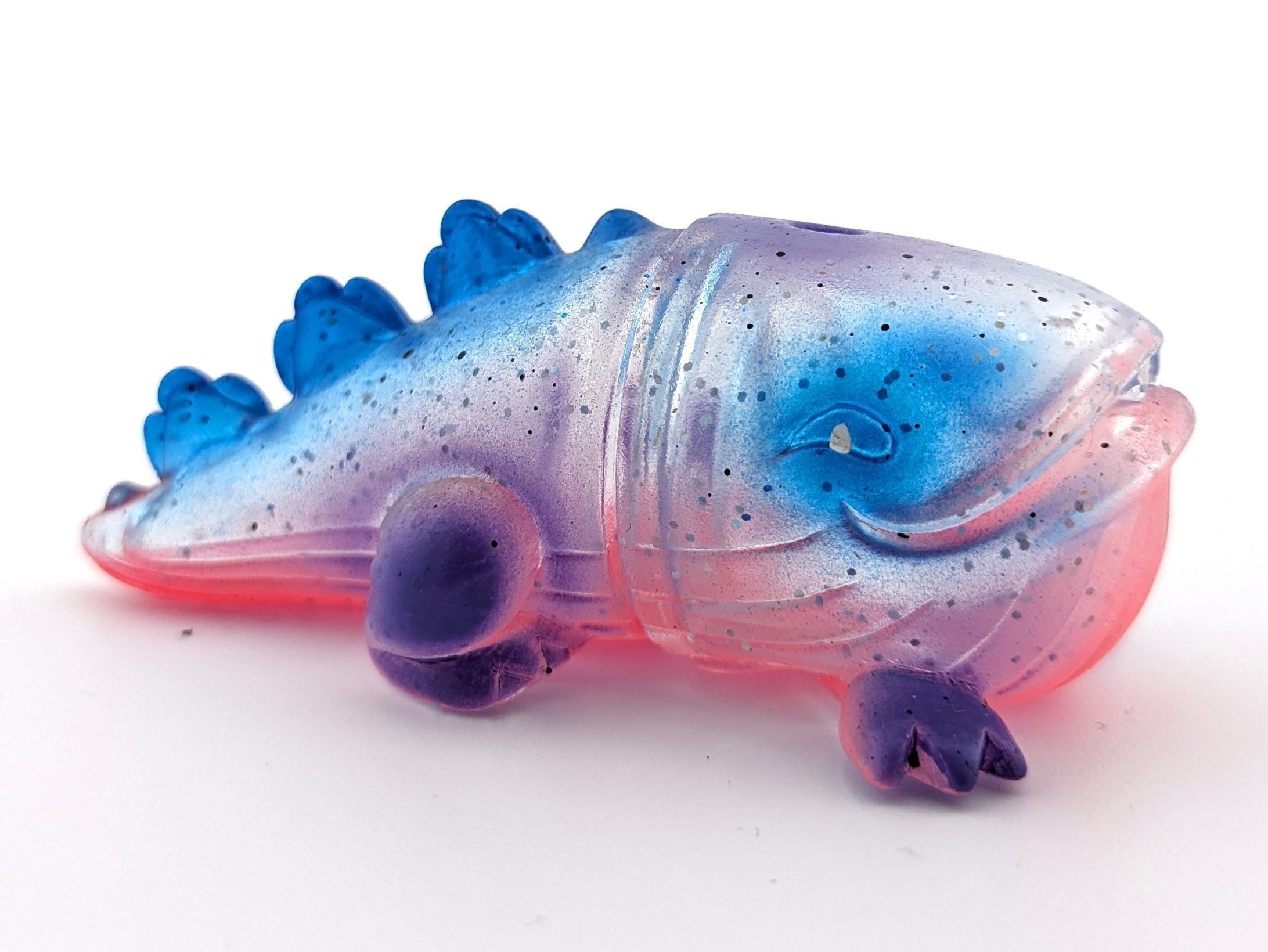 Clear sparkle vinyl with metallic blue, purple, red, and black paint