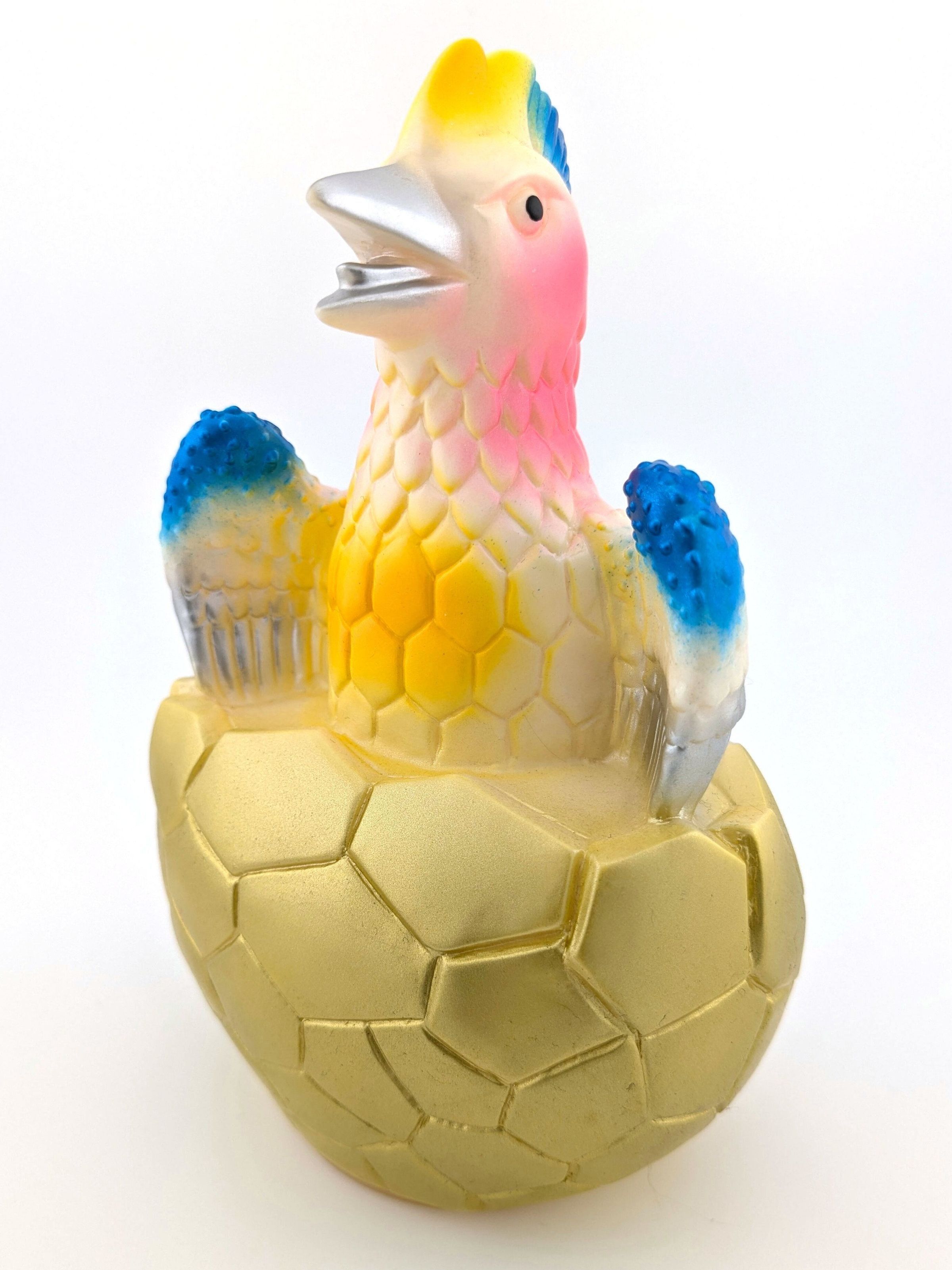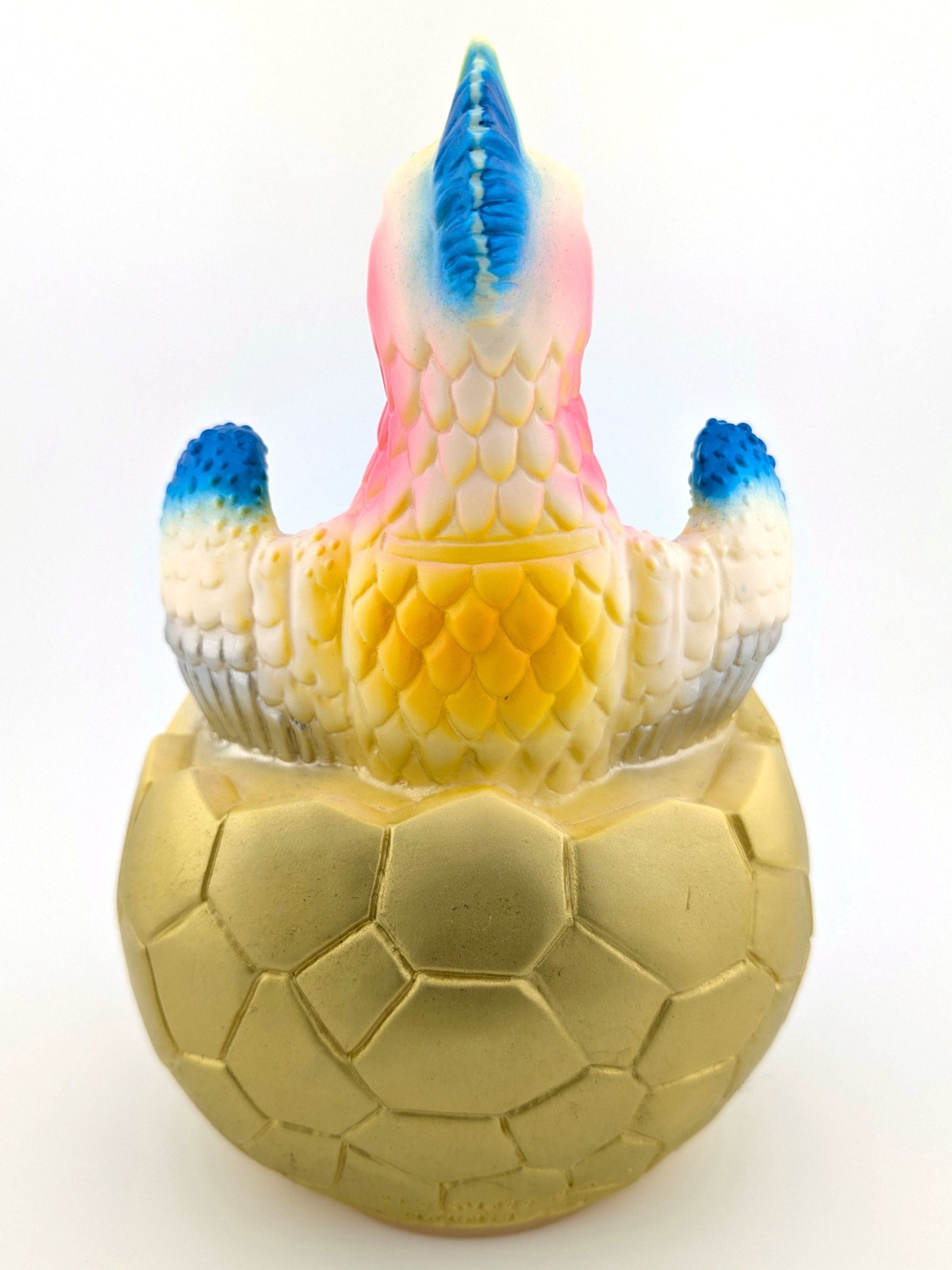 White vinyl with gold, blue, yellow, pink, and silver paint