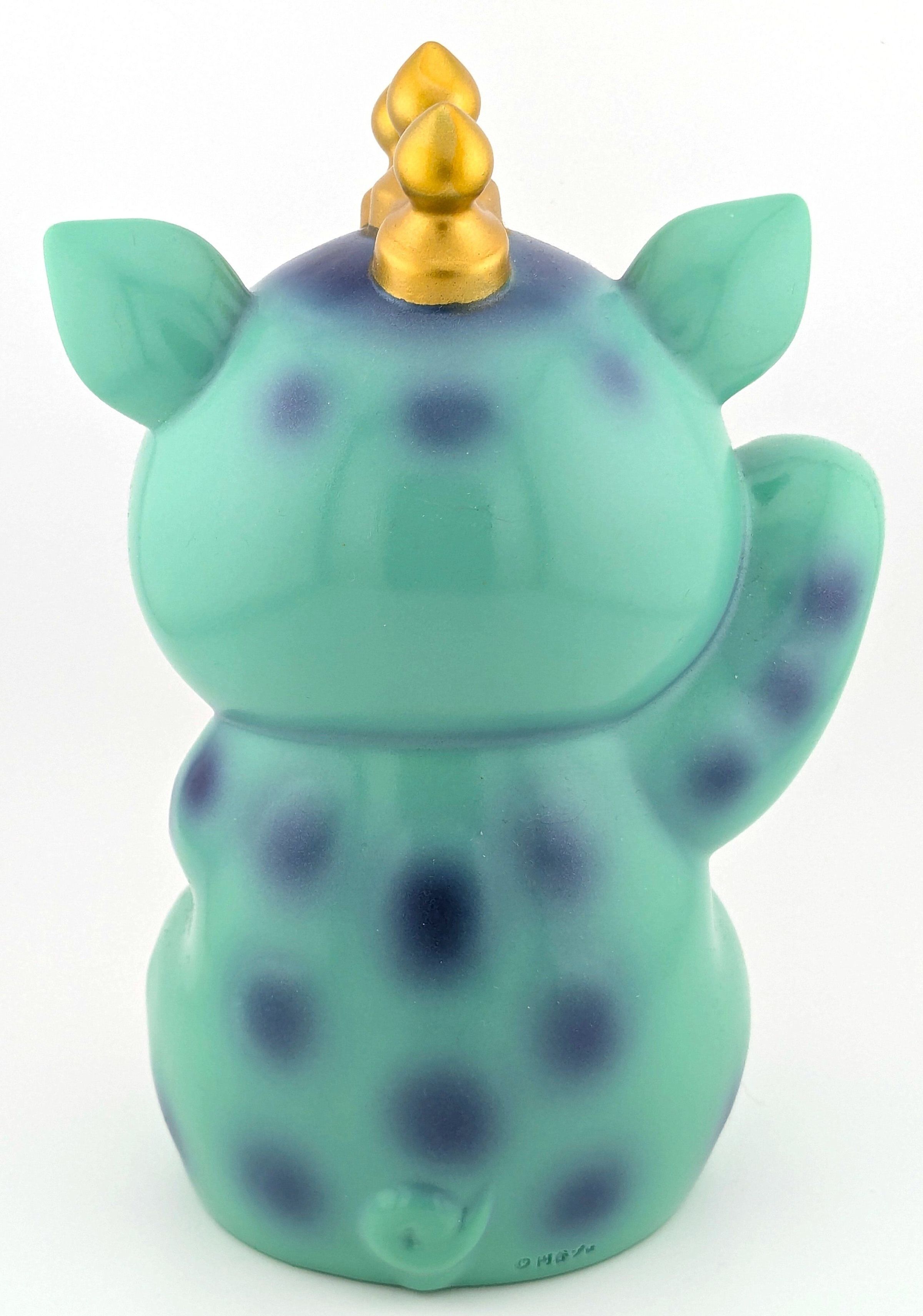 Teal vinyl with blue, gold, cream, black, and white paint