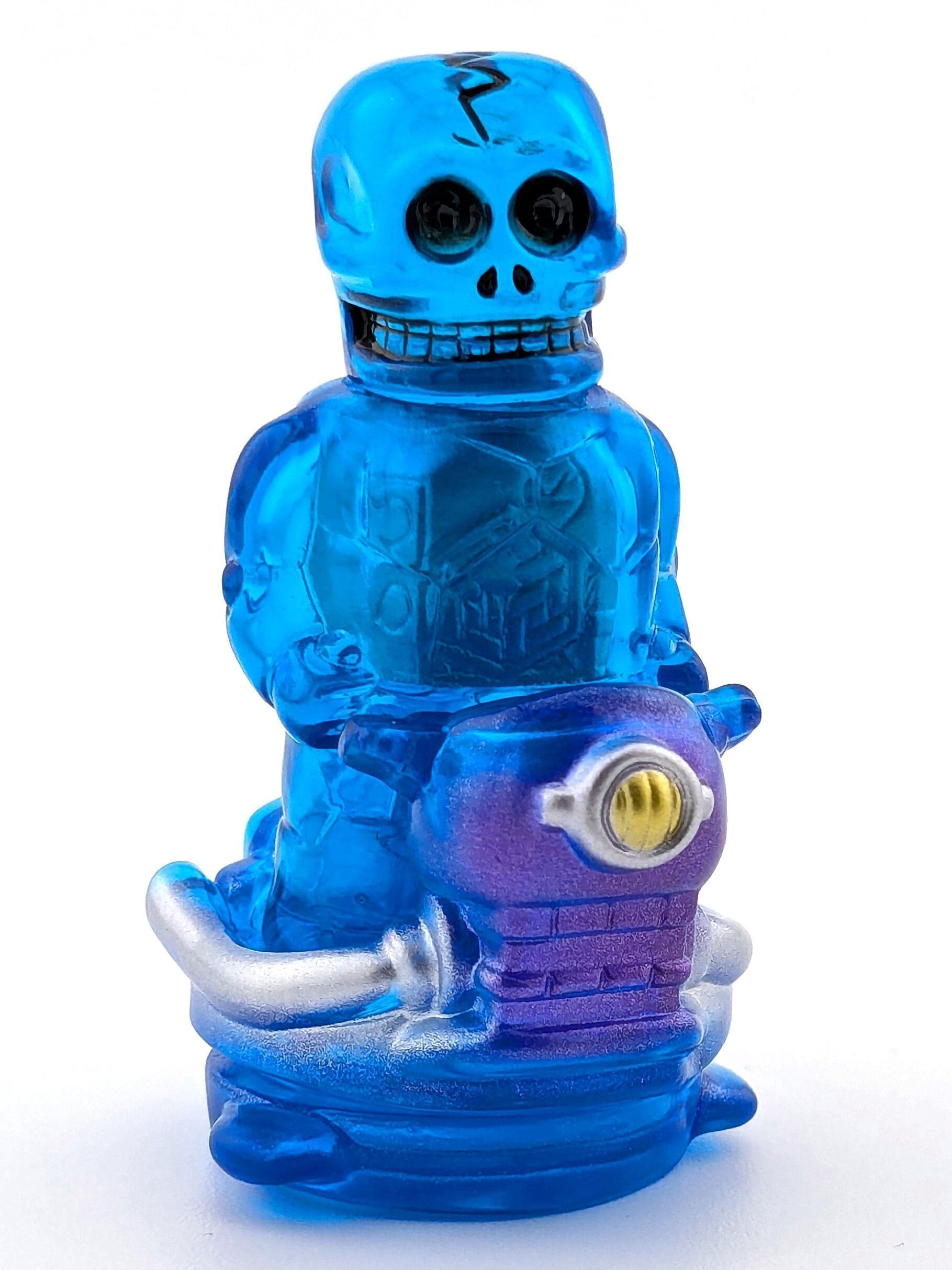 Trans blue vinyl with silver, gold, purple, and black paint.