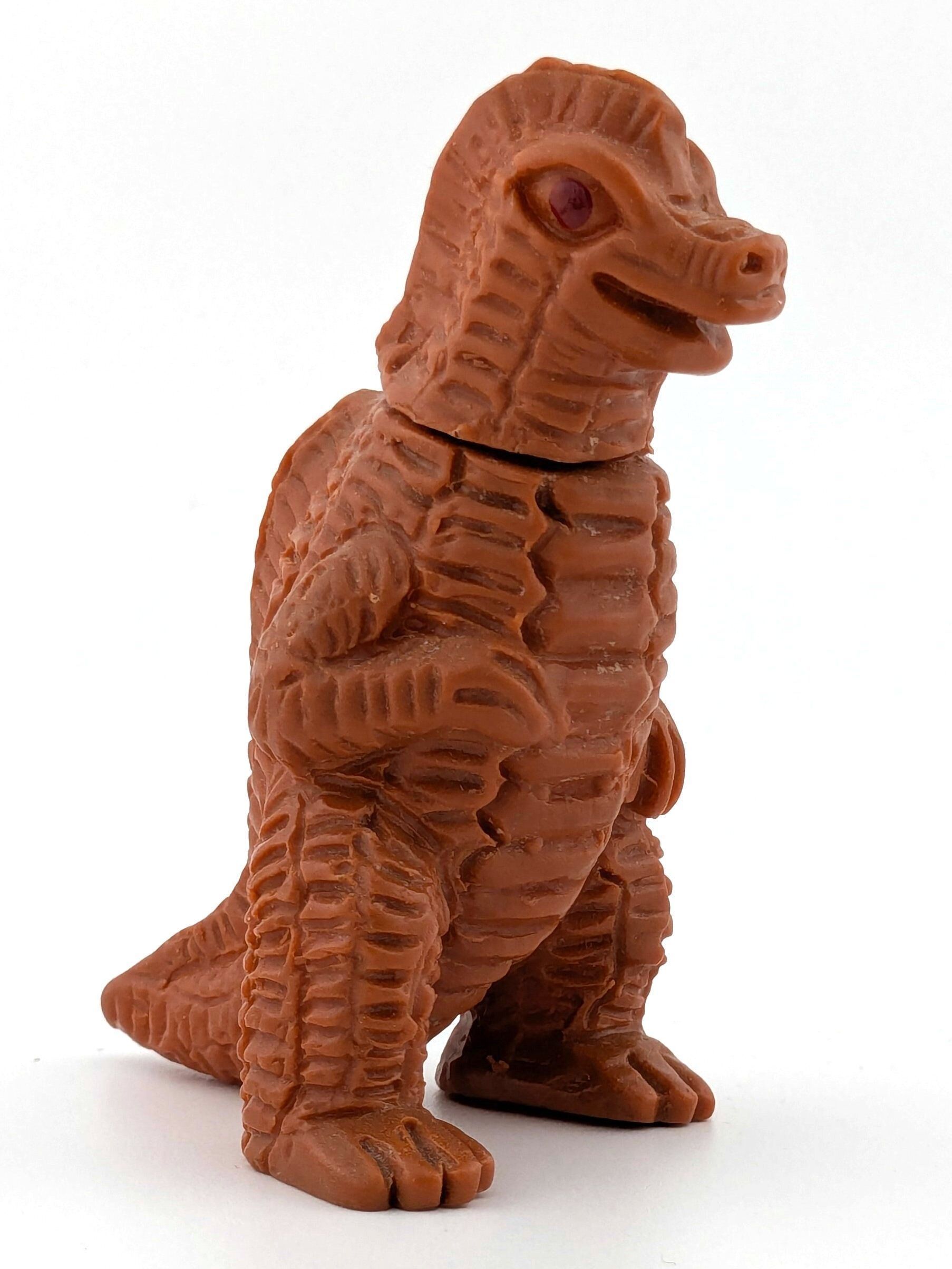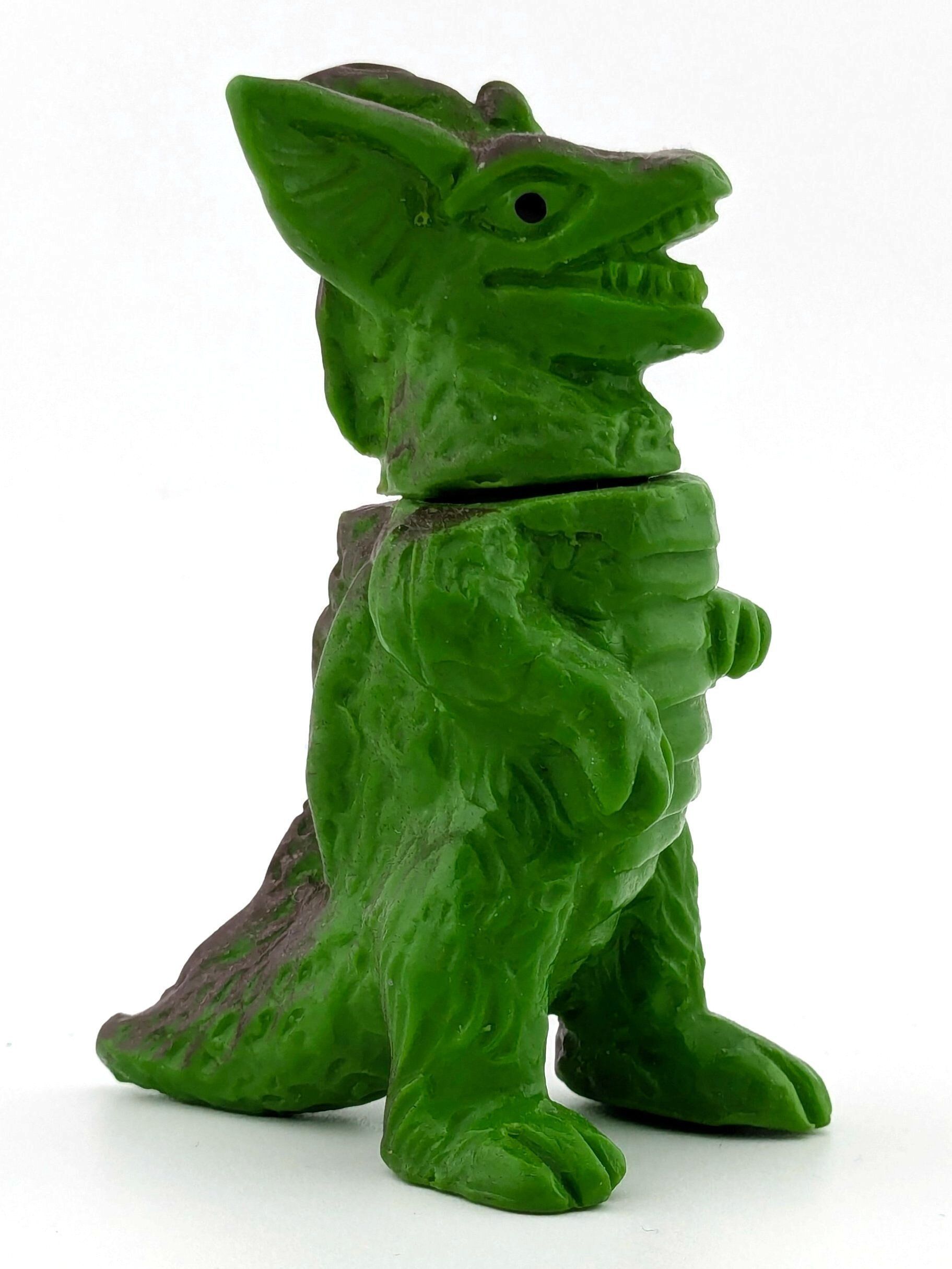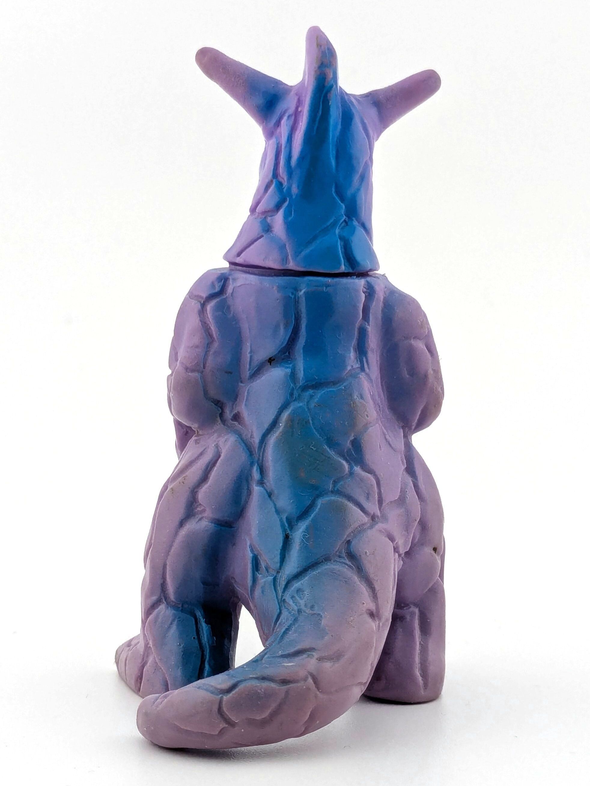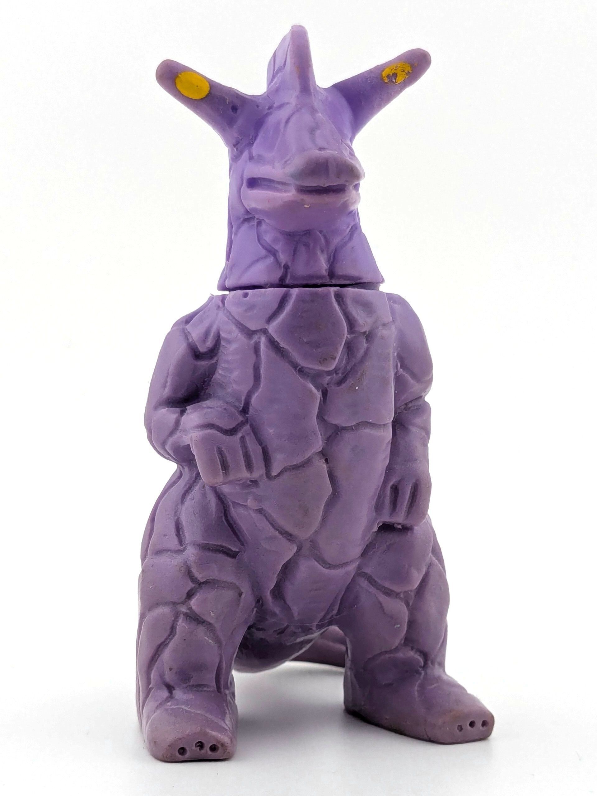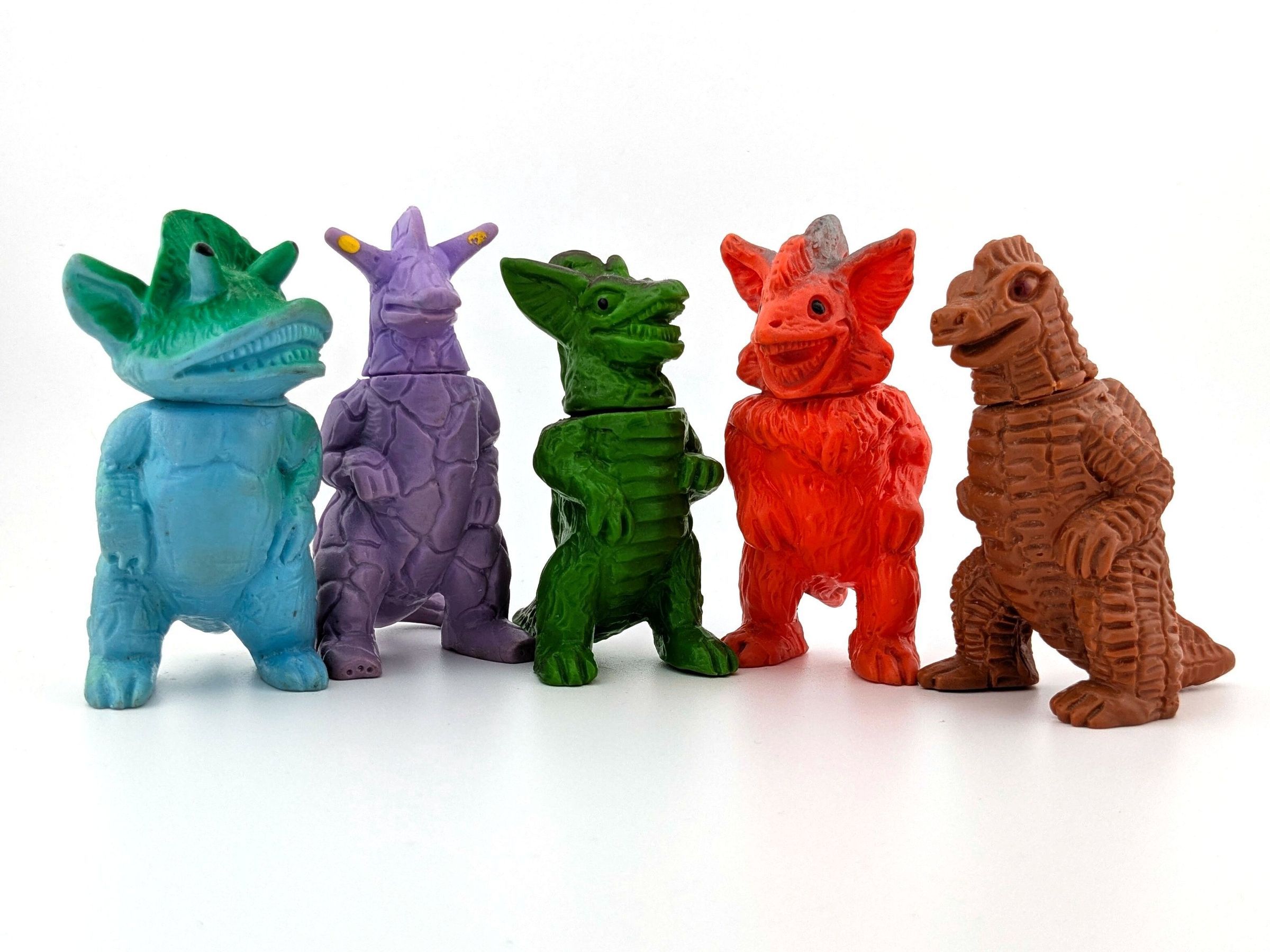 Five two piece toys. Knock offs of genuine kaiju. Purple, teal, green, red, and brown vinyl with light paint and painted eyes.General Notes