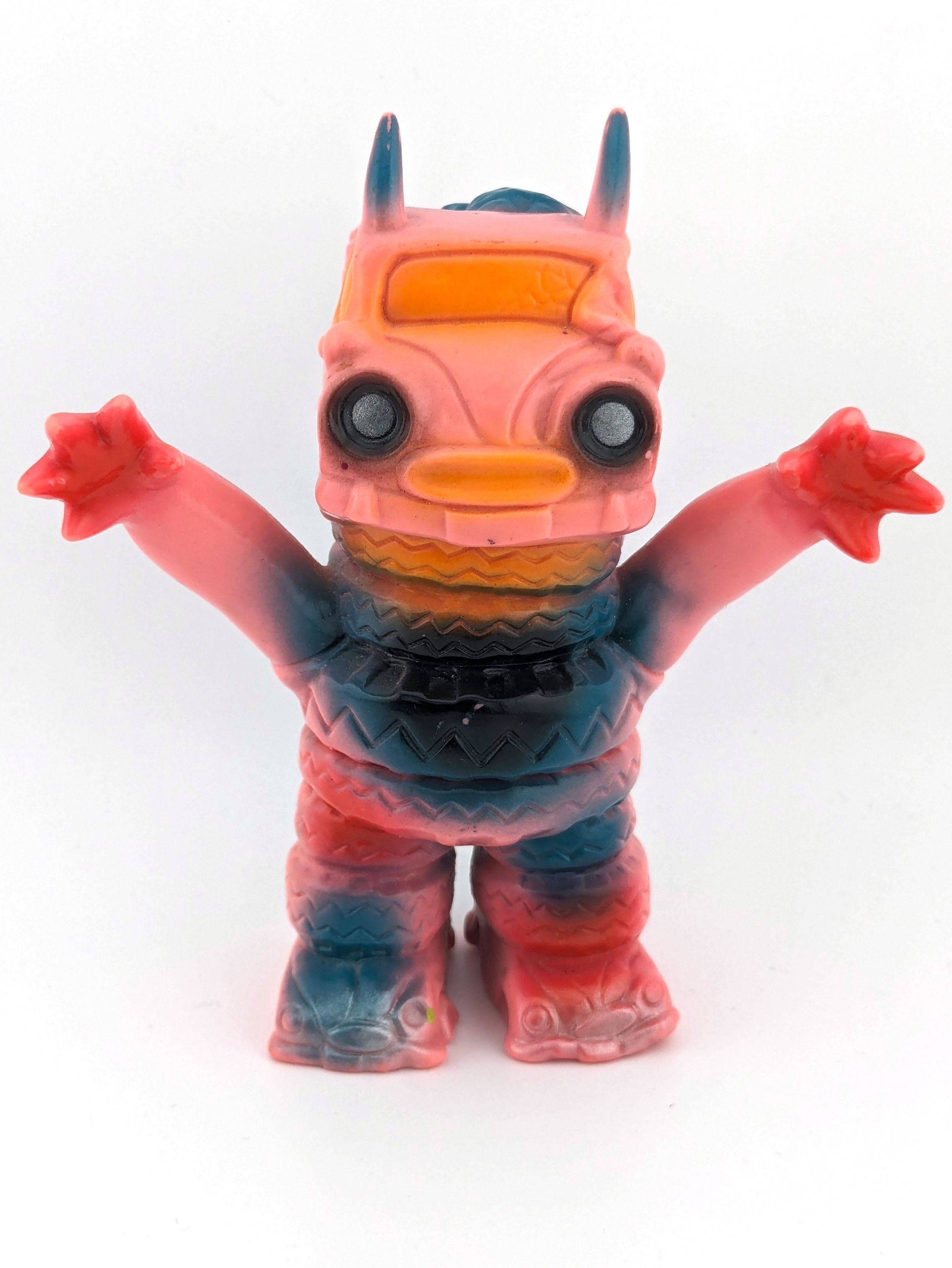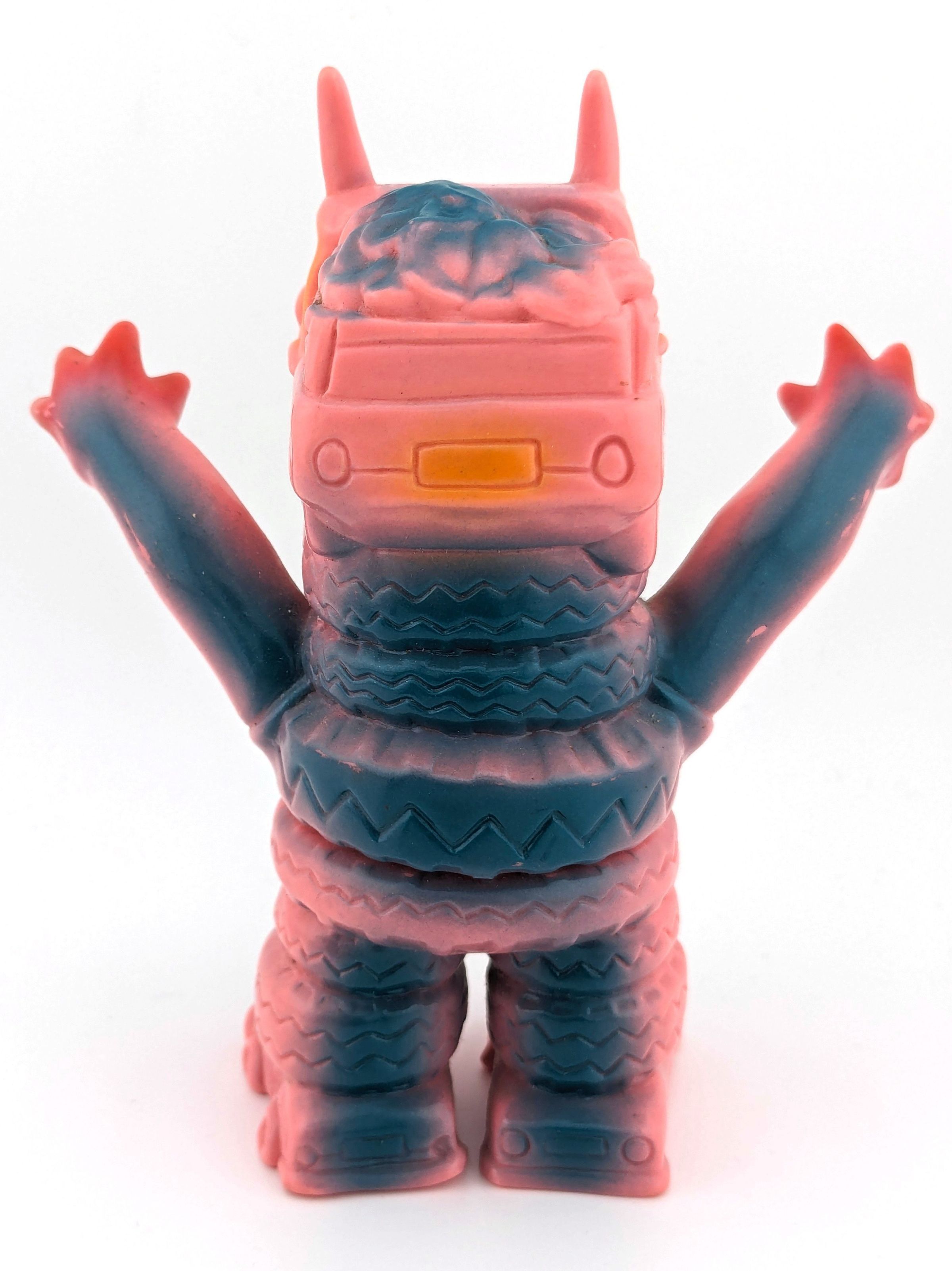 Pink vinyl with teal, metallic blue, orange, black, silver, and pink paint