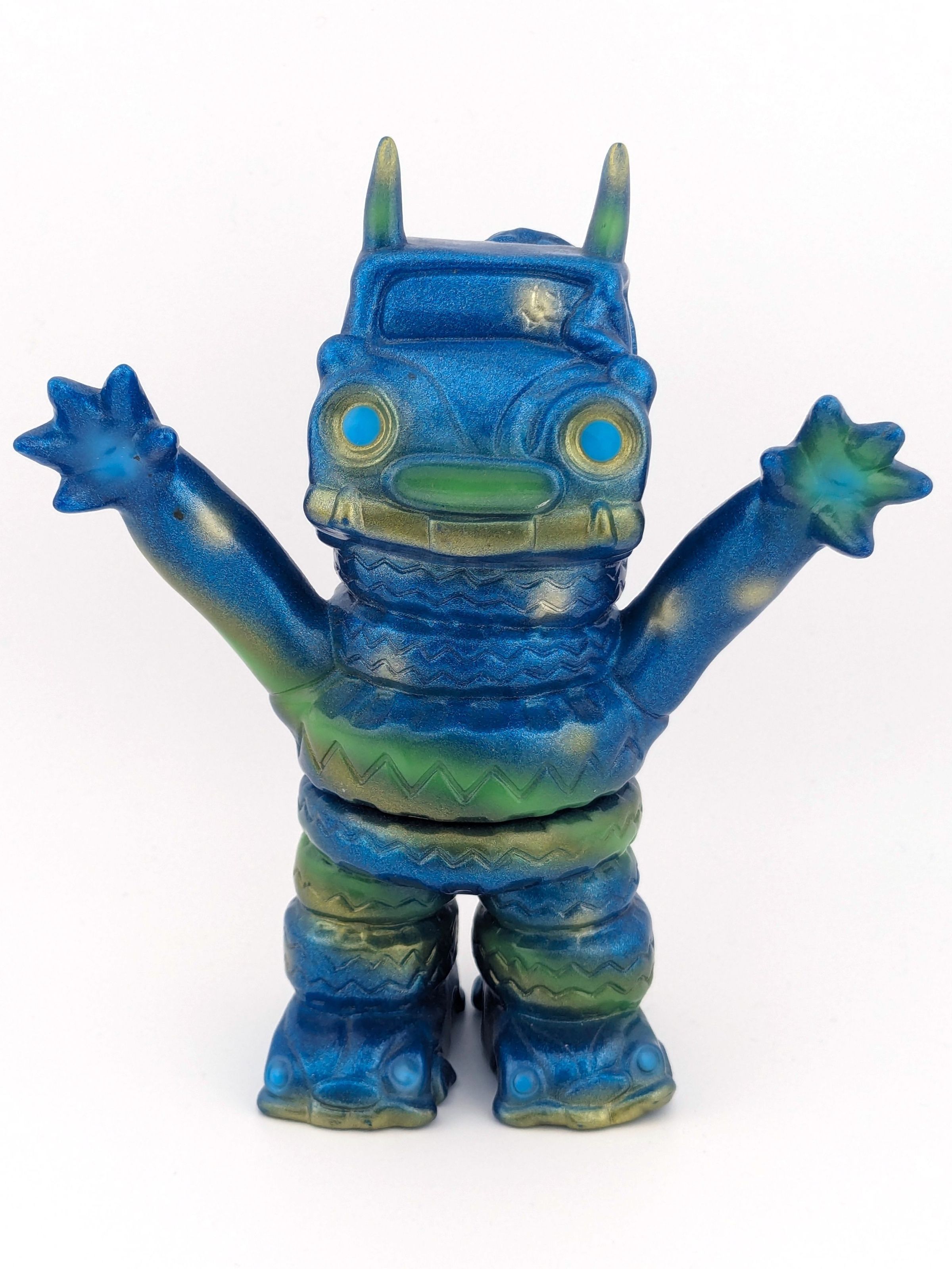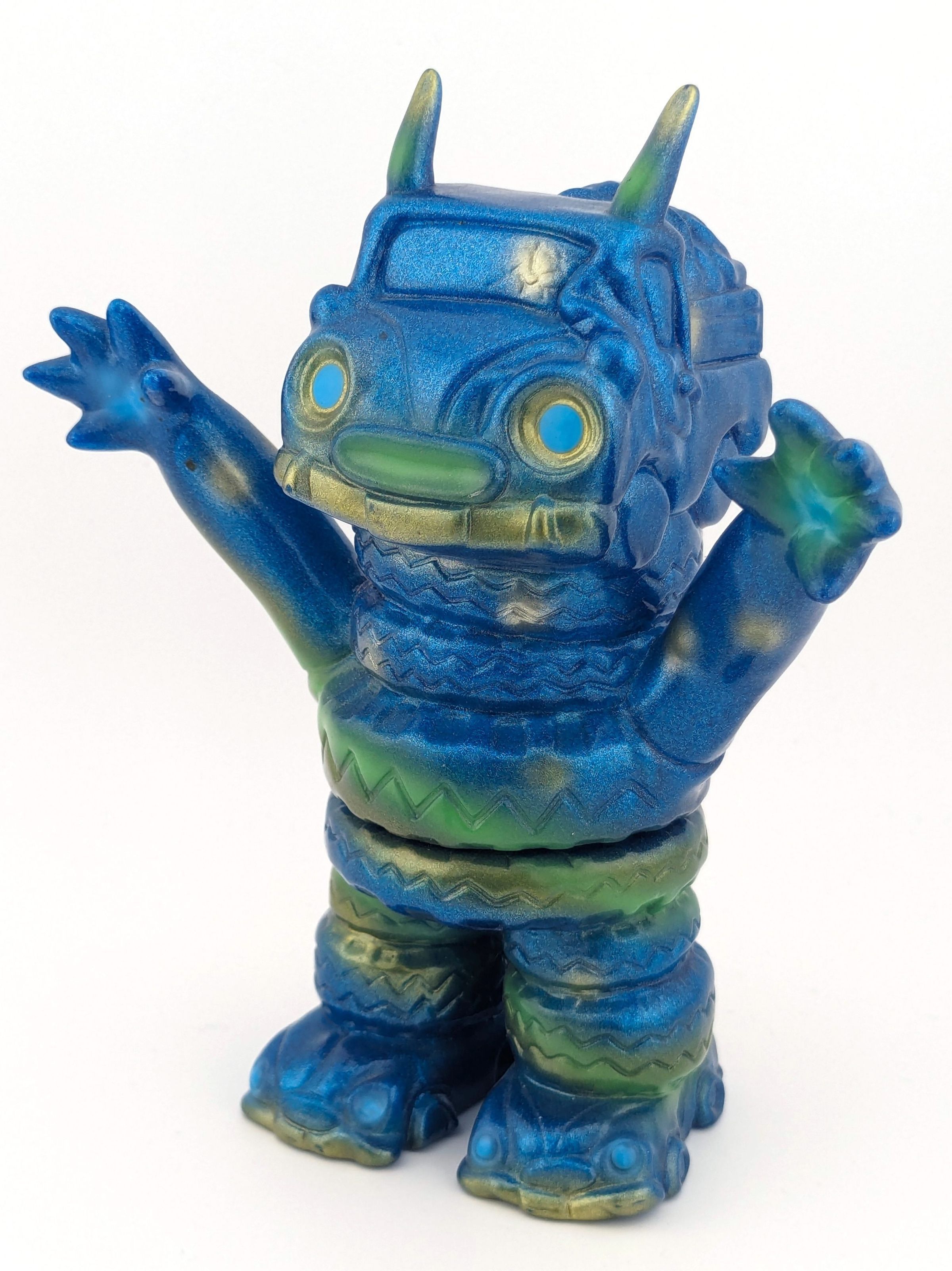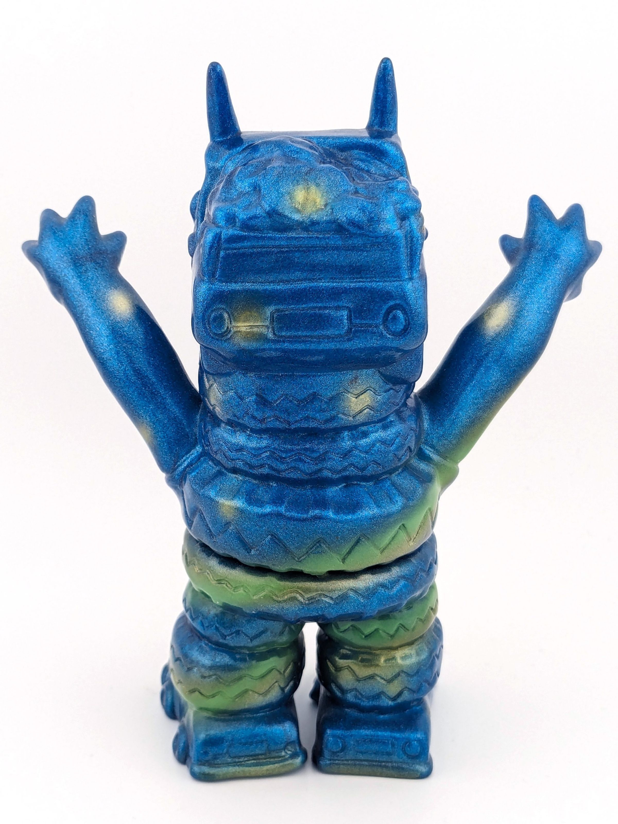 Blue lame vinyl with metallic green, blue, and gold paint